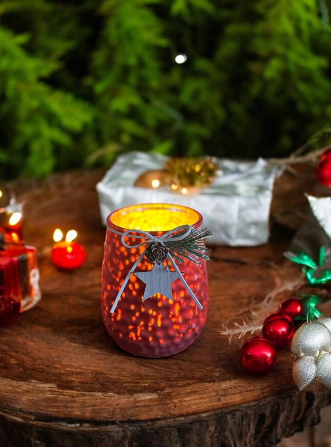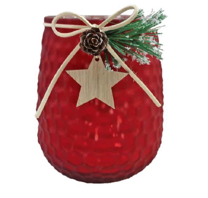 Windlicht Glas rot dekoriert mit Herz Anhänger und Tannzapfen