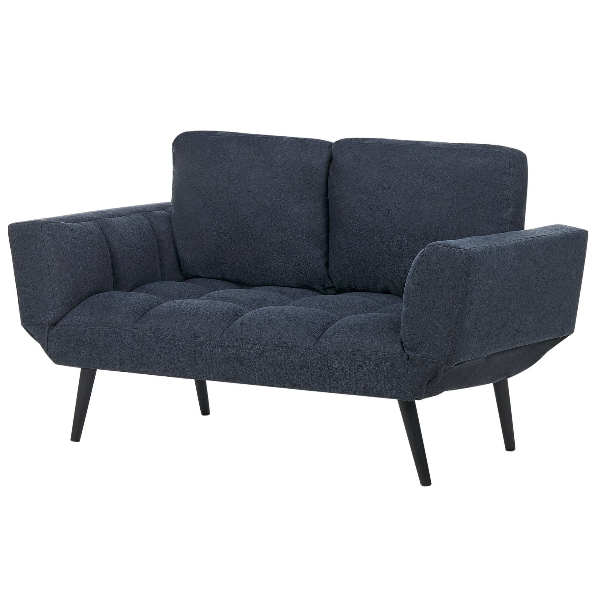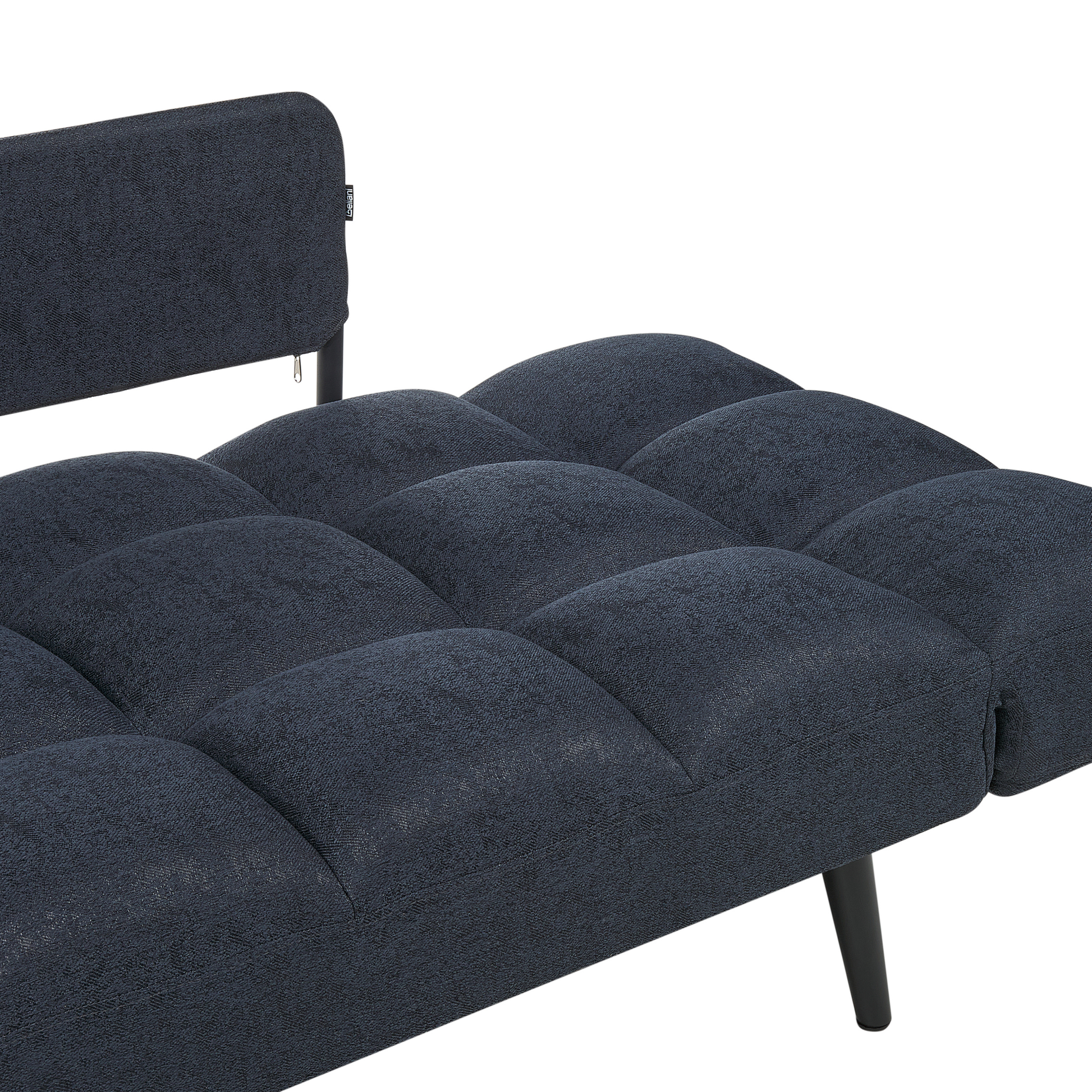 Dieses minimalistische und dennoch optisch ansprechende Sofa besitzt weiche Sitz- und Rückenpolster, die eine einladende Atmosphäre versprühen. Die moderne, dunkle blau-graue Farbe harmoniert wunderbar mit den schwarzen Füssen und macht diesen 2-Sitzer zum idealen Möbelstück für Ihr Wohn- oder Gästezimmer. Mit nur wenigen Handgriffen lässt sich die Couch in ein komfortables Bett umwandeln – perfekt für Übernachtungsgäste. Material: Polyester. Zusätzliches Material: Metall, Eukalyptus. Material Zusammensetzung: 100% Polyester Gewicht: 30 Kapazität: 2 Personen Montage: Teilweise montiert Holzart: Eucalyptus Globulus Holzursprung: China Kissen Abmessungen: 48x60x20 Beine Höhe: 24 Polsterstärke: 12 Sitzhöhe: 40 Schlafende Oberfläche: 75x183 Das Angebot beinhaltet: 1 x Sofa Sitzfläche: 120x50 Höhe: 90 zusätzliche Information: Die ausklappbaren Armlehnen können auch als bewegliche Kopfstütze dienen. Das Sitzen auf den Armlehnen wird nicht empfohlen., Die Beine befinden sich in einer praktischen Tasche unter dem Sitz. Breite: 158/178/183 Tiefe: 75 Art: Schlafsofa Stil: Retro Allgemeine Farbe: Blau Schatten: Dunkelblau Hauptmaterial: Polyester Füllmaterial: Schaumstoff Arm Stil: Verstellbar