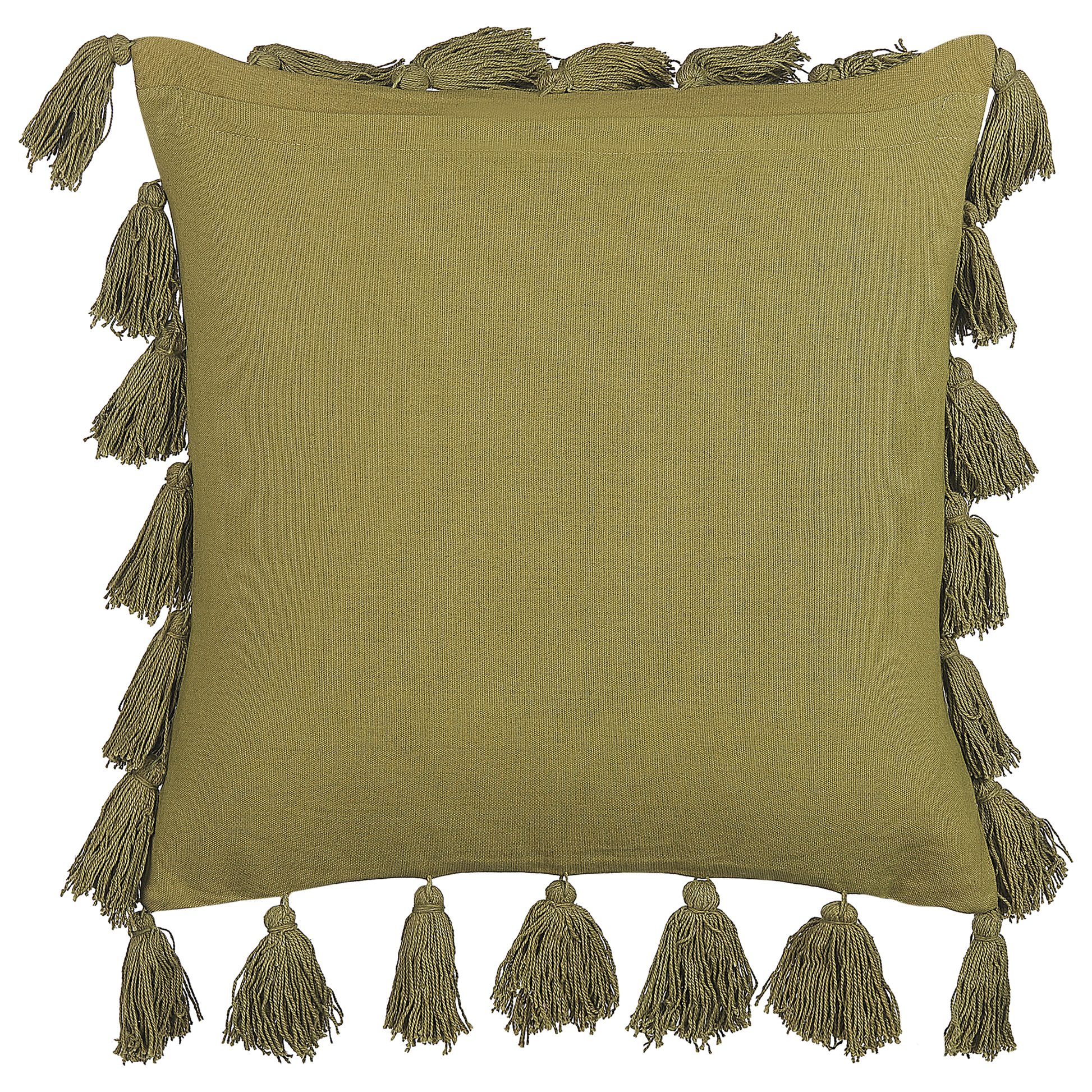 Vervollständigen Sie den Look Ihres Sofas, Sessels oder Bettes mit einem einfachen, dennoch dekorativen Kissen. Der olivgrüne Kissenbezug besteht aus hochwertigen Baumwollfasern, die sich angenehm weich anfühlen. Dank den Quasten erhält das Stoffkissen einen sehr natürlichen Look. So wird sich das Modell bestimmt in jeder Boho-Einrichtung beweisen. Ausserdem ist das Sofakissen mit einer dicken Füllung versehen, die es zu einem perfekten Begleiter für ein Mittagsschläfchen macht. Der versteckte Reissverschluss erleichtert die Pflege der Kissenhülle. Material: Baumwolle. Material Zusammensetzung: 100% Baumwolle Montage: Benötigt keine Montage Das Angebot beinhaltet: 1 x Zierkissen Höhe: 10 zusätzliche Information: Das Kissen ist vakuumverpackt. Nehmen Sie Ihr Kissen aus der Verpackung heraus und lassen Sie es 24 Stunden lang liegen, bis es seine volle Dichte erreicht. Gestalten: Quadratisch Breite: 45 Tiefe: 45 Art: Dekokissen Stil: Boho Allgemeine Farbe: Grün Schatten: Olivgrün Muster: Kein Muster Hauptmaterial: Baumwolle Füllmaterial: Polyester