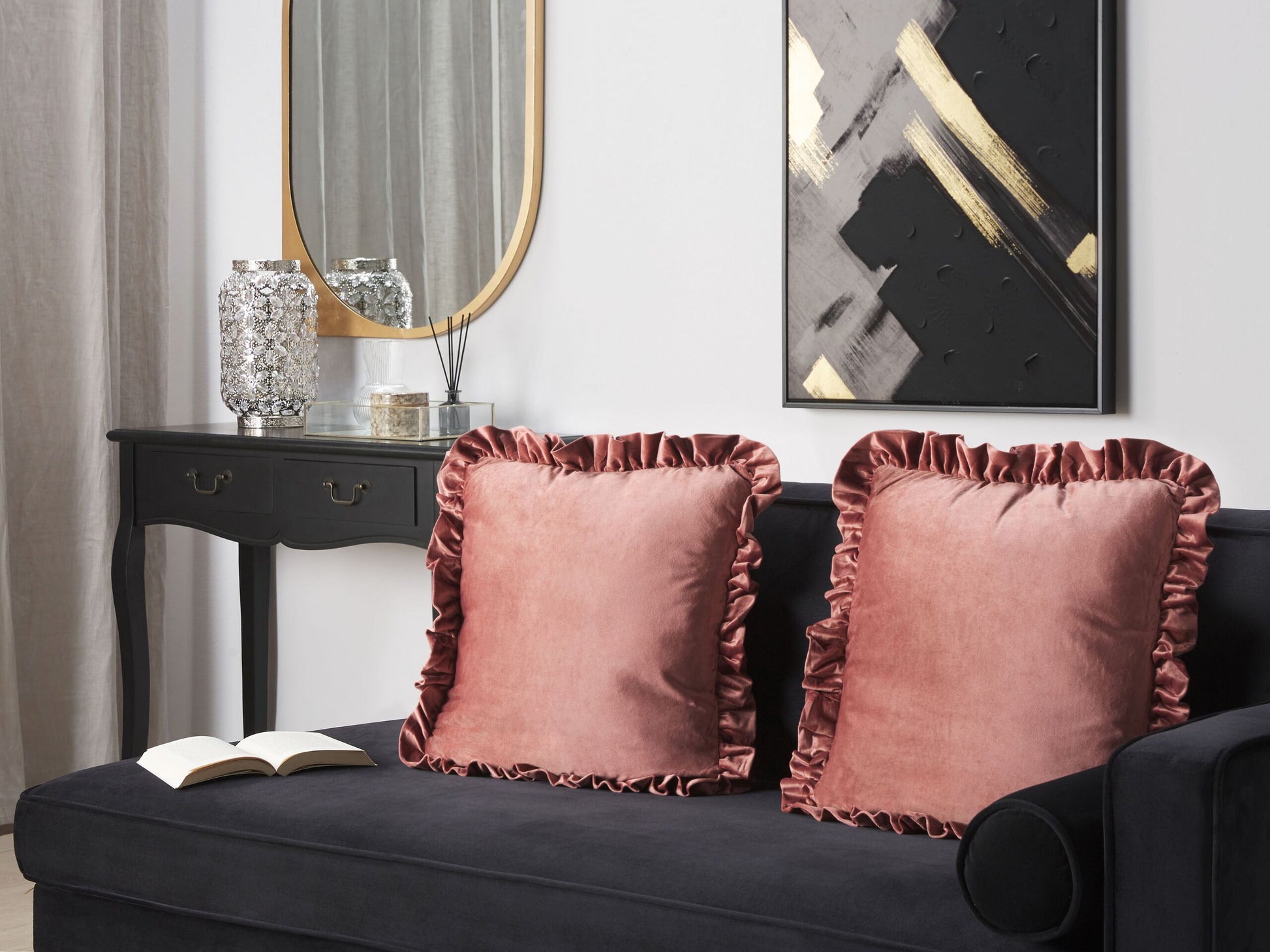 Bringen Sie mit diesem wunderschönen Kissenset einen Hauch von Vintage-Glamour in Ihren Wohnraum. Die Bezüge sind aus seidig weichem Polyester-Samt gefertigt, der das Rosa besonders gut zur Geltung bringt. Die Hüllen sind mit Rüschen verziert, die vom Retro-Stil inspiriert sind. Ausserdem verfügen sie über einen Reissverschluss, der die Reinigung erleichtert. Mit flauschigem Polyester gefüllt, bieten die Kissen einen hohen Komfort. Material: Samtstoff. Material Zusammensetzung: 100% Polyester Montage: Benötigt keine Montage Das Angebot beinhaltet: 2 x Zierkissen Höhe: 7 zusätzliche Information: Das Kissen ist vakuumverpackt. Nehmen Sie Ihr Kissen aus der Verpackung heraus und lassen Sie es 24 Stunden lang liegen, bis es seine volle Dichte erreicht., Bitte beachten Sie, dass Samtstoff unter verschiedenen Lichtverhältnissen eine andere Optik haben kann – das Material schimmert bei Tageslicht stärker und wirkt bei künstlicher Beleuchtung in Innenräumen eher gedämpft. Aufgrund der glatten, hochdichten Struktur des Gewebes kann sein Farbton auch variieren, wenn man mit der Hand in verschiedene Richtungen und Winkel über den Stoff fährt. Um den Farbton auszugleichen und Druckstellen zu vermeiden, sollte der Webstoff sanft mit einer offenen Handfläche in eine Richtung gestrichen, mit einem feuchten Tuch abgewischt oder einem Dampfbügeleisen gebügelt werden. Gestalten: Quadratisch Breite: 42 Tiefe: 42 Art: Kissen 2er Set Stil: Glamourös Allgemeine Farbe: Rosa Muster: Kein Muster Hauptmaterial: Samtstoff Füllmaterial: Polyester