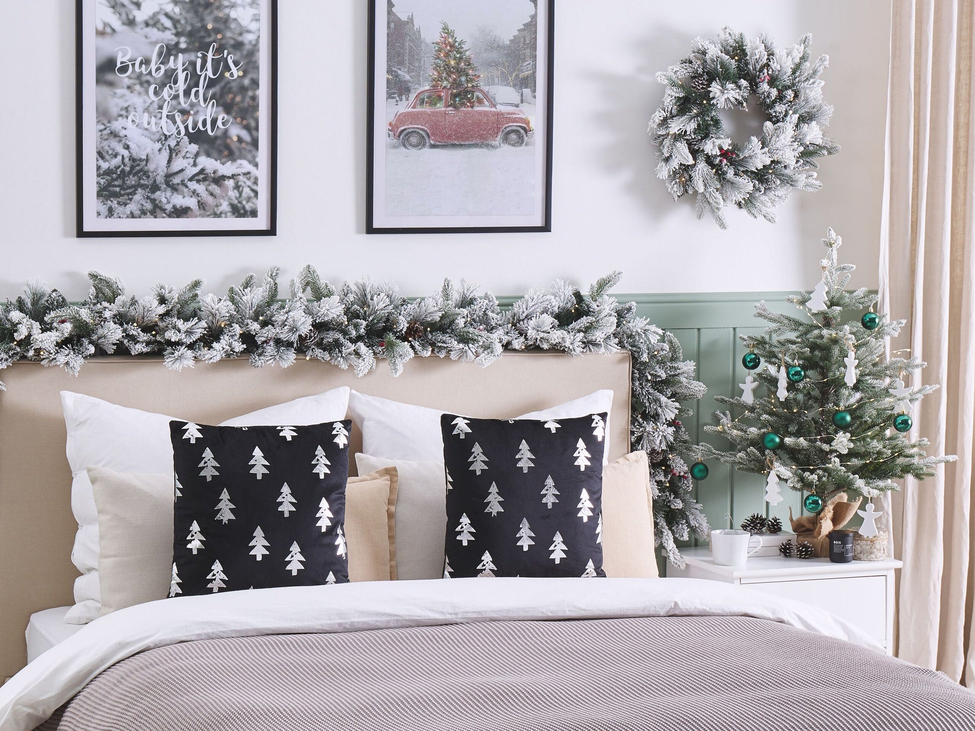 Weihnachten ist für uns alle eine besondere Zeit. Deshalb schenken wir den Details so viel Aufmerksamkeit, wenn es darum geht, unser Zuhause mit weihnachtlichen Dekorationsartikeln zu schmücken. Dieses Dekokissen-Set fügt sich dank der klassischen Farbpalette nahtlos in jede Umgebung ein. Jedes der Kissen ist mit einem schönen, silberfarbenen Weihnachtsbaummuster mit Foliendruck versehen, das durch den schwarzen Hintergrund perfekt zur Geltung kommt. Die Kissen verfügen über eine weiche Polyesterfüllung für höchsten Komfort und einen Reissverschluss zur einfachen Reinigung. Material: Samtstoff. Material Zusammensetzung: 100% Polyester Montage: Benötigt keine Montage Das Angebot beinhaltet: 2 x Zierkissen Höhe: 10 zusätzliche Information: Das Kissen ist vakuumverpackt. Nehmen Sie Ihr Kissen aus der Verpackung heraus und lassen Sie es 24 Stunden lang liegen, bis es seine volle Dichte erreicht., Bitte beachten Sie, dass Samtstoff unter verschiedenen Lichtverhältnissen eine andere Optik haben kann – das Material schimmert bei Tageslicht stärker und wirkt bei künstlicher Beleuchtung in Innenräumen eher gedämpft. Aufgrund der glatten, hochdichten Struktur des Gewebes kann sein Farbton auch variieren, wenn man mit der Hand in verschiedene Richtungen und Winkel über den Stoff fährt. Um den Farbton auszugleichen und Druckstellen zu vermeiden, sollte der Webstoff sanft mit einer offenen Handfläche in eine Richtung gestrichen, mit einem feuchten Tuch abgewischt oder einem Dampfbügeleisen gebügelt werden. Gestalten: Quadratisch Breite: 45 Tiefe: 45 Art: Dekokissen 2er Set Stil: Modern Allgemeine Farbe: Schwarz Muster: Weihnachtsmotiv Hauptmaterial: Samtstoff Füllmaterial: Polyester