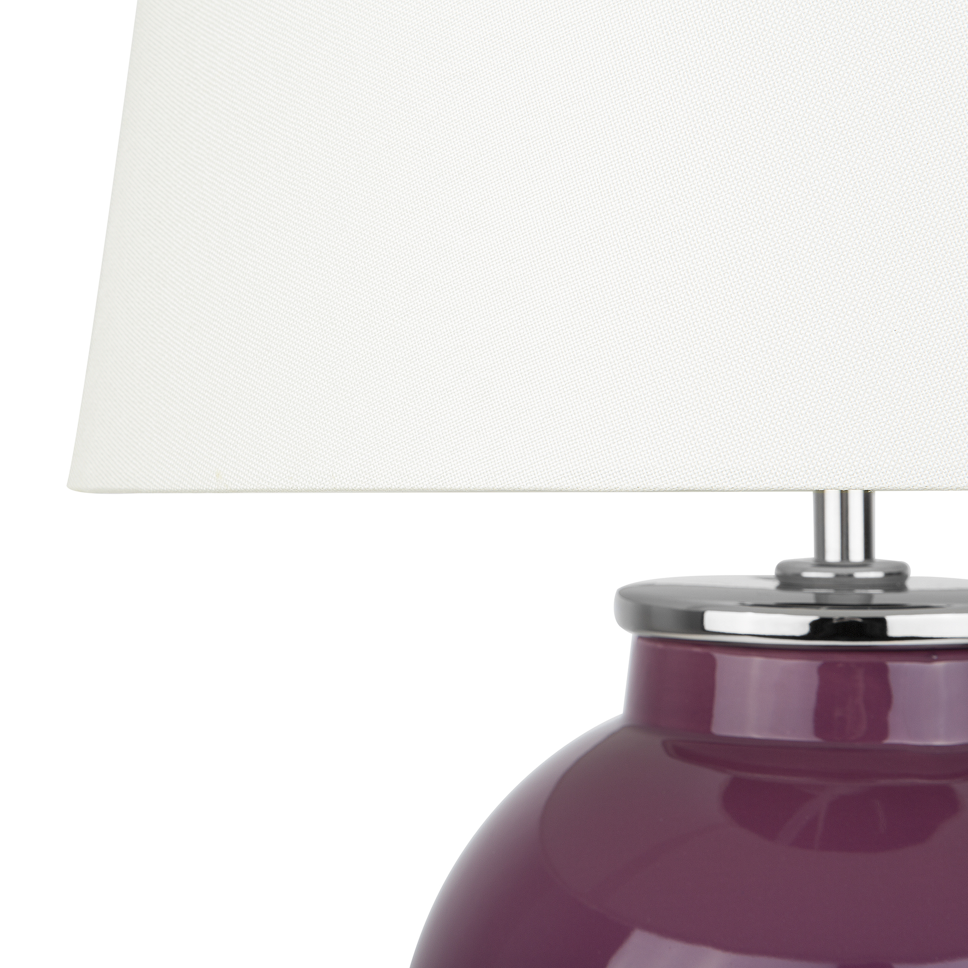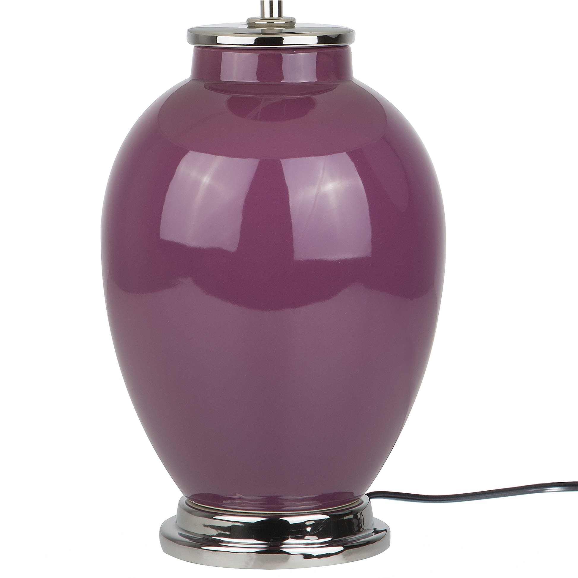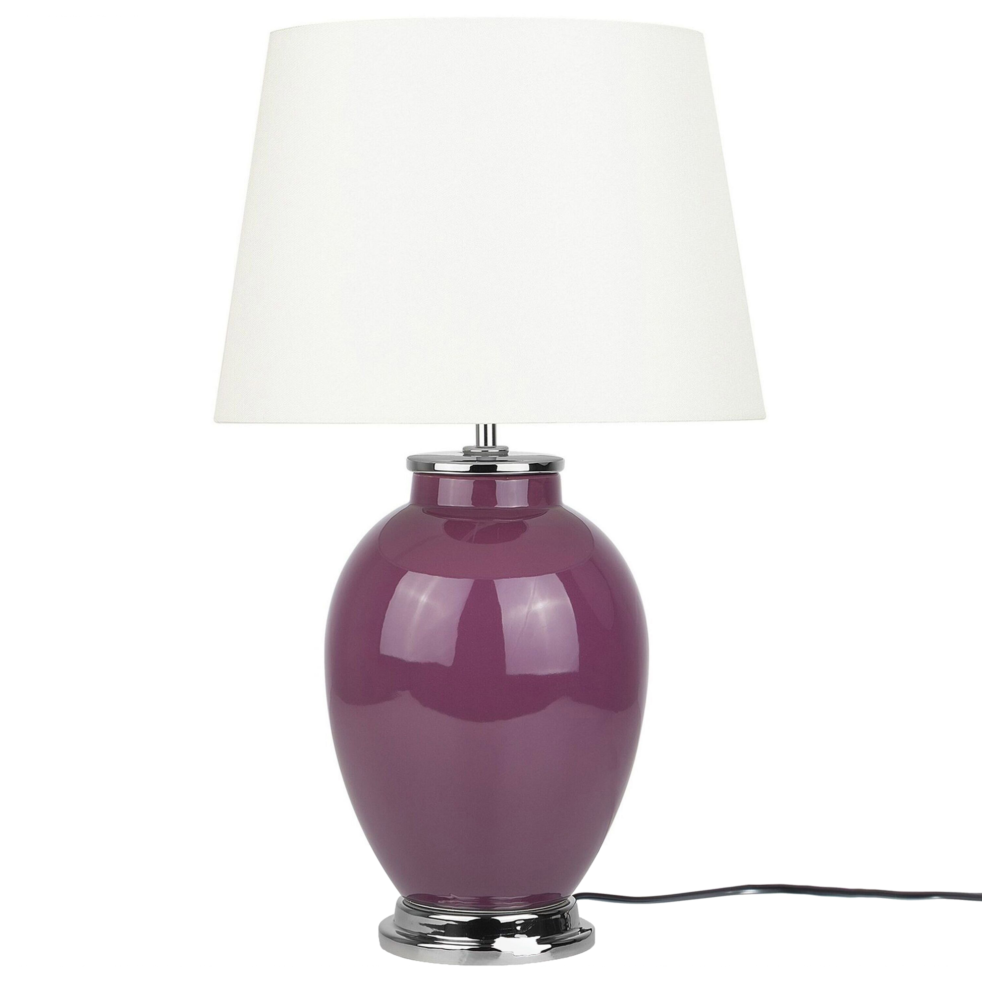 Die charmante, dekorative Tischlampe strahlt behagliche Gemütlichkeit aus und lässt sich dank ihrer klassischen Eleganz hervorragend mit allen Einrichtungsstilen kombinieren. Der geschwungene, glänzende Lampenfuss ist aus Keramik gefertigt, und sein Farbton in dunklem Lila bildet einen wunderschönen Kontrast zu dem hellen, cremefarbenen Lampenschirm aus Stoff. Der schmale Goldrand unterstreicht die elegante Ausstrahlung. Das schwarze PVC Kabel ist mit einem Schalter versehen. Material: Keramik. Zusätzliches Material: Poly-Baumwolle. Material Zusammensetzung: 100% Leinen Gewicht: 3.5 Montage: Teilweise montiert Das Angebot beinhaltet: 1 x Tischleuchte, Nicht im Lieferumfang enthalten: Leuchtmittel Höhe: 56 zusätzliche Information: Diese Leuchte ist geeignet für Leuchtmittel der Energieklassen A bis G auf einer Skala von A (sehr effizient) bis G (weniger effizient). Geeignet für: LED Leuchtmittel, Eco-Halogen Leuchtmittel, Energiesparleuchtmittel., Die Stromkabel dürfen nur von einem qualifizierten Elektriker angepasst werden. Breite: 33 Tiefe: 33 Art: Tischleuchte Stil: Retro Allgemeine Farbe: Violett Schatten: Purpur Hauptmaterial: Keramik Fassung: Max. 60 W IP Protection Code: IP 20