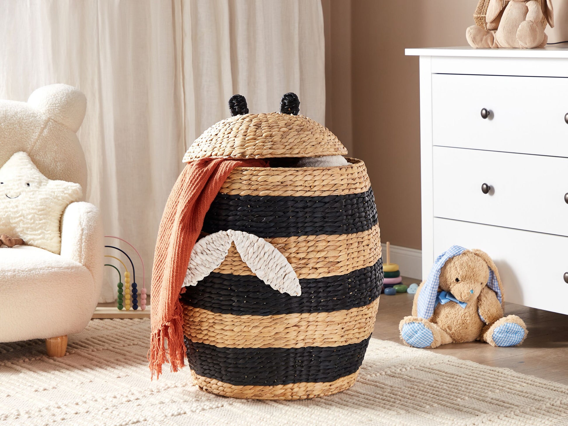 Dieser Korb für das Kinderzimmer macht das Aufräumen zum Vergnügen. Dieses handgefertigte Meisterwerk bietet nicht nur eine Aufbewahrungslösung, sondern auch jede Menge Abenteuer. Sorgfältig aus Wasserhyazinthe gefertigt, verleiht das bienenförmige Design jedem Raum eine verspielte Note. Der mitgelieferte Deckel sorgt für einen aufgeräumten Bienenstock, in dem die Kleinen ihre Spielsachen und Schätze verstauen können. Mit dieser umweltfreundlichen Kreation wird Ordnung zu einem lustigen Ausflug, bei dem sich Stil und Funktionalität perfekt mit der Freude an fantasievoller Aufbewahrung verbinden.  Material: Wasserhyazinthe. Zusätzliches Material: Eisen.  Gewicht: 4 Montage: Benötigt keine Montage Gesamtabmessungen: 48x48x70 Das Angebot beinhaltet: 1 x Korb Höhe: 70 zusätzliche Information: Da bei der Herstellung natürliche Materialien verwendet werden, können kleine Farb-, Form-, bzw. Grössendifferenzen auftreten. Diese Unterschiede stellen jedoch keinen Produktfehler dar., Bei Artikeln aus Wasserhyazinthe kann zu einer Faltenbildung kommen, die durch einen natürlichen Vorgang entsteht. Diese Falten sind Echtheitsbeweise und keine zur Reklamation berechtigende Fehler. Gestalten: Tier Breite: 48 Tiefe: 48 Art: Kinder Aufbewahrungskorb Stil: Boho Allgemeine Farbe: Naturfarben Hauptmaterial: Wasserhyazinthe
