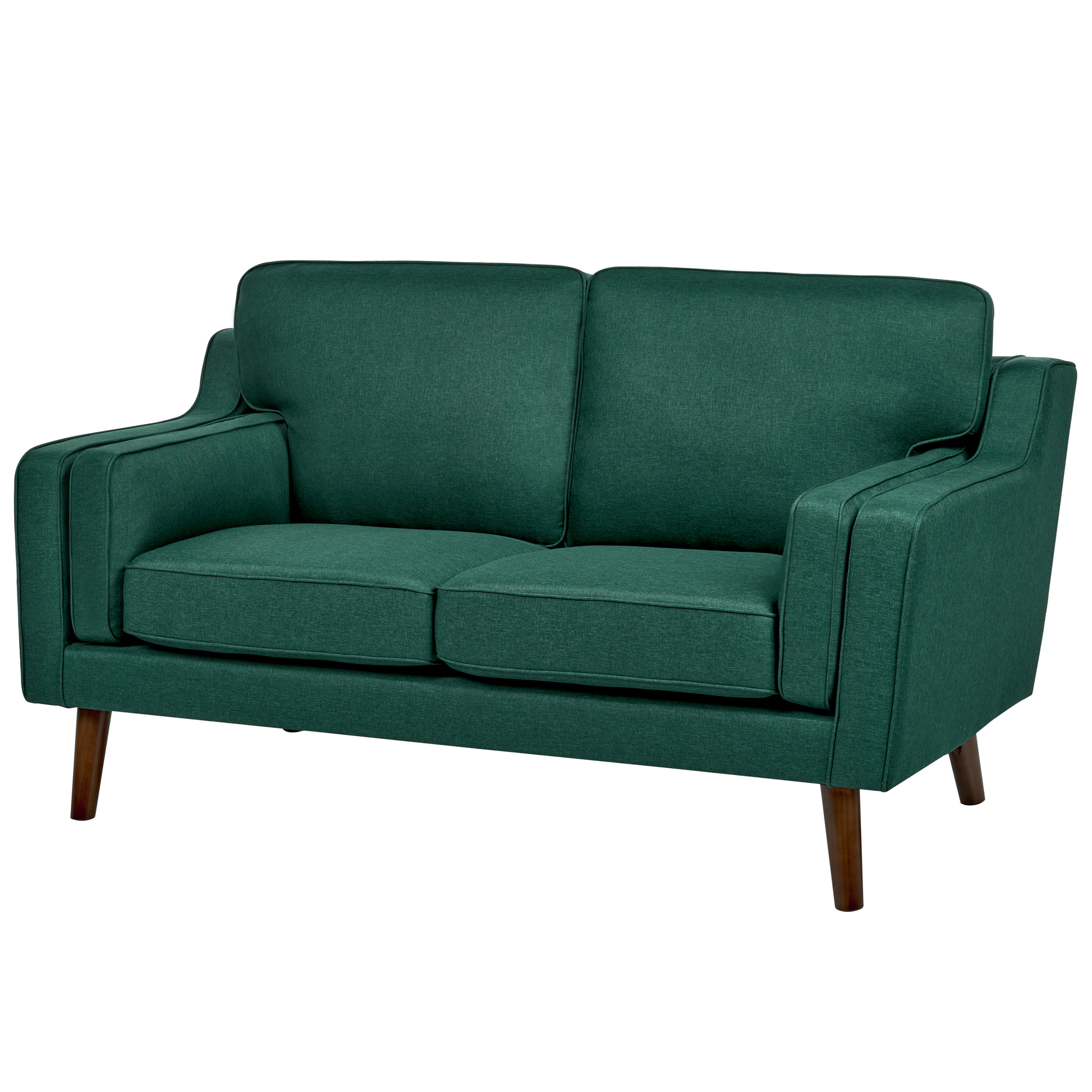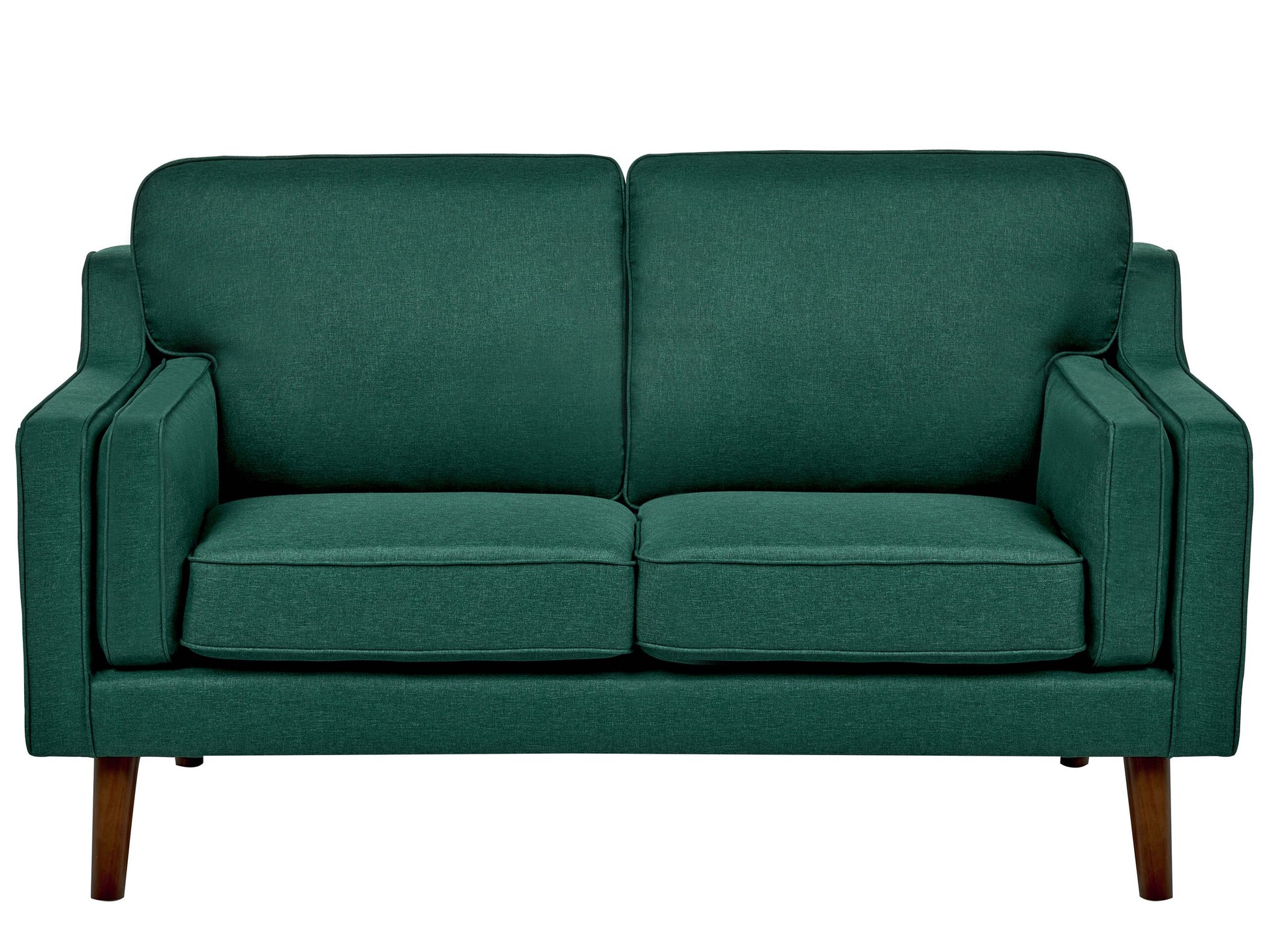 Ein elegantes Sofa, das komplett mit einem hochwertigen Stoff bezogen ist, der sich angenehm anfühlt. Die dick gepolsterten Kissen und die Doppel-Armlehnen garantieren ein angenehmes Sitzgefühl. Die schrägen Holzbeine garantieren nicht nur einen stabilen Stand, sie unterstreichen auch das Mid-Century-Design des Polstersofas. Das Modell lässt sich gut mit dem passenden Sofa aus derselben Kollektion kombinieren, kann aber auch als Teil eines eklektischen Arrangements mit verschiedenen Sesseln und Sofas fungieren.  Material: Polyester. Zusätzliches Material: Eichenholz, Eukalyptus.  Material Zusammensetzung: 100% Polyester Gewicht: 35 Kapazität: 2 Personen Montage: Nicht montiert Holzart: Quercus mongolica Holzursprung: China Kissen Abmessungen: 63x46 Beine Höhe: 18 Polsterstärke: 11 Sitzhöhe: 39 Das Angebot beinhaltet: 1 x Zweisitzer Sitzfläche: 104x58 Höhe: 85 zusätzliche Information: Die Beine befinden sich in einer praktischen Tasche unter dem Sitz. Breite: 150 Tiefe: 83 Art: 2 Sitzer Sofa Stil: Retro Allgemeine Farbe: Grün Schatten: Dunkelgrün Muster: Ohne Muster Hauptmaterial: Polyester Füllmaterial: Schaumstoff Arm Stil: Gerade