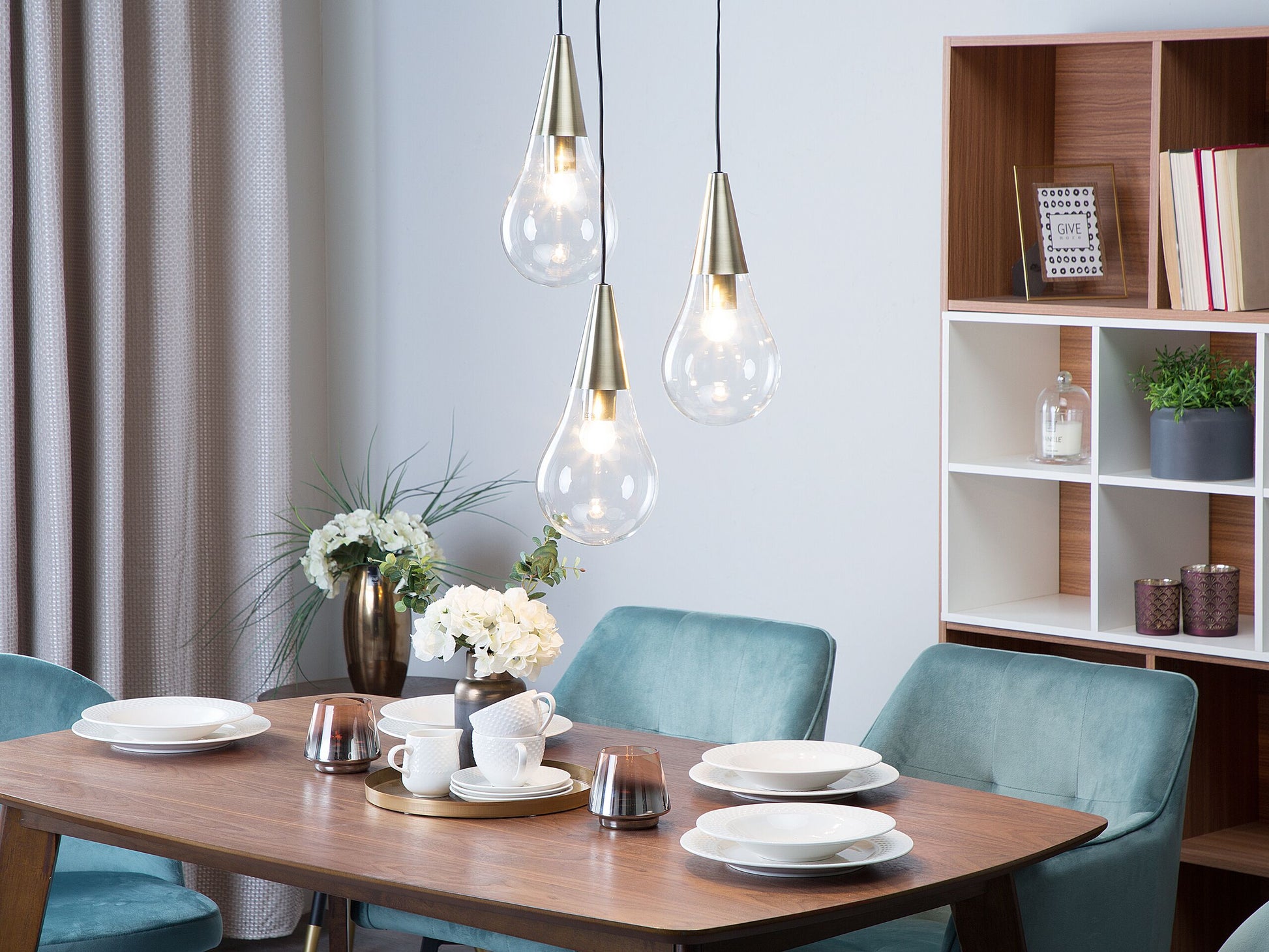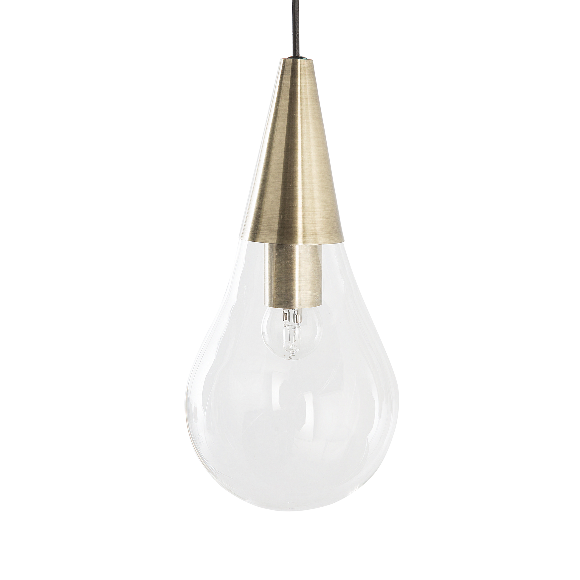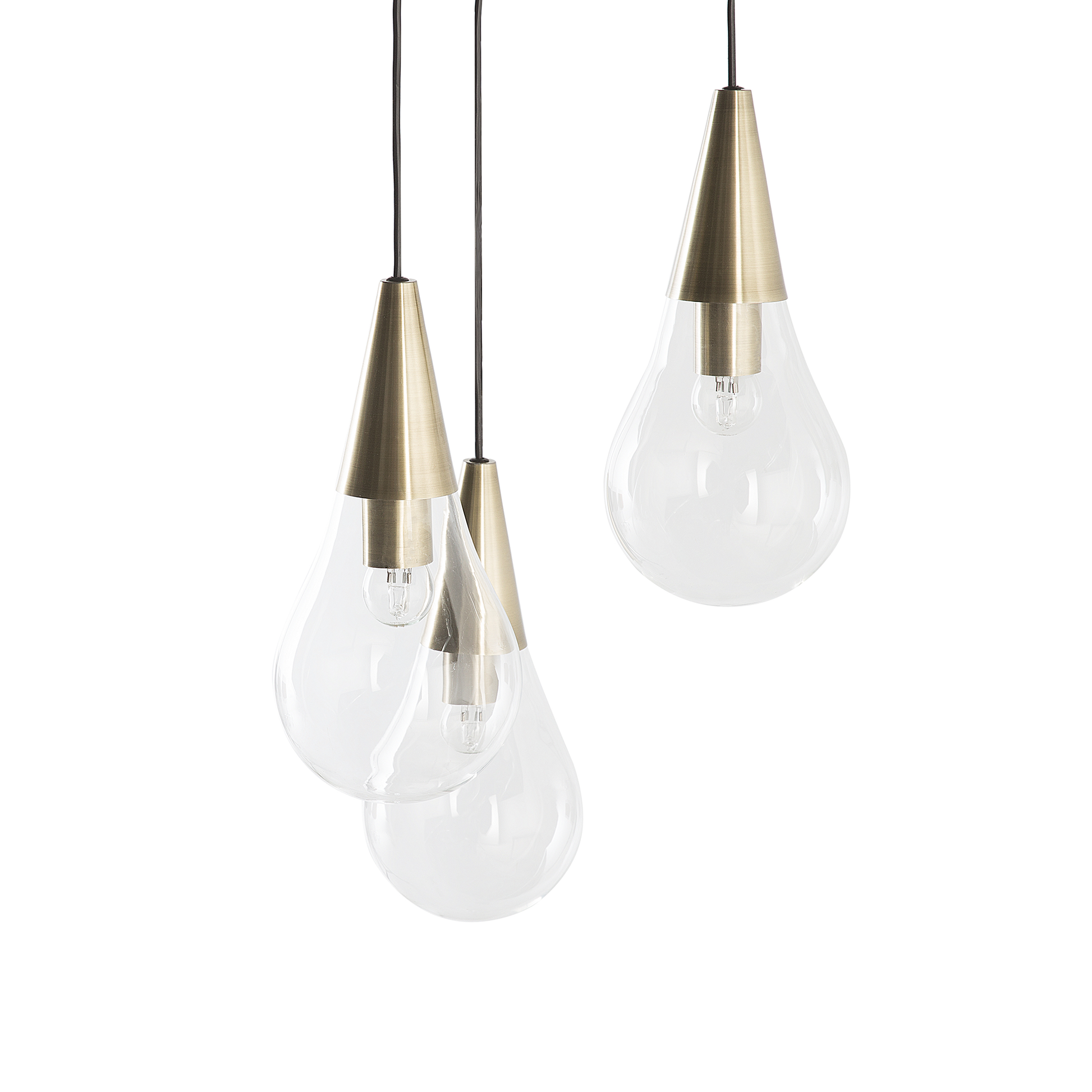 Das Zusammenspiel von Formen, Farben und Materialien resultiert hier in einer stilvollen Hängeleuchte, in die man sich direkt verlieben kann. Wie drei riesige Tropfen hängen die einzelnen Leuchtelemente leicht höhenversetzt von der Decke herab. Die Lampenschirme aus klarem, transparentem Glas und die Spitzen aus messingfarbenem Metall sorgen für eine einzigartige, strahlende Beleuchtung.   Material: Glas. Zusätzliches Material: Metall, PVC.  Gewicht: 1 Montage: Erfordert Installation und Montage Das Angebot beinhaltet: 1 x Hängeleuchte, Nicht im Lieferumfang enthalten: Leuchtmittel Höhe: 118 zusätzliche Information: Diese Leuchte ist geeignet für Leuchtmittel der Energieklassen A bis G auf einer Skala von A (sehr effizient) bis G (weniger effizient). Geeignet für: LED Leuchtmittel, Eco-Halogen Leuchtmittel, Energiesparleuchtmittel., Die Stromkabel dürfen nur von einem qualifizierten Elektriker angepasst werden. Breite: 30 Tiefe: 30 Art: Hängelampe Stil: Glamourös Allgemeine Farbe: Messing Hauptmaterial: Glas Fassung: 7 W IP Protection Code: IP 20