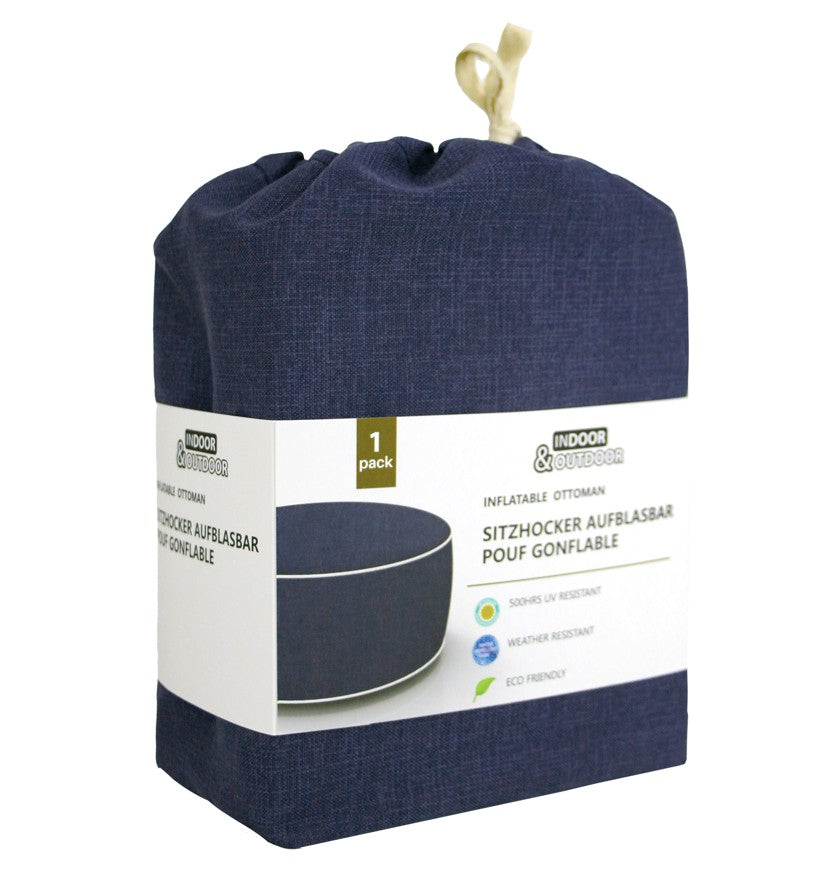Questo prodotto è un pouf con rivestimento in tessuto 100% poliestere e cerniera. Il pouf ha una capacità di carico di 140 kg e può essere utilizzato sia all'interno che all'esterno. Il pouf è dotato di una normale valvola per il gonfiaggio.