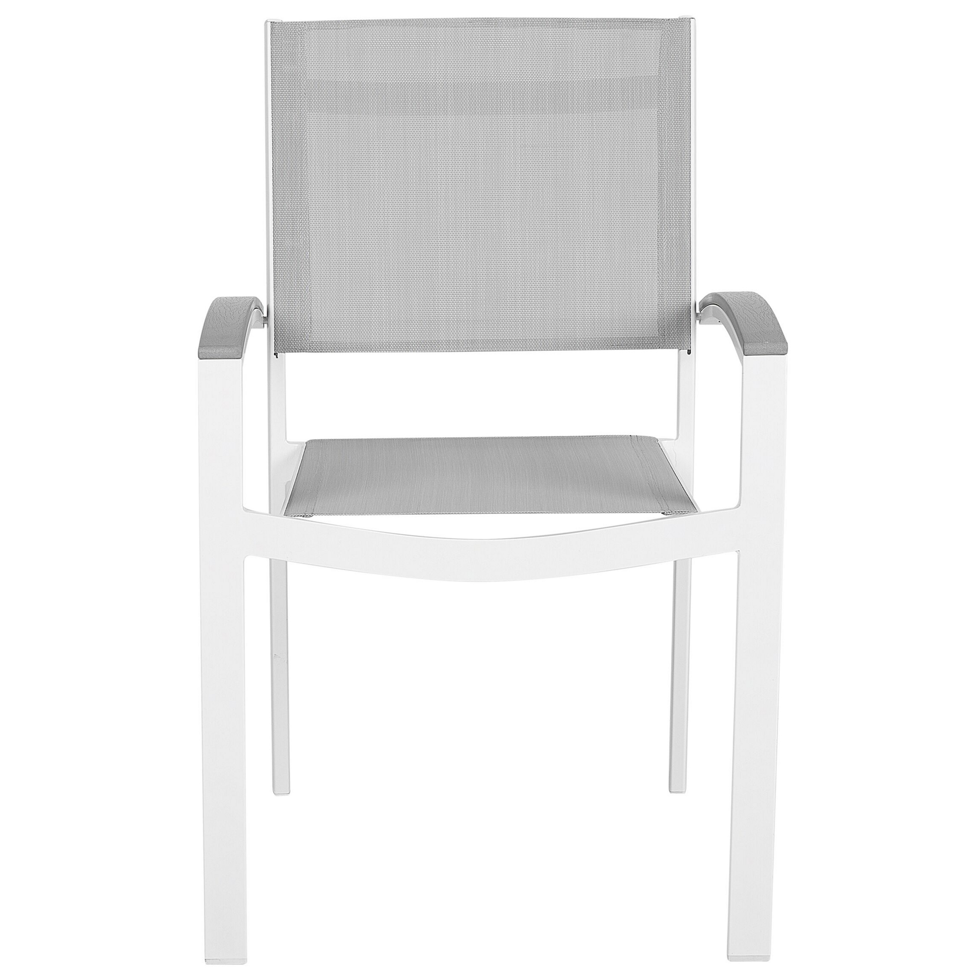 Descrizione: Das robuste, weisse Gestell der Stühle besteht aus rostresistenten Aluminium und einer Bespannung aus robustem, grauem Polyester. Die Sperrholz-Fläche auf den Armlehnen ist nicht nur ein eleganter Klou, sondern schützt auch Ihre Haut vor dem kalten Metall, so dass das Sitzen noch angenehmer wird. Kombinieren Sie das Set mit einem Tisch und schaffen Sie einen einladenden Essbereich, damit Sie im Sommer Abends im Garten grillen oder am Morgen frühstücken können. Material: Aluminium. Zusätzliches Material: Polyester, Kunstholz, PVC. Material Zusammensetzung: 90% PVC, 10% Polyester Gewicht: 4 Montage: Benötigt keine Montage Gewichtskapazität: 120 Sitzhöhe: 38 Das Angebot beinhaltet: 4 x Stühle Sitzfläche: 39x47 Höhe: 86 Breite: 46 Tiefe: 50 Art: Gartenstuhl 4er Set Stil: Modern Allgemeine Farbe: Grau Schatten: Hellgrau Hauptmaterial: Aluminium