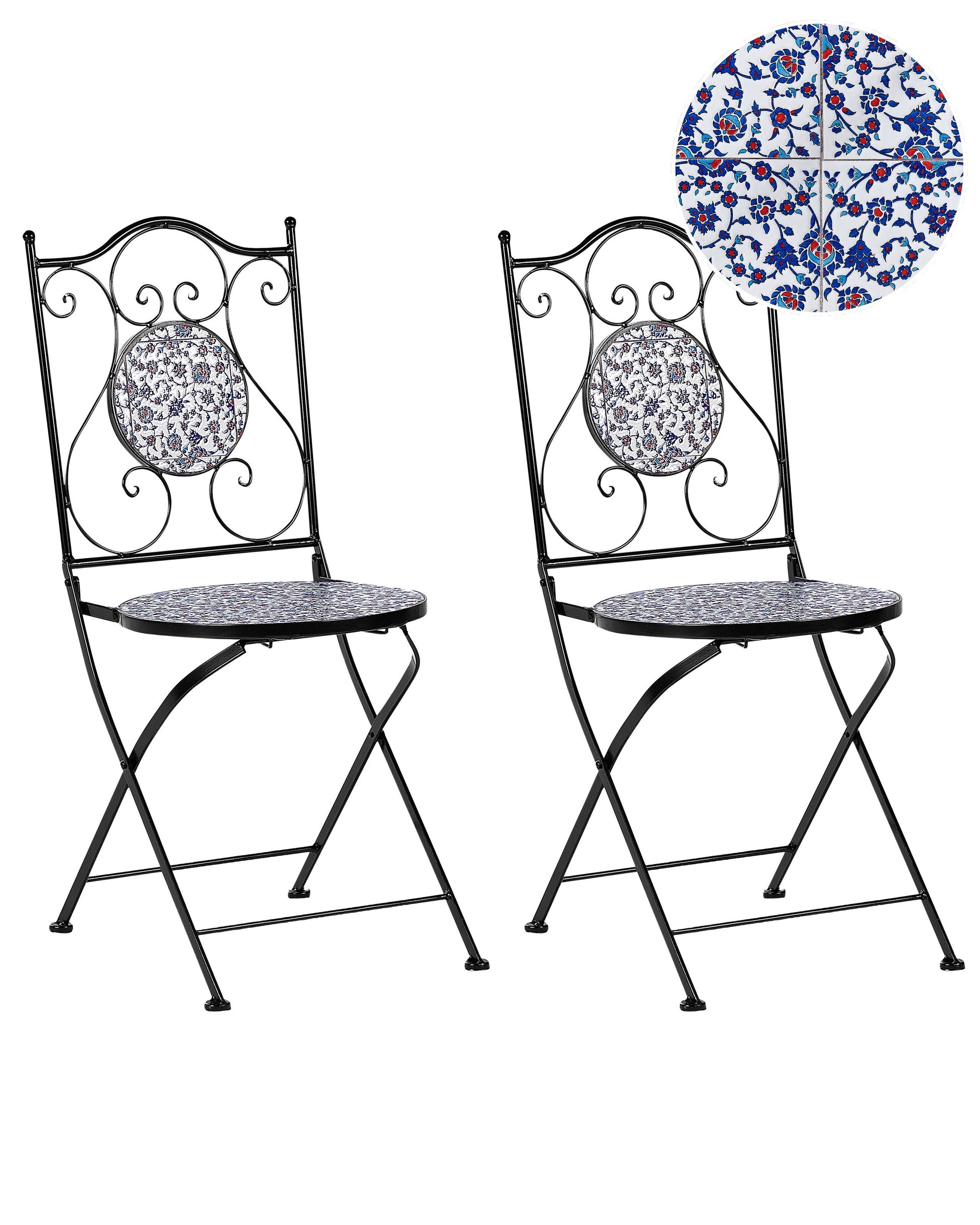 Descrizione: Verleihen Sie Ihrem Balkon oder Ihrer Terrasse mit diesen charmanten Bistrostühlen etwas Vintage-Flair. Sie sind aus robustem Metall gefertigt und mit einem schönen Keramikmosaik verziert, das sowohl Langlebigkeit als auch Eleganz bietet. Die Stühle sind darüber hinaus witterungsbeständig und pflegeleicht - und damit die perfekte Wahl für ein Treffen mit Freunden oder um einfach nur ein erfrischendes Getränk im Sommer zu geniessen. Material: Eisen. Zusätzliches Material: Keramik. Gewicht: 9 Montage: Benötigt keine Montage Gewichtskapazität: 150 Sitzhöhe: 42 Das Angebot beinhaltet: 2 x Stühle Sitzfläche: 38x38 Höhe: 90 Breite: 40 Tiefe: 45 Art: Gartenstuhl 2er Set Stil: Retro Allgemeine Farbe: Schwarz Hauptmaterial: Eisen