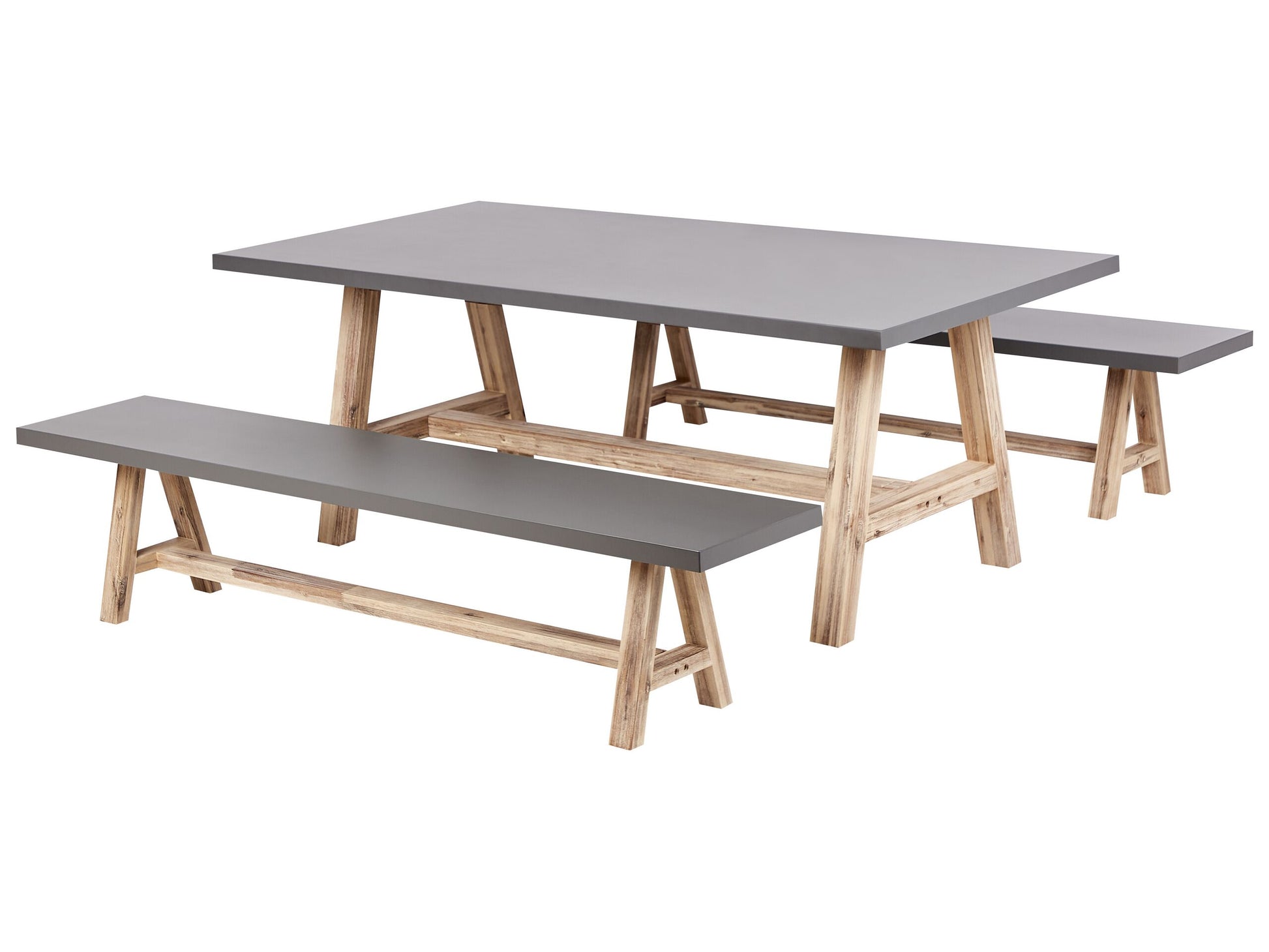 Diese Esstischgruppe für den Garten zeichnet sich durch ein schlichtes, industrielles Design aus, das perfekt zu modernen Aussenbereichen passt. Das Set besteht aus einem robusten Esstisch aus Beton und zwei dazu passenden Bänken, die jeweils auf einem stabilen Sockel aus Akazienholz stehen. Das Set ist wetterbeständig und verbindet die raue Eleganz des Betons mit der natürlichen Wärme des Akazienholzes zu einer stilvollen Lösung für Mahlzeiten und Zusammenkünfte im Freien. Material: Faserzement. Zusätzliches Material: Akazienholz. Gewicht: 128 Kapazität: 6 Personen Montage: Nicht montiert Holzart: Acacia mangium Holzursprung: Vietnam Gesamtabmessungen: 200x100x75 Tischabmessungen: 200x100x75 Bench Dimensionen: 200x40x45 Sitzhöhe: 45 Das Angebot beinhaltet: 1 x Tisch, 2 x Bänke zusätzliche Information: Die Möbel können abhängig von der Luftfeuchtigkeit mit der Zeit Porenlöcher, feine Risse und Unregelmässigkeiten in der Färbung aufweisen, dies liegt in der Natur des Materials und macht den eigentlichen Charme des Möbels aus. Dies hat keinen Einfluss auf die Stabilität, sondern es ist eine reine optische Veränderung., Holz ist ein Naturprodukt. Farb- und Strukturunterschiede, Narben, Falten und sonstige Naturmerkmale sind Echtheitsbeweise und keine zur Reklamation berechtigende Fehler. Art: Tisch mit Bank Stil: Industriell Allgemeine Farbe: Grau Hauptmaterial: Faserzement