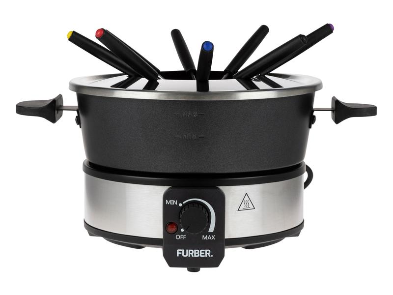 Godetevi ore piacevoli con i vostri cari e specialità culinarie con il set per fonduta "Tasty" di FURBER. La pentola in alluminio pressofuso ha una capacità di 1,8 litri, la temperatura può essere regolata in continuo e grazie alle diverse estremità colorate non si scambiano le forchette. Adesso non vi resta che decidere: fonduta chinoise, fonduta di cioccolato o preferite la classica fonduta di formaggio?
