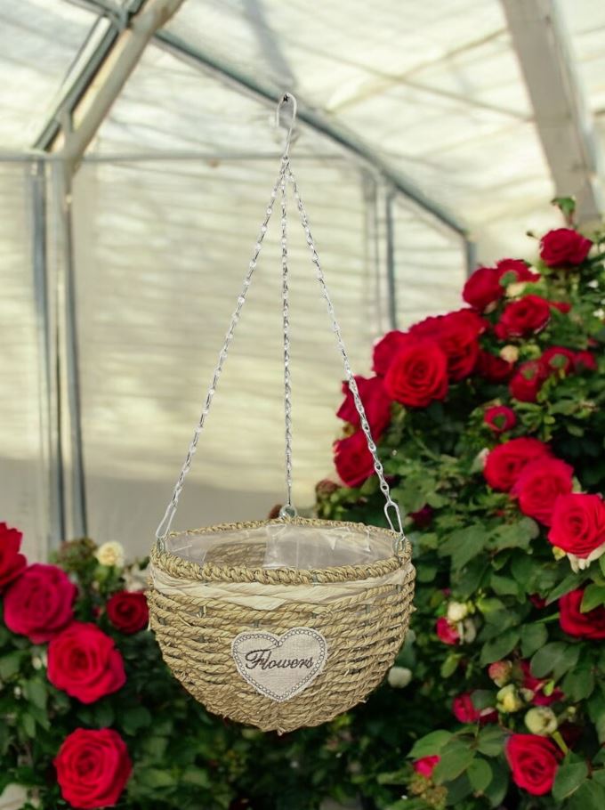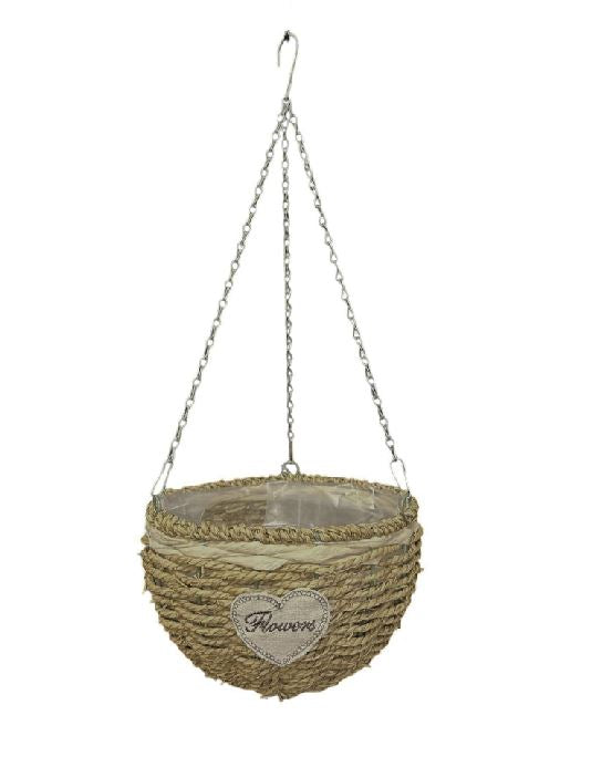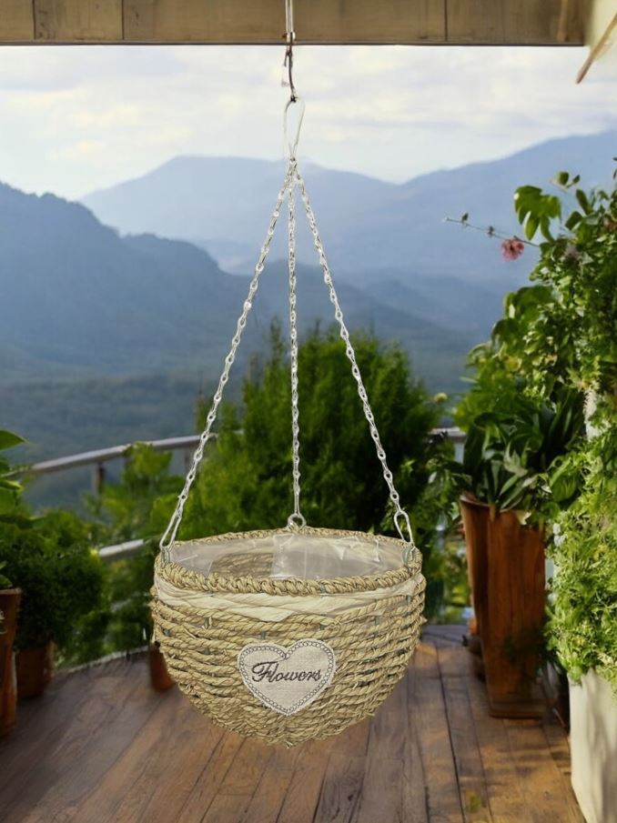 Pflanzkorb rund aus Seegras Geflecht zum Hängen mit Metallrahmen und Kette