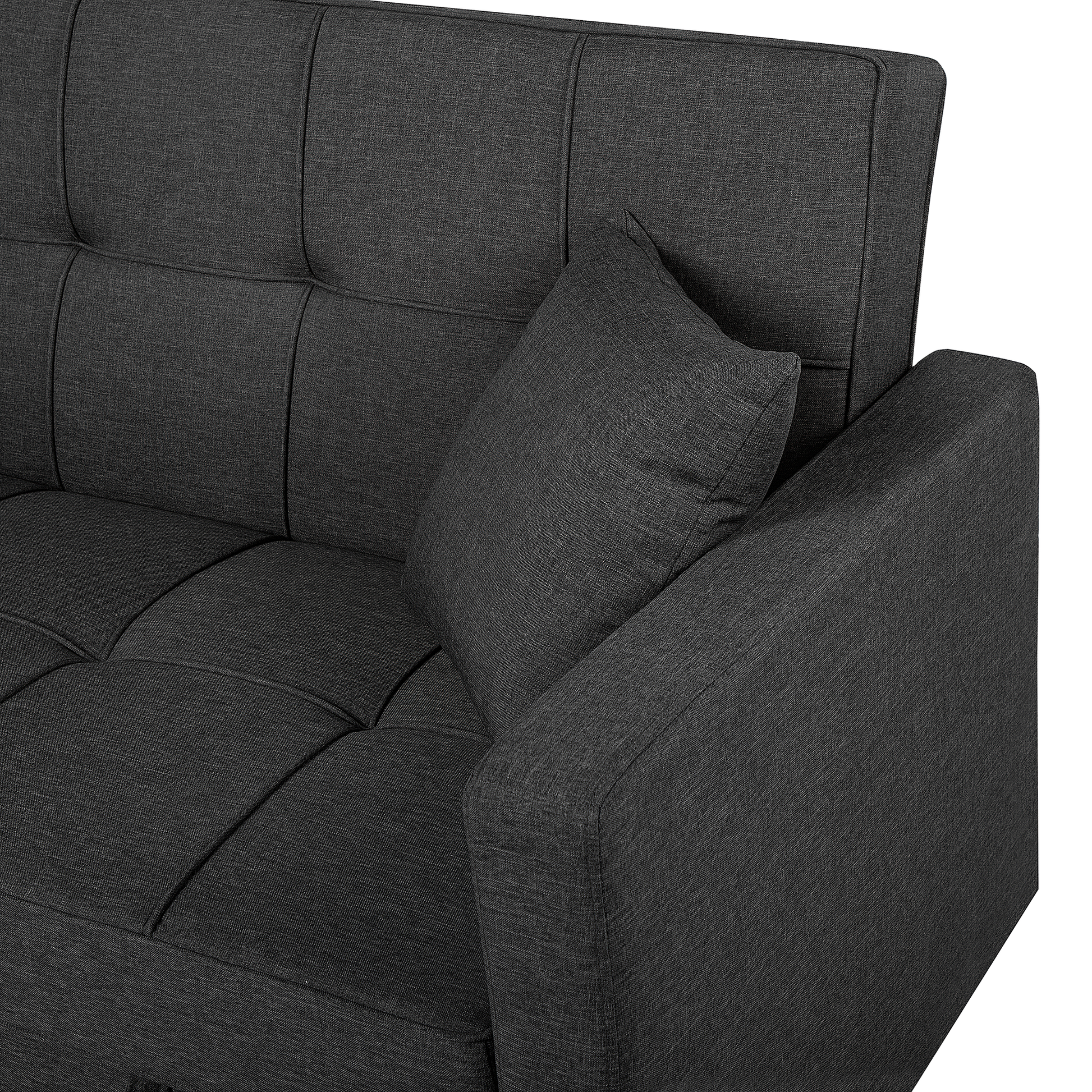 Descrizione: Ihr neuer Lieblingsplatz zum Fernsehen. Neben behaglicher Ausstrahlung punktet das Sofa mit hoher Funktionalität: mit nur wenigen Handgriffen lässt es sich in ein komfortables und angenehm gepolstertes Gästebett verwandeln. Die zusätzlichen Kissen sind mit einem abnehmbaren Bezug versehen, der eine einfache Reinigung ermöglicht, ohne dass man sich Sorgen um Flecken machen muss. Das Polstersofa ist mit einer Quadratsteppung auf der Sitzfläche und Rückenlehne versehen, die dem Sofa zusammen mit den dicken Nähten und den dezenten Kunststoffbeinen einen frischen, modernen Look verleiht. Material: Polyester. Zusätzliches Material: Kunststoff, Eukalyptus. Material Zusammensetzung: 100% Polyester Gewicht: 69 Kapazität: 3 Personen Montage: Nicht montiert Holzart: Eucalyptus Globulus Holzursprung: China Kissen Abmessungen: 45x45 Beine Höhe: 13 Polsterstärke: 18 Sitzhöhe: 43 Schlafende Oberfläche: 181x183 Das Angebot beinhaltet: Nicht im Lieferumfang enthalten: Teppich und Dekoration, 1 x Sofa, 2 x Zierkissen Sitzfläche: 183x60 Höhe: 95 Breite: 207 Tiefe: 87 Art: Schlafsofa Stil: Modern Allgemeine Farbe: Grau Schatten: Dunkelgrau Hauptmaterial: Polyester Füllmaterial: Schaumstoff Arm Stil: Gerade