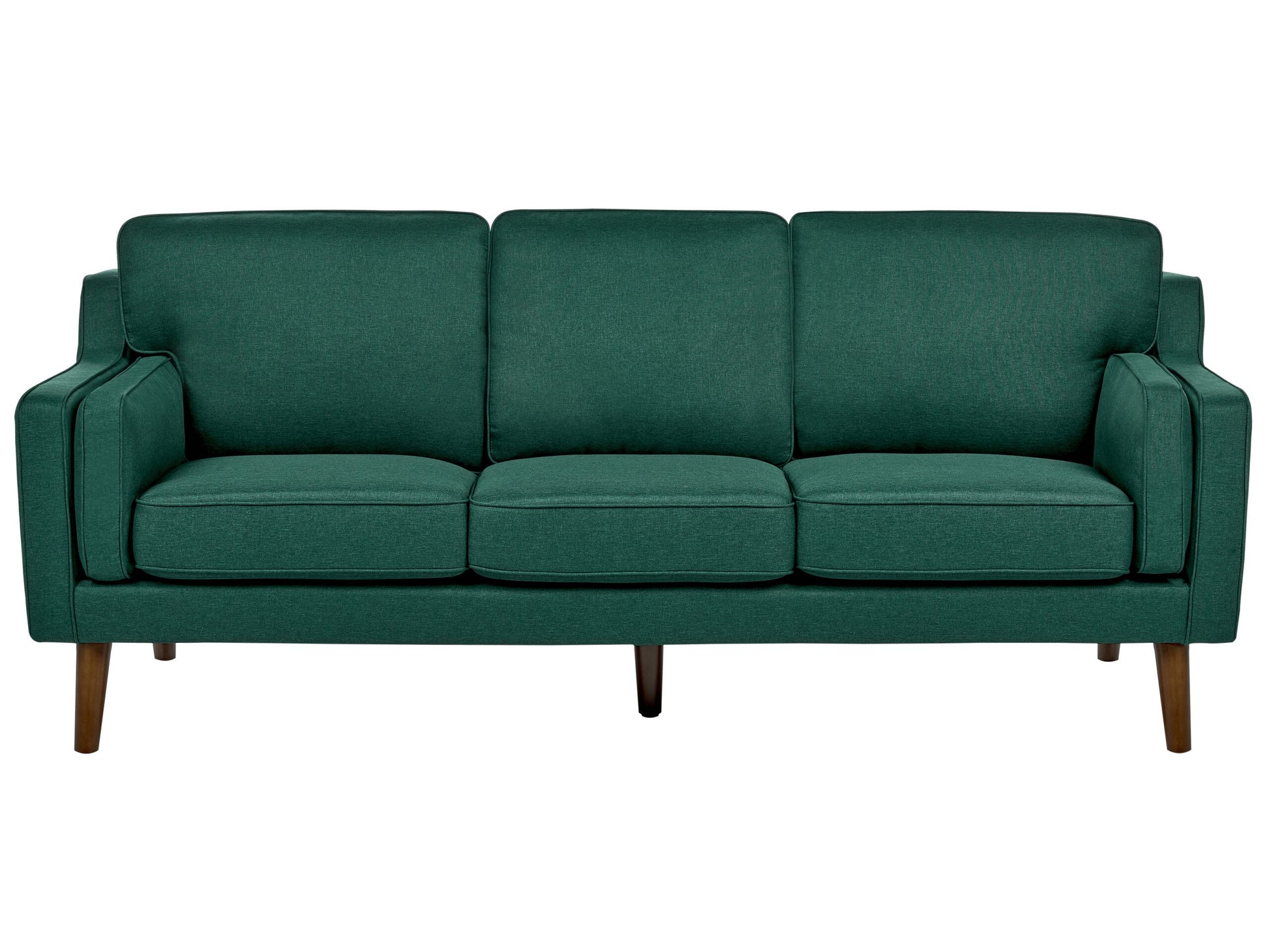 Ein elegantes Sofa, das komplett mit einem hochwertigen Stoff bezogen ist, der sich angenehm anfühlt. Die dick gepolsterten Kissen und die Doppel-Armlehnen garantieren ein angenehmes Sitzgefühl. Die schrägen Holzbeine garantieren nicht nur einen stabilen Stand, sie unterstreichen auch das Mid-Century-Design des Polstersofas. Das Modell lässt sich gut mit dem passenden Sofa aus derselben Kollektion kombinieren, kann aber auch als Teil eines eklektischen Arrangements mit verschiedenen Sesseln und Sofas fungieren. Material: Polyester. Zusätzliches Material: Eichenholz, Eukalyptus. Material Zusammensetzung: 100% Polyester Gewicht: 45 Kapazität: 3 Personen Montage: Nicht montiert Holzart: Eucalyptus deglupta, Quercus mongolica Holzursprung: China Kissen Abmessungen: 63/51x46 Beine Höhe: 18 Polsterstärke: 11 Sitzhöhe: 39 Das Angebot beinhaltet: 1 x Dreisitzer Sitzfläche: 156x58 Höhe: 85 zusätzliche Information: Die Beine befinden sich in einer praktischen Tasche unter dem Sitz. Breite: 204 Tiefe: 83 Art: 3 Sitzer Sofa Stil: Retro Allgemeine Farbe: Grün Schatten: Dunkelgrün Muster: Ohne Muster Hauptmaterial: Polyester Füllmaterial: Schaumstoff Arm Stil: Gerade