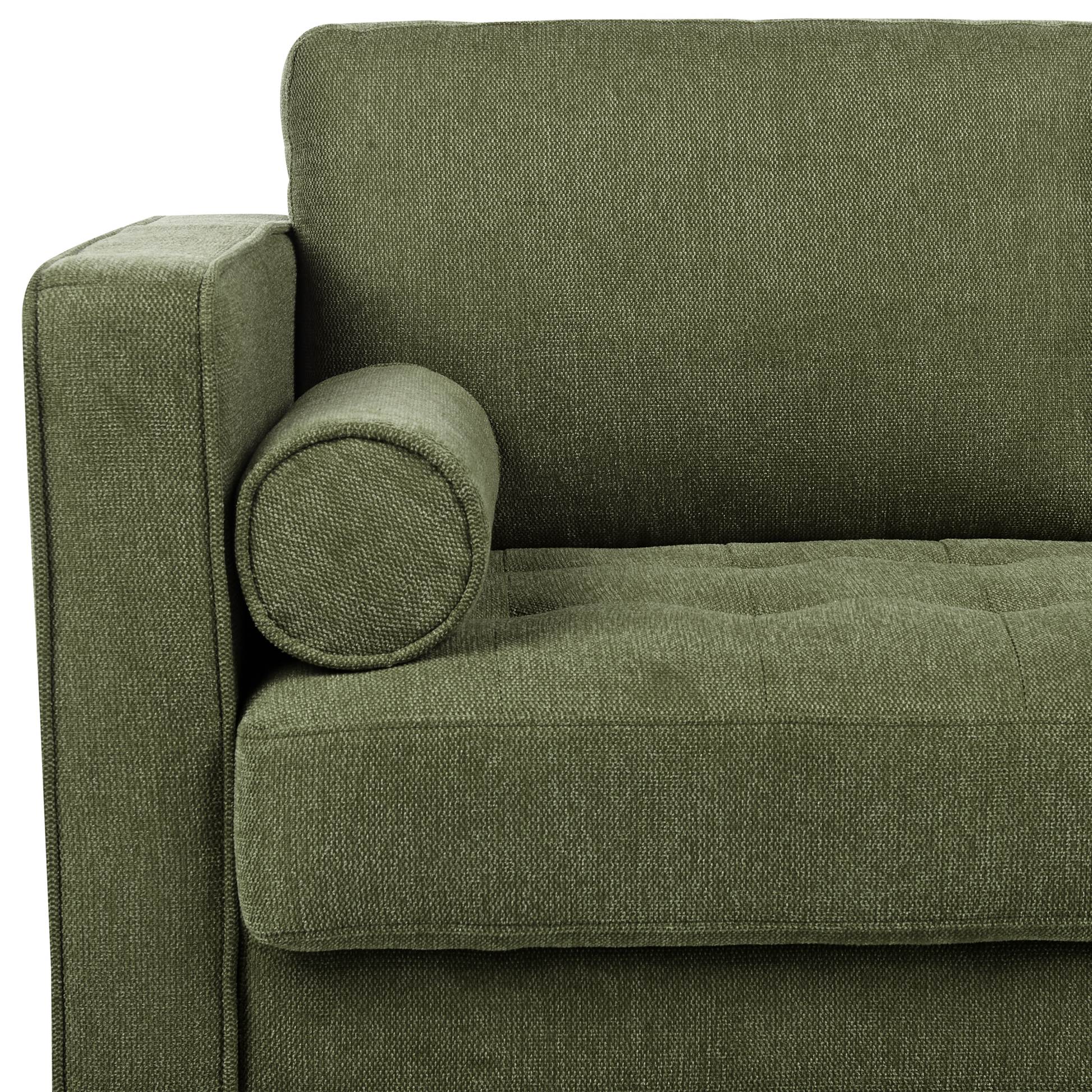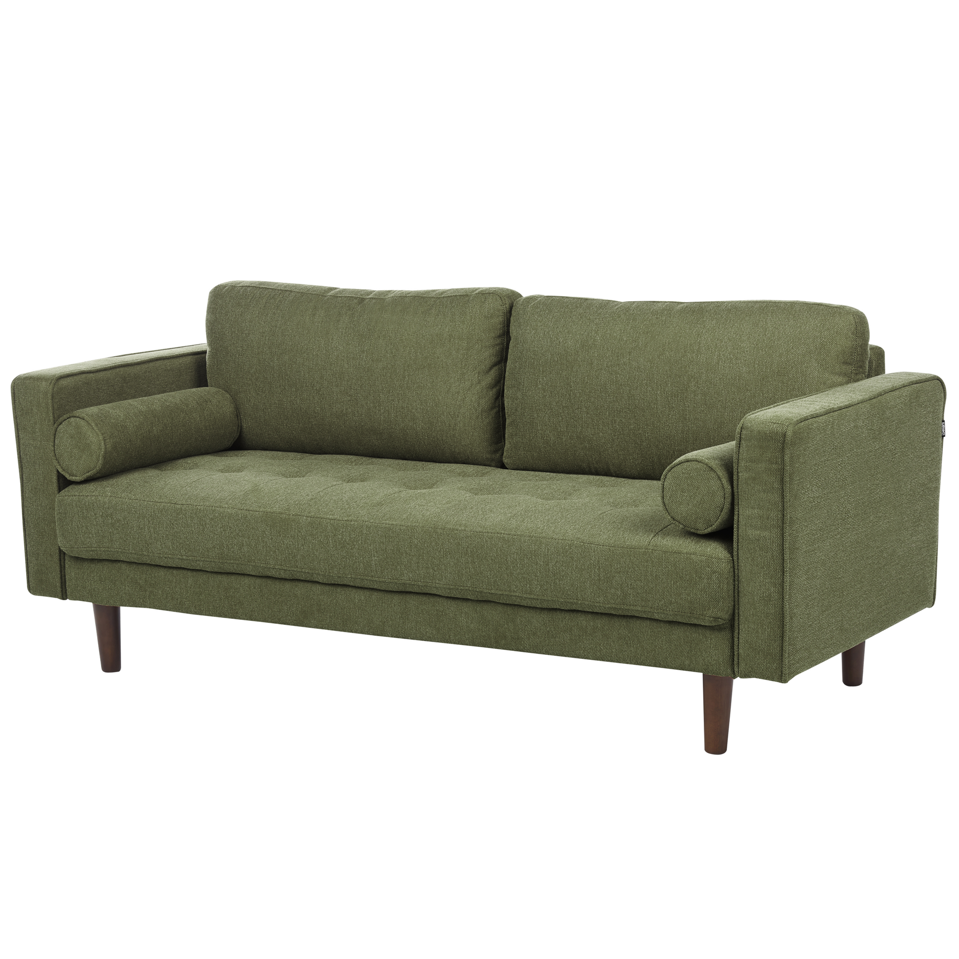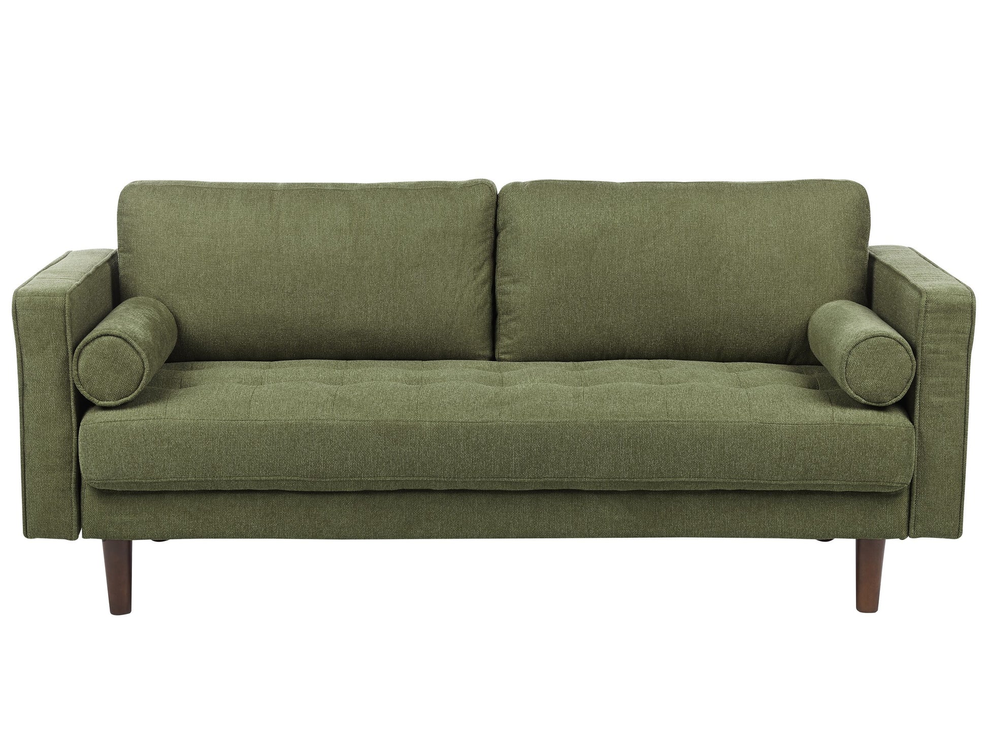 Dieses Stoffsofa lässt mit seinem zeitlosen Retro-Design besondere Gemütlichkeit in Ihrem Wohnzimmer aufkommen. Mit seinem strapazierfähigen Stoffbezug und seinen schmalen Beinen aus Gummibaumholz strahlt es nicht nur Stil aus, sondern verspricht auch Langlebigkeit und Robustheit. Die dicken Sitz- und Rückenkissen sind mit praktischen Klettverschlüssen für einen sicheren Halt ausgestattet. Die weichen Sitzpolster und hohen Armlehnen sorgen für einen optimalen Sitzkomfort, während die zusätzlichen Nackenrollen das Sitzerlebnis noch um einiges erhöhen. Zudem verfügen die Kissen über abnehmbare Hüllen, die Ihnen die Instandhaltung des Wohnzimmersofas erleichtern. Material: Polyester. Zusätzliches Material: Eukalyptus, Gummibaumholz, Sperrholz. Material Zusammensetzung: 100% Polyester Gewicht: 40 Kapazität: 3 Personen Montage: Beine / Füsse nicht montiert Holzart: Eucalypteae Holzursprung: China Kissen Abmessungen: 47x14 Polsterstärke: 19 Sitzhöhe: 45 Das Angebot beinhaltet: 2 x Zierkissen, 1 x Dreisitzer Sitzfläche: 157x50 Höhe: 78 Breite: 177 Tiefe: 74 Art: 3 Sitzer Sofa Stil: Retro Allgemeine Farbe: Grün Schatten: Dunkelgrün Muster: Ohne Muster Hauptmaterial: Polyester Füllmaterial: Schaumstoff Arm Stil: Gerade