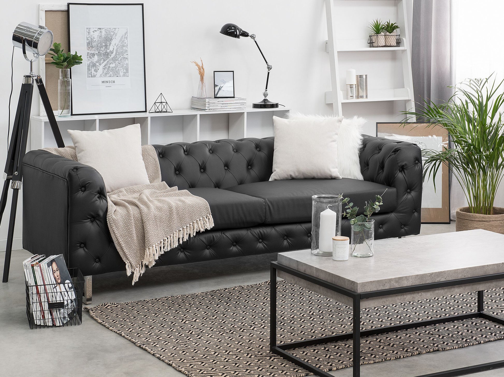 Mit diesem Dreisitzer aus Kunstleder verleihen Sie Ihrem Wohnraum eine glamouröse, als auch elegante Ausstrahlung. Sein schickes Design mit akzentuierten Ziernähten und klassischem Knopfmuster im Chesterfield Style in Kombination mit den geraden Armlehnen und stabilen Edelstahlfüssen macht das Sofa zu einem echten Hingucker. Die dicken Sitzkissen aus hochwertigem,schwarzem Kunstleder sorgen für zusätzlichen Sitzkomfort. Material: Kunstleder. Zusätzliches Material: Edelstahl, Eukalyptus. Material Zusammensetzung: 100% Kunstleder Gewicht: 46 Kapazität: 3 Personen Montage: Beine / Füsse nicht montiert Holzart: Eucalyptus deglupta Holzursprung: China Beine Höhe: 15 Polsterstärke: 16 Sitzhöhe: 46 Das Angebot beinhaltet: 1 x Sofa Sitzfläche: 170x60 Höhe: 71 Breite: 215 Tiefe: 87 Art: 3 Sitzer Sofa Stil: Glamourös Allgemeine Farbe: Schwarz Muster: Ohne Muster Hauptmaterial: Kunstleder Füllmaterial: Taschenfedern, Schaumstoff Arm Stil: Gerade