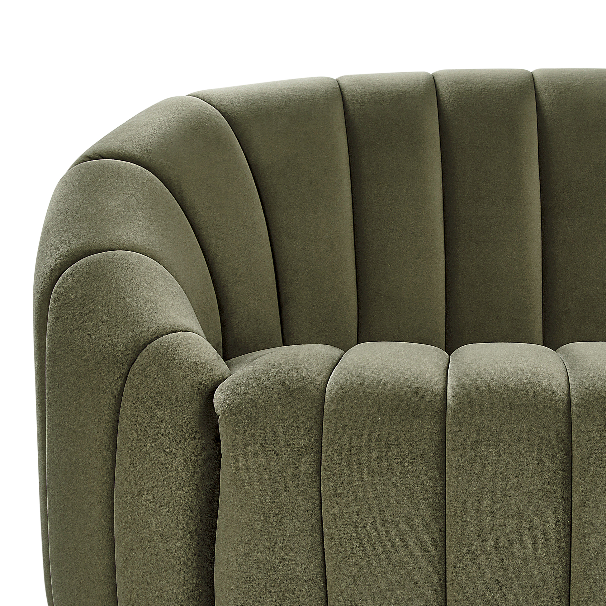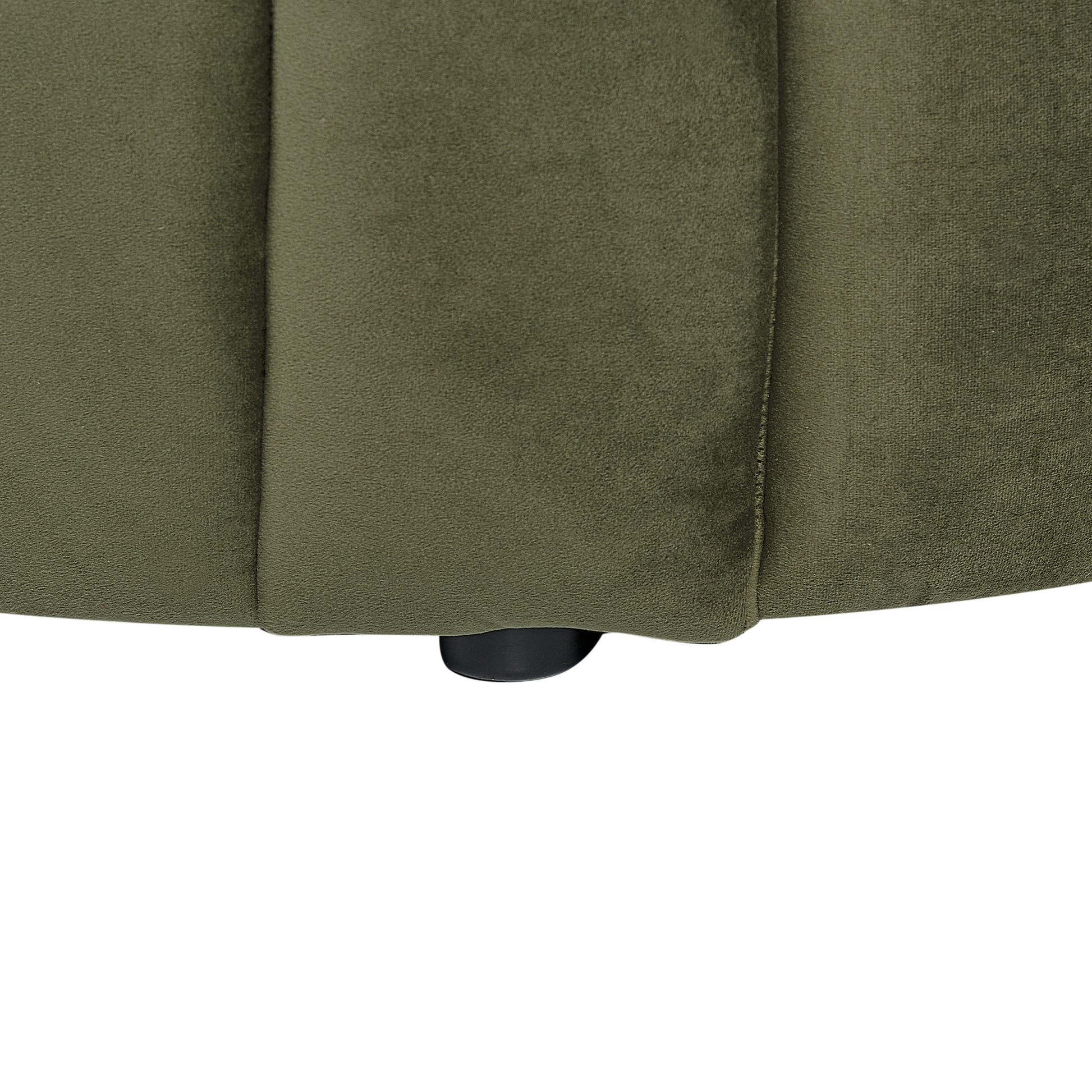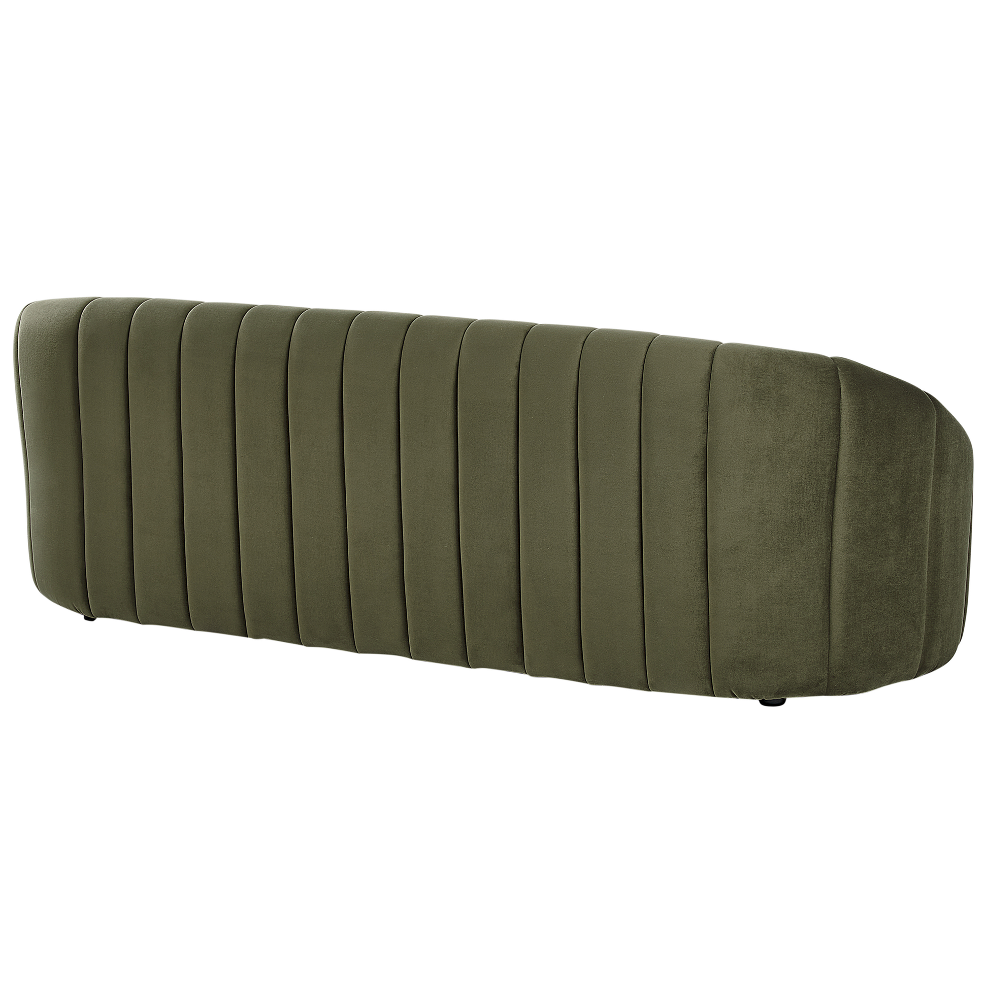 Lassen Sie sich die Design-Schönheit und vortreffliche Gemütlichkeit dieses ovalen Polstersofas nicht entgehen. Seine robuste Holzkonstruktion und niedrigen Kunststoffbeine versprechen Ihnen Stabilität beim Sitzen. Zudem verfügt das Sofa über einen Rundumbezug aus geschmeidigem Samtstoff, der in einem dunklen, matten Farbton gehalten ist. Für besondere Raffinesse sorgen seine vertikal gesteppten Oberflächen und seine geschwungene Rückenlehne. Seine breite Sitzfläche ist mit dickem Schaumstoff ausgelegt und ist dabei auch besonders tief, so wirkt das Samtsofa nicht nur unheimlich gemütlich, sondern auch sehr edel. Setzen Sie auf diese Couch, die bis ins kleinste Detail verfeinert ist und bringen Sie einen unvergleichlichen Look in Ihre Wohnbereiche. Material: Samtstoff. Material Zusammensetzung: 100% Polyester Gewicht: 38 Kapazität: 3 Personen Montage: Beine / Füsse nicht montiert Holzart: Eucalyptus grandis Holzursprung: China Beine Höhe: 3 Sitzhöhe: 37 Das Angebot beinhaltet: 1 x Sofa Sitzfläche: 168x57 Höhe: 68 zusätzliche Information: Bitte beachten Sie, dass Samtstoff unter verschiedenen Lichtverhältnissen eine andere Optik haben kann – das Material schimmert bei Tageslicht stärker und wirkt bei künstlicher Beleuchtung in Innenräumen eher gedämpft. Aufgrund der glatten, hochdichten Struktur des Gewebes kann sein Farbton auch variieren, wenn man mit der Hand in verschiedene Richtungen und Winkel über den Stoff fährt. Um den Farbton auszugleichen und Druckstellen zu vermeiden, sollte der Webstoff sanft mit einer offenen Handfläche in eine Richtung gestrichen, mit einem feuchten Tuch abgewischt oder einem Dampfbügeleisen gebügelt werden. Breite: 200 Tiefe: 79 Art: 3 Sitzer Sofa Stil: Retro Allgemeine Farbe: Grün Schatten: Dunkelgrün Muster: Ohne Muster Hauptmaterial: Samtstoff Füllmaterial: Schaumstoff Arm Stil: Abgesenkt