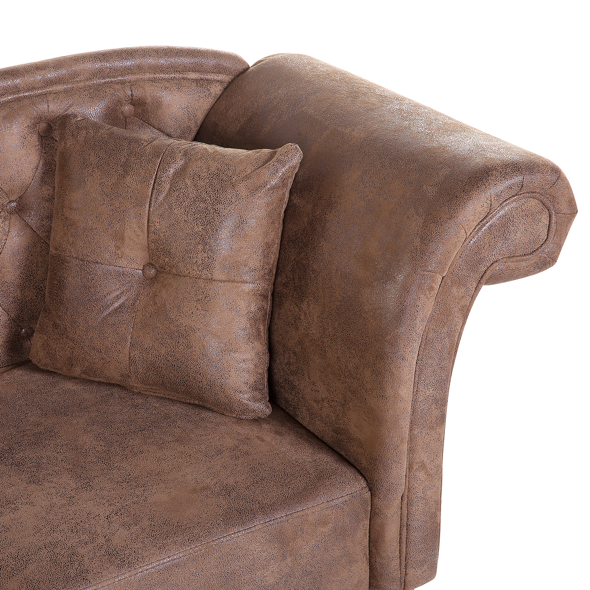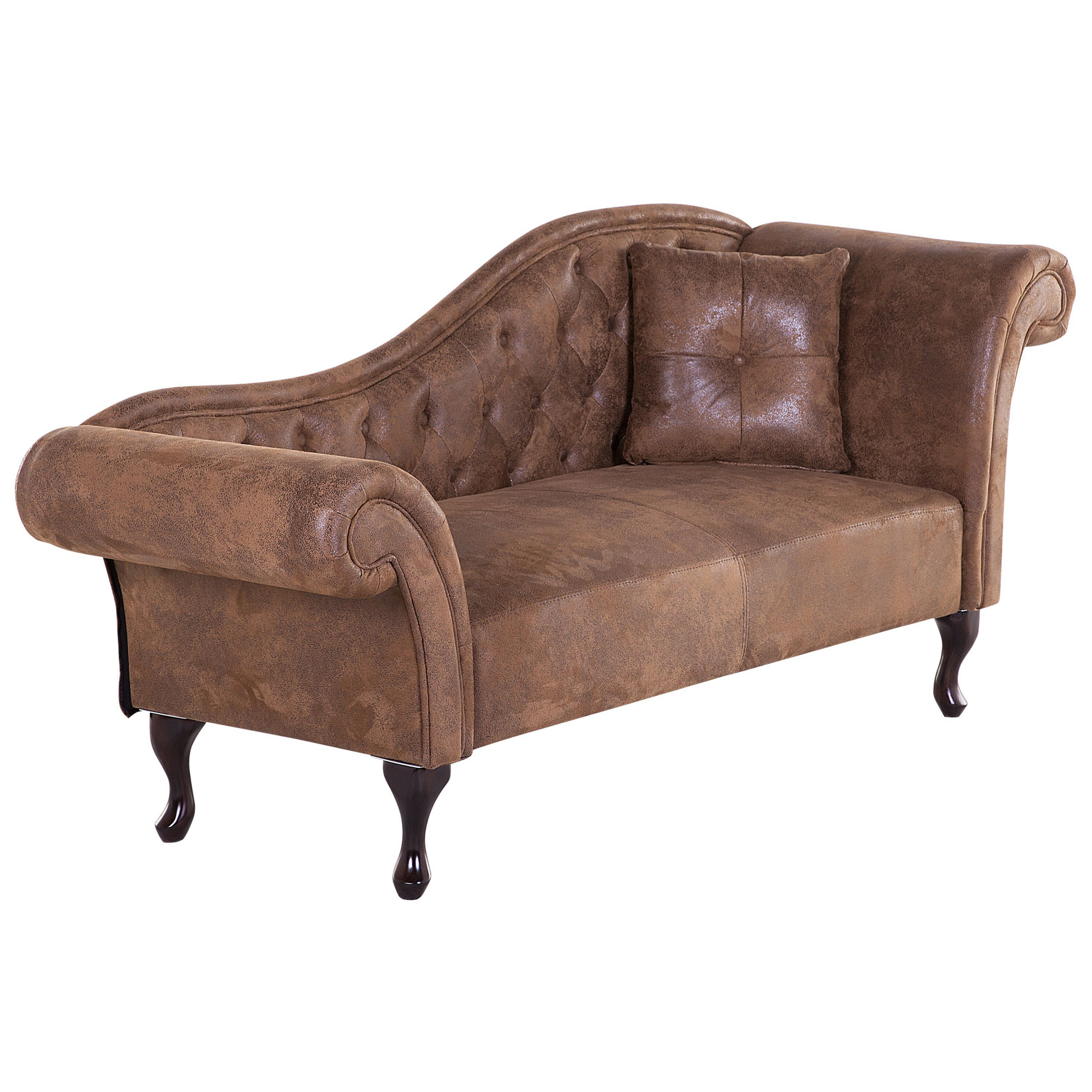 Descrizione: Die gemütliche rechtsseitige Chaiselongue aus hochwertigem, hellbraunem Kunstleder wird Sie mit ihrer geschwungenen Formgebung, den zierlichen Holzfüssen und der eleganten Chesterfield-Knopfverzierung auf der Rückenlehne begeistern. Dank ihrer Grösse und angenehmen Polsterung bietet sie nicht nur eine geräumige Sitzgelegenheit, sondern zugleich eine bequeme Liegefläche für optimale Entspannungsmomente. Das bequeme, kleine Zierkissen ist im Lieferumfang enthalten. Material: Kunstwildleder. Zusätzliches Material: Lärchenholz, Sperrholz, Gummibaumholz. Material Zusammensetzung: 100% Polyester Gewicht: 37 Montage: Nicht montiert Holzart: Larix gmelinii (Rupr.) Holzursprung: China Gewichtskapazität: 180 Kissen Abmessungen: 35x35 Beine Höhe: 20 Polsterstärke: 19 Sitzhöhe: 39 Das Angebot beinhaltet: 1 x Récamiere, 1 x Zierkissen Sitzfläche: 127x57 Höhe: 87 Breite: 188 Tiefe: 59 Art: Rechtsseitige Chaiselounge Stil: Retro Allgemeine Farbe: Braun Schatten: Hellbraun Muster: Ohne Muster Hauptmaterial: Kunstwildleder Füllmaterial: Schaumstoff Arm Stil: Abgesenkt Orientierung: rechtsseitig