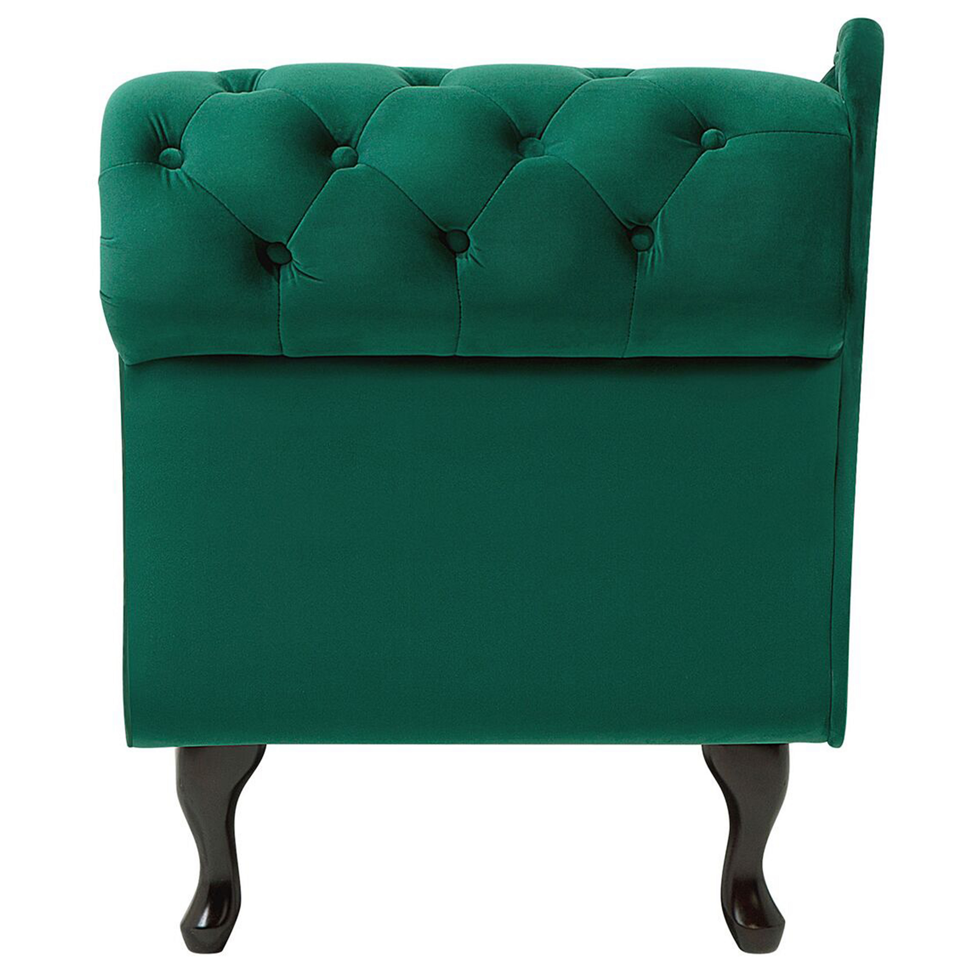 Descrizione: Das hochwertig verarbeitete Kanapee im Chesterfield Style wird Ihnen einen optimalen Sitzkomfort bieten. Aber auch das Design steht der Wohnlichkeit in nichts nach. Präzise wurde jeder Metallknopf, der den Samtstoff über die Polsterung spannt, gesetzt. Diese Knöpfe sind einerseits funktional aber sie geben auch der Recamiere sein besonderes Erscheinungsbild. Die geschwungenen Füsse, die mit der wellenartig verlaufenden Rückenlehne perfekt harmonieren, unterstützen diesen Effekt zusätzlich. Dank der Ottomane mit Liegefunktion können Sie erholsame Stunden und auch eine elegante Einrichtung geniessen. Material: Samtstoff. Zusätzliches Material: Lärchenholz, Sperrholz, Gummibaumholz. Material Zusammensetzung: 100% Polyester Gewicht: 30 Montage: Nicht montiert Holzart: Larix gmelinii (Rupr.) Holzursprung: China Gewichtskapazität: 180 Beine Höhe: 20 Polsterstärke: 20 Sitzhöhe: 43 Das Angebot beinhaltet: 1 x Récamiere Sitzfläche: 134x56 Höhe: 79 zusätzliche Information: Die Beine befinden sich in einer praktischen Tasche unter dem Sitz., Bitte beachten Sie, dass Samtstoff unter verschiedenen Lichtverhältnissen eine andere Optik haben kann – das Material schimmert bei Tageslicht stärker und wirkt bei künstlicher Beleuchtung in Innenräumen eher gedämpft. Aufgrund der glatten, hochdichten Struktur des Gewebes kann sein Farbton auch variieren, wenn man mit der Hand in verschiedene Richtungen und Winkel über den Stoff fährt. Um den Farbton auszugleichen und Druckstellen zu vermeiden, sollte der Webstoff sanft mit einer offenen Handfläche in eine Richtung gestrichen, mit einem feuchten Tuch abgewischt oder einem Dampfbügeleisen gebügelt werden. Breite: 169 Tiefe: 65 Art: Rechtsseitige Chaiselounge Stil: Glamourös Allgemeine Farbe: Grün Schatten: Dunkelgrün Muster: Ohne Muster Hauptmaterial: Samtstoff Füllmaterial: Schaumstoff Arm Stil: Abgesenkt Orientierung: rechtsseitig