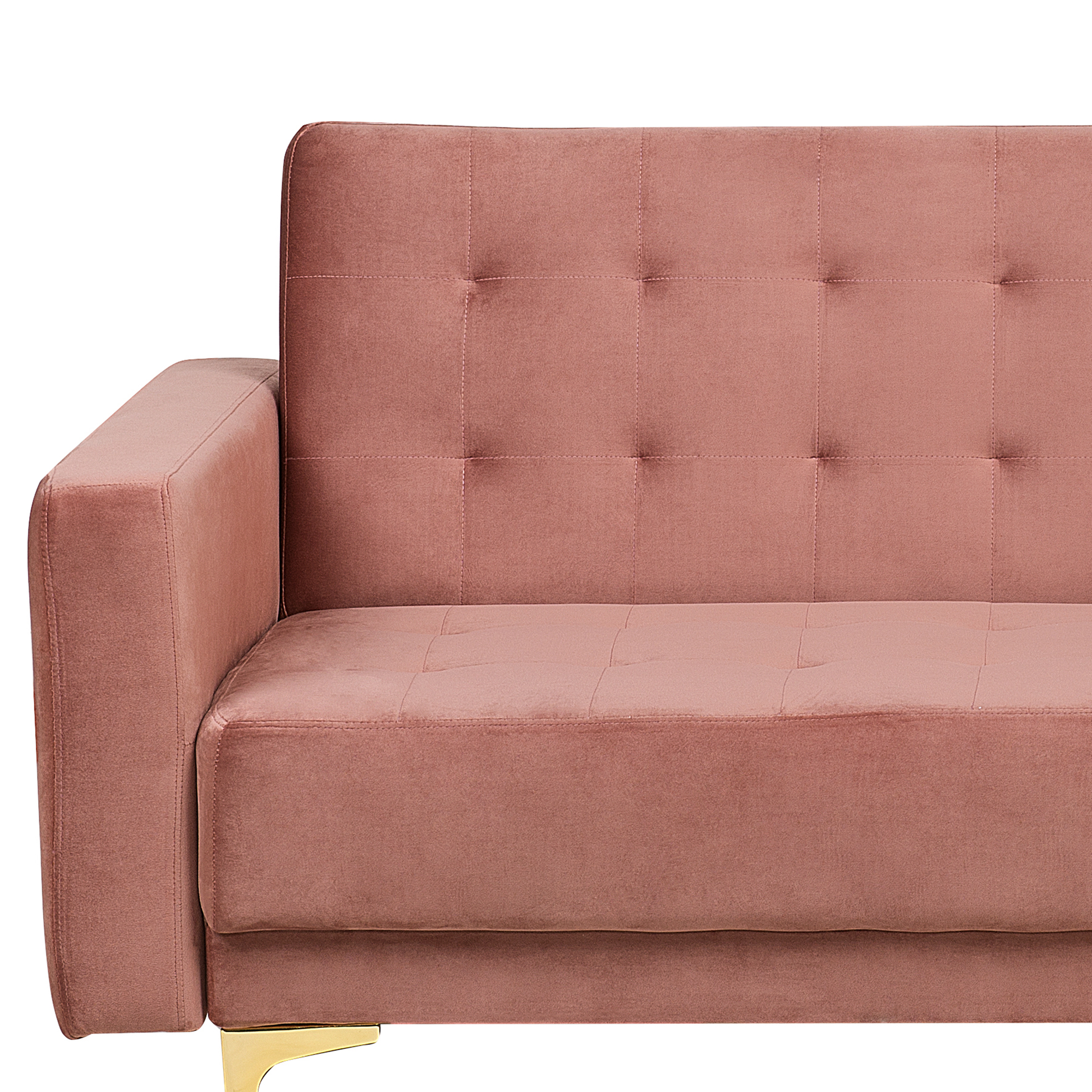 Diese moderne, dick gepolsterte Sofa überzeugt durch seine Formschönheit, aufwendige Verarbeitung sowie seinen optimalen Sitz- und Liegekomfort. Zudem lässt sich seine Rückenlehne mit wenigen Handgriffen verstellen, so erhalten Sie ein komfortables Bett für sich oder Ihre Gäste. Der geschmeidige Samtbezug, die gesteppte Oberfläche und die goldenen Metallbeine verliehen dem Polstersofa eine besonders luxuriöse Optik. Kombinieren Sie den Dreisitzer mit weiteren Möbelstücken aus der Kollektion, um eine Sitzgruppe zu schaffen, die individuell auf Sie abgestimmt ist. Material: Samtstoff. Zusätzliches Material: Sperrholz, Metall, Eukalyptus. Material Zusammensetzung: 100% Polyester Gewicht: 45 Kapazität: 3 Personen Montage: Teilweise montiert Holzart: Eucalyptus Globulus Holzursprung: China Beine Höhe: 13 Polsterstärke: 20 Sitzhöhe: 41 Schlafende Oberfläche: 108x160 Das Angebot beinhaltet: 1 x Dreisitzer Sitzfläche: 160x60 Höhe: 83 zusätzliche Information: Damit die beste Benutzerfreundlichkeit gewährleistet wird, sollte der Abstand zwischen der Rückenlehne und der Wand ca. 15 cm betragen., Bitte beachten Sie, dass Samtstoff unter verschiedenen Lichtverhältnissen eine andere Optik haben kann – das Material schimmert bei Tageslicht stärker und wirkt bei künstlicher Beleuchtung in Innenräumen eher gedämpft. Aufgrund der glatten, hochdichten Struktur des Gewebes kann sein Farbton auch variieren, wenn man mit der Hand in verschiedene Richtungen und Winkel über den Stoff fährt. Um den Farbton auszugleichen und Druckstellen zu vermeiden, sollte der Webstoff sanft mit einer offenen Handfläche in eine Richtung gestrichen, mit einem feuchten Tuch abgewischt oder einem Dampfbügeleisen gebügelt werden. Breite: 186 Tiefe: 88 Art: 3 Sitzer Sofa Stil: Modern Allgemeine Farbe: Rosa Hauptmaterial: Samtstoff Füllmaterial: Schaumstoff Arm Stil: Gerade
