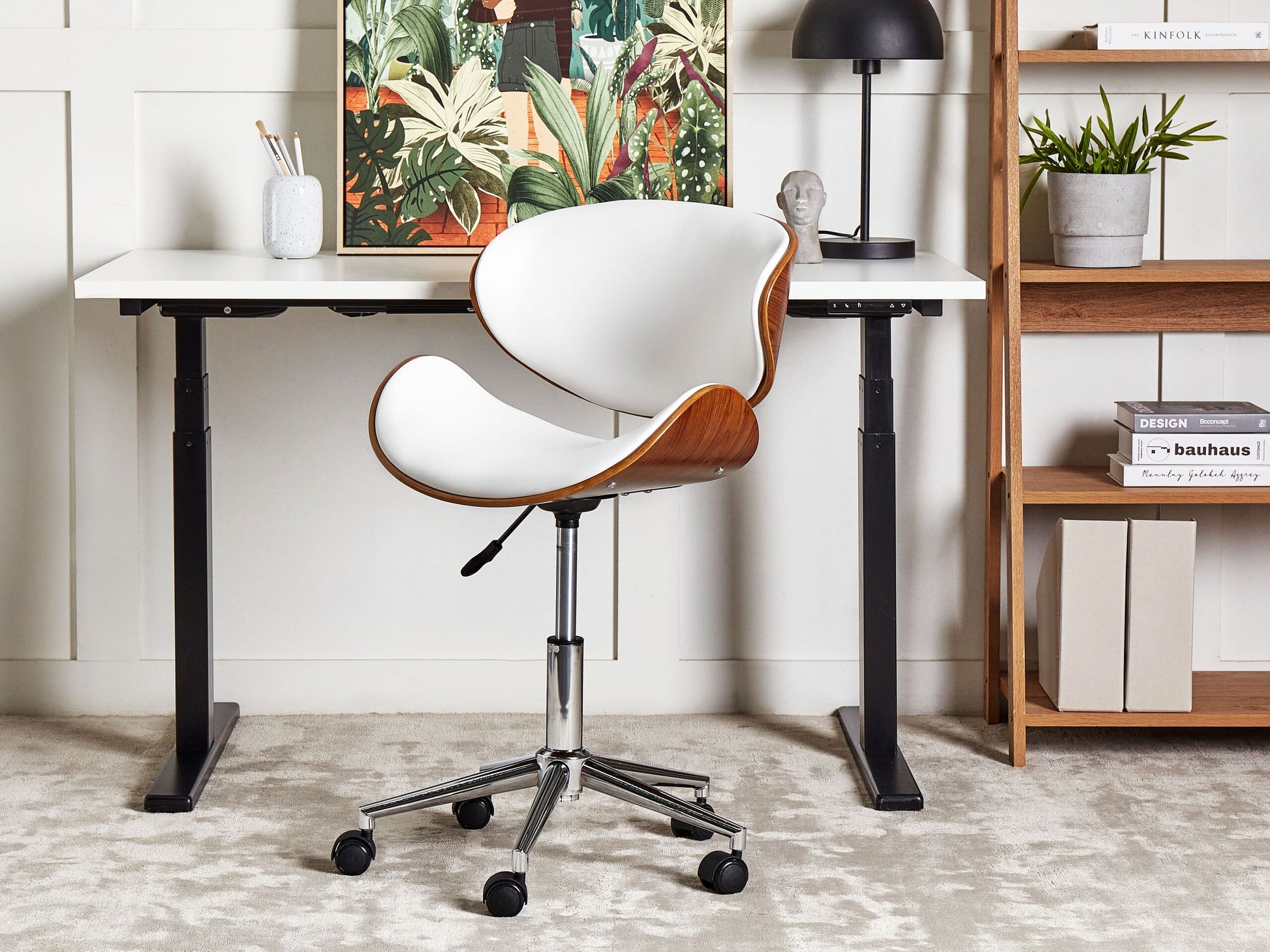 Die einzigartige, leicht gebogene Form der Sitz- und Rückenfläche lassen den Drehstuhl nicht nur bequem sondern auch elegant erscheinen. Die praktische Gasdruckfeder zur Einstellung der Sitzhöhe, die komfortable Sitzfläche aus Kunstleder und die leichtgängigen Laufrollen machen ihn zum besten Begleiter am Schreibtisch. Material: Kunstleder. Zusätzliches Material: Stahl, Sperrholz. Material Zusammensetzung: 100% Kunstleder Gewicht: 11 Montage: Nicht montiert Gewichtskapazität: 130 Sitzhöhe: 47-59 Das Angebot beinhaltet: 1 x Bürostuhl Sitzfläche: 49x39 Höhe: 76-88 zusätzliche Information: Um sicherzustellen, dass die Konstruktion stabil und die Nutzungssicherheit gewährleistet ist, sollte man 2 Wochen nach dem Zusammenbau überprüfen, ob die Ware auch korrekt montiert wurde. Ausserdem ist alle 3 Monate zu prüfen, ob die Schrauben richtig festgezogen sind. Breite: 49 Tiefe: 56 Art: Bürostuhl Stil: Retro Allgemeine Farbe: Weiss Hauptmaterial: Kunstleder