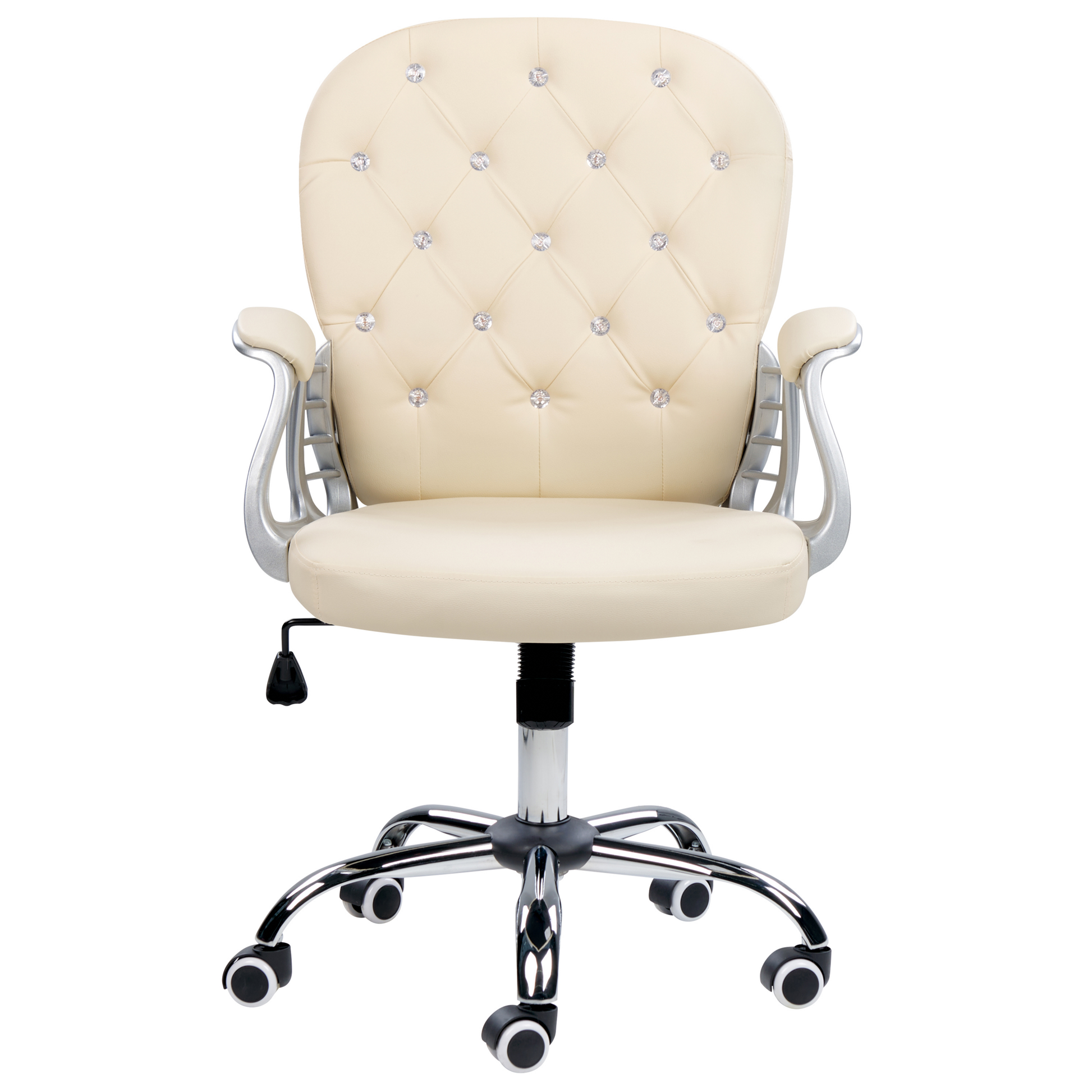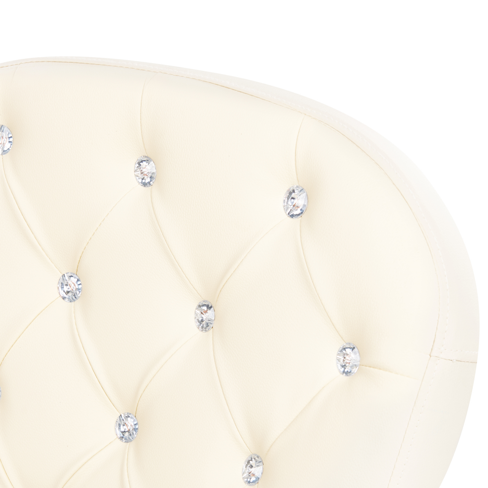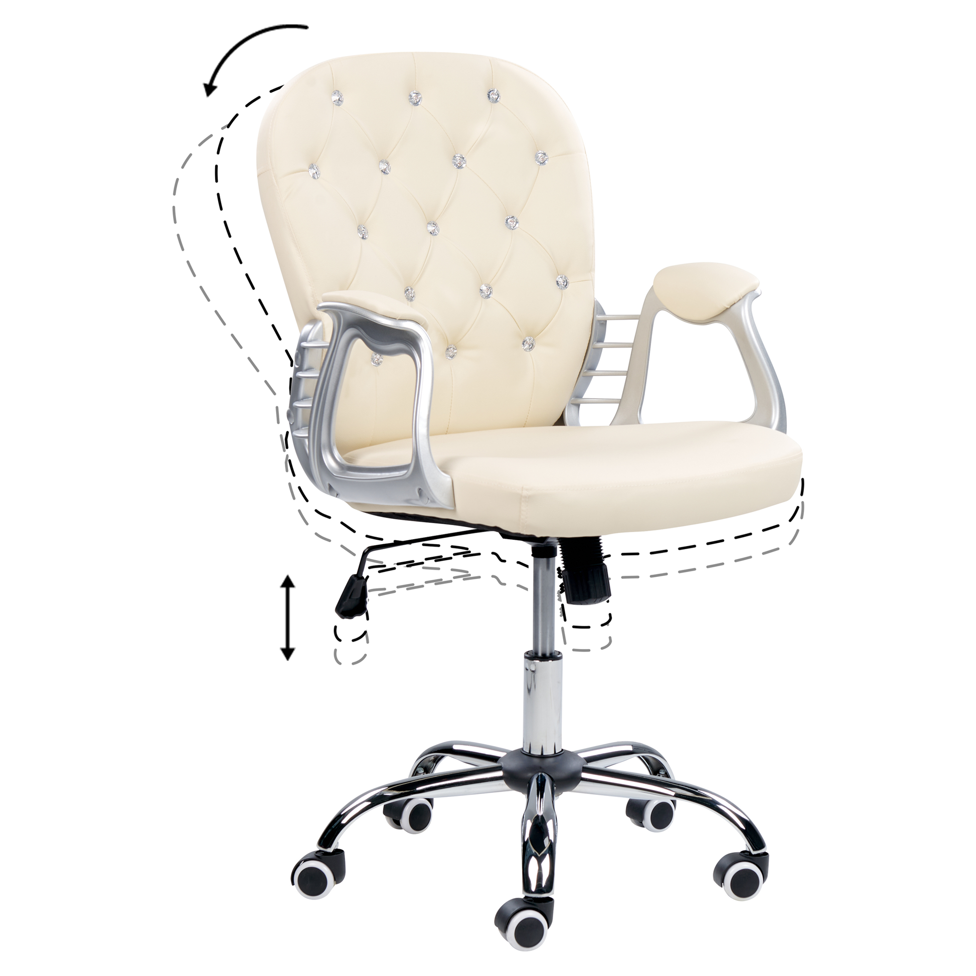 Dieser luxuriöse Bürosessel vereint moderne Eleganz mit einem zauberhaften Vintage-Touch. Sowohl seine Sitzfläche als auch seine Armlehnen sind mit strapazierfähigem Kunstleder überzogen. Das Modell zeichnet sich durch seine dekorative, hohe Rückenlehne aus, die mit Glaskrsitallknöpfen und einer edlen Diamantsteppung versehen ist. Die gepolsterten, geschwungenen Armlehnen bieten zusätzlichen Komfort und stimmen perfekt mit dem Sitzflächenfarbton überein. Zudem verfügt der Sessel über ein drehbares Fusskreuz, was Ihnen seine Handhabung wesentlich erleichtert. Die praktische Gasdruckfeder erlaubt es Ihnen die Sitzhöhe an Ihre Bedürflisse anzupassen und den Stuhl sowohl im Heimbüro als auch im Kinderzimmer einzusetzen. Material: Kunstleder. Zusätzliches Material: Eisen, Sperrholz, Kunststoff. Material Zusammensetzung: 100% Kunstleder Gewicht: 10 Montage: Nicht montiert Gewichtskapazität: 120 Sitzhöhe: 46-56 Das Angebot beinhaltet: 1 x Bürostuhl Sitzfläche: 49x46 Höhe: 98-108 zusätzliche Information: Um sicherzustellen, dass die Konstruktion stabil und die Nutzungssicherheit gewährleistet ist, sollte man 2 Wochen nach dem Zusammenbau überprüfen, ob die Ware auch korrekt montiert wurde. Ausserdem ist alle 3 Monate zu prüfen, ob die Schrauben richtig festgezogen sind. Breite: 60 Tiefe: 60 Art: Bürostuhl Stil: Glamourös Allgemeine Farbe: Beige Hauptmaterial: Kunstleder