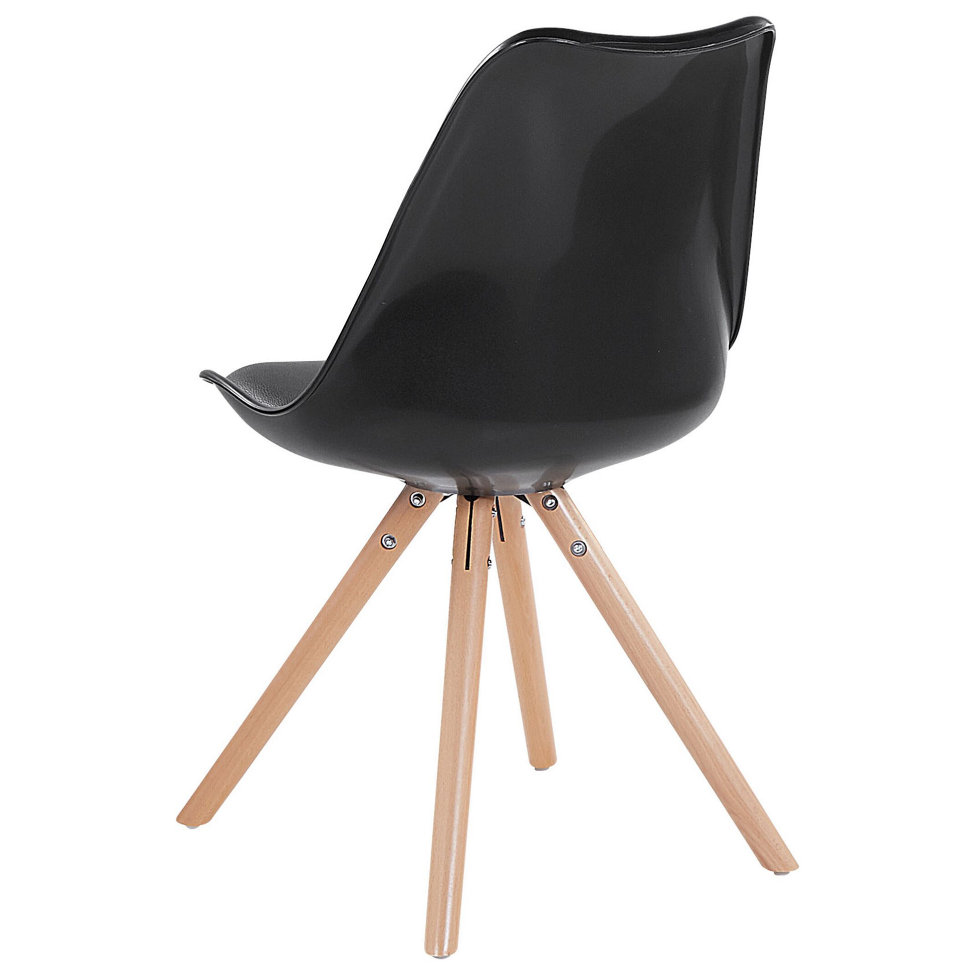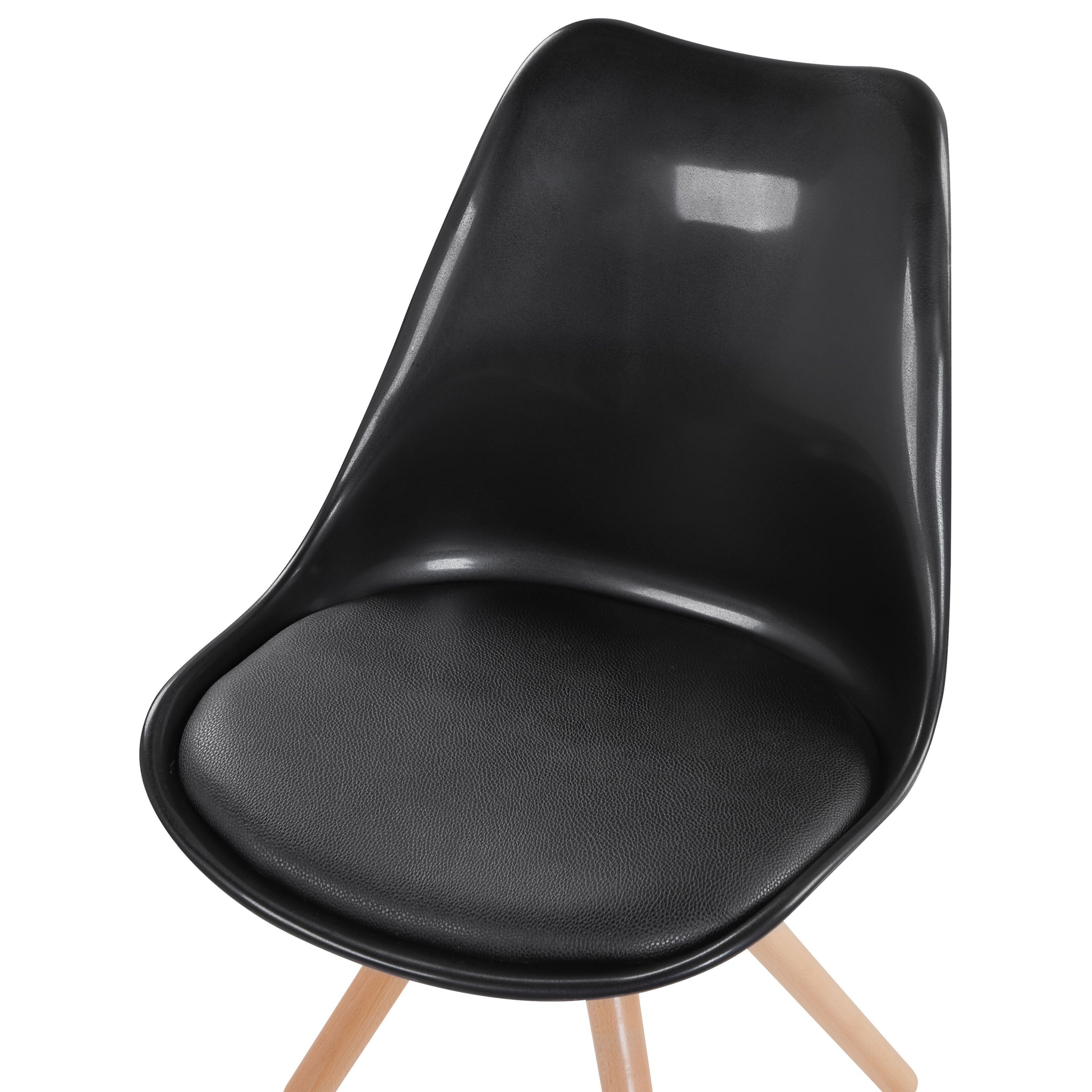 Die formstabile Kunststoff-Schale der Küchenstühle bezaubert mit ihrer wellenartigen Formgebung, einer besonders pflegeleichten Handhabung sowie Unempfindlichkeit gegenüber Verschmutzungen. Die üppige Schaumstoffpolsterung und der angenehm weiche Kunstlederbezug bringen hervorragende Sitzeigenschaften an jeden Ess-, Küchen- oder Wohnzimmertisch. Dank ihrer individuellen Maserung verleihen die 4 standsicheren Holzbeine jedem Modell einen eigenen Charakter. Die zusätzlichen Schutzkappen an den Füssen minimieren Kratzer auf Parkett- oder Holzböden. So lassen sich die Stühle auch geräuschlos und sorglos an jeden Ort verschieben. Material: Kunststoff. Zusätzliches Material: Kunstleder, Buchenholz. Gewicht: 6 Montage: Teilweise montiert Holzart: Fagus Sylvatica Holzursprung: China Gewichtskapazität: 125 Sitzhöhe: 46 Das Angebot beinhaltet: 1 x Stuhl Sitzfläche: 42x42 Höhe: 86 zusätzliche Information: Um sicherzustellen, dass die Konstruktion stabil und die Nutzungssicherheit gewährleistet ist, sollte man 2 Wochen nach dem Zusammenbau überprüfen, ob die Ware auch korrekt montiert wurde. Ausserdem ist alle 3 Monate zu prüfen, ob die Schrauben richtig festgezogen sind. Breite: 49 Tiefe: 45 Art: Esszimmerstuhl Stil: Modern Allgemeine Farbe: Schwarz Hauptmaterial: Kunststoff