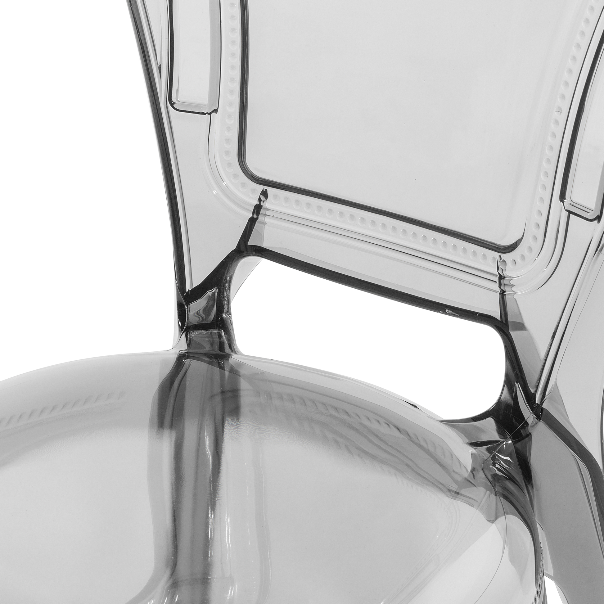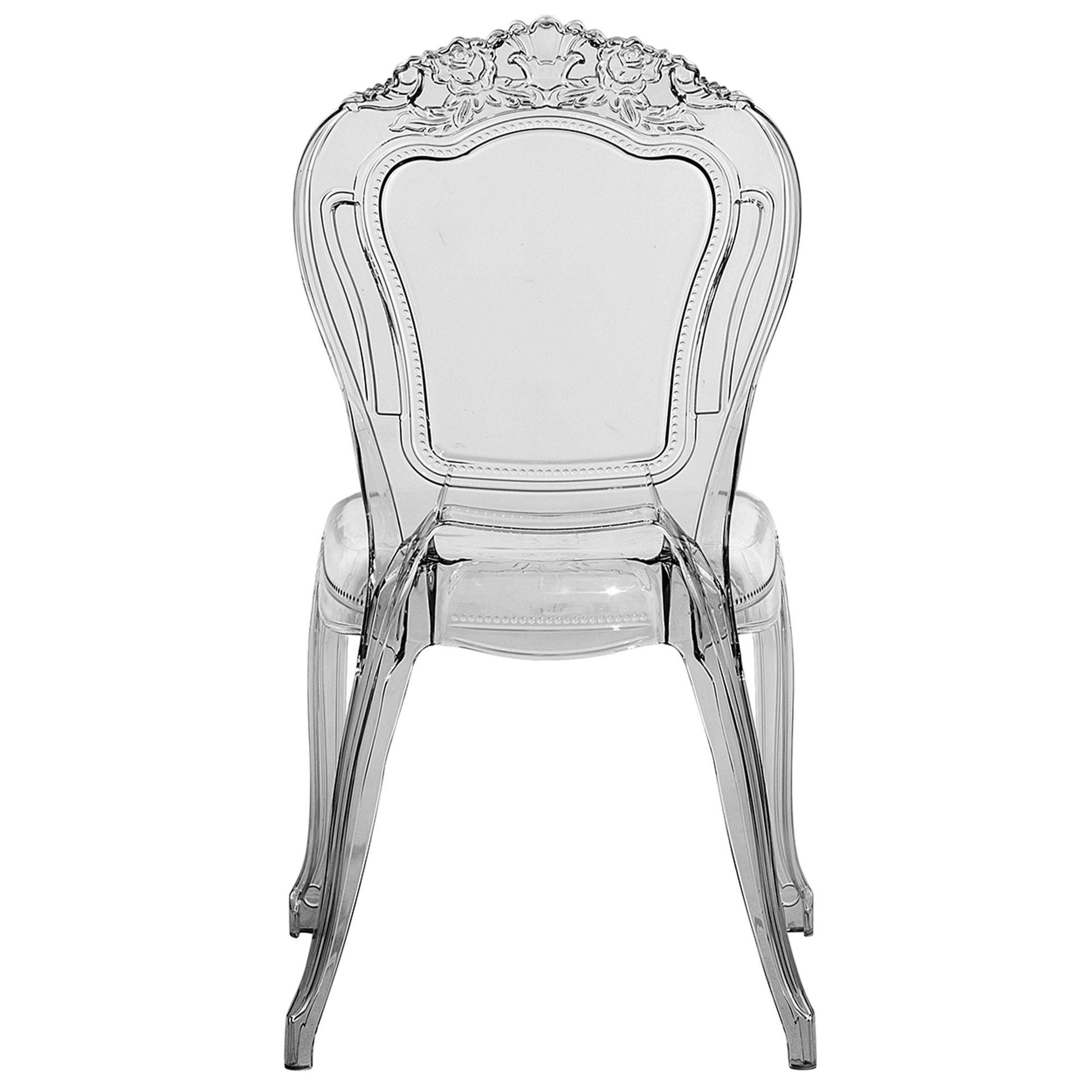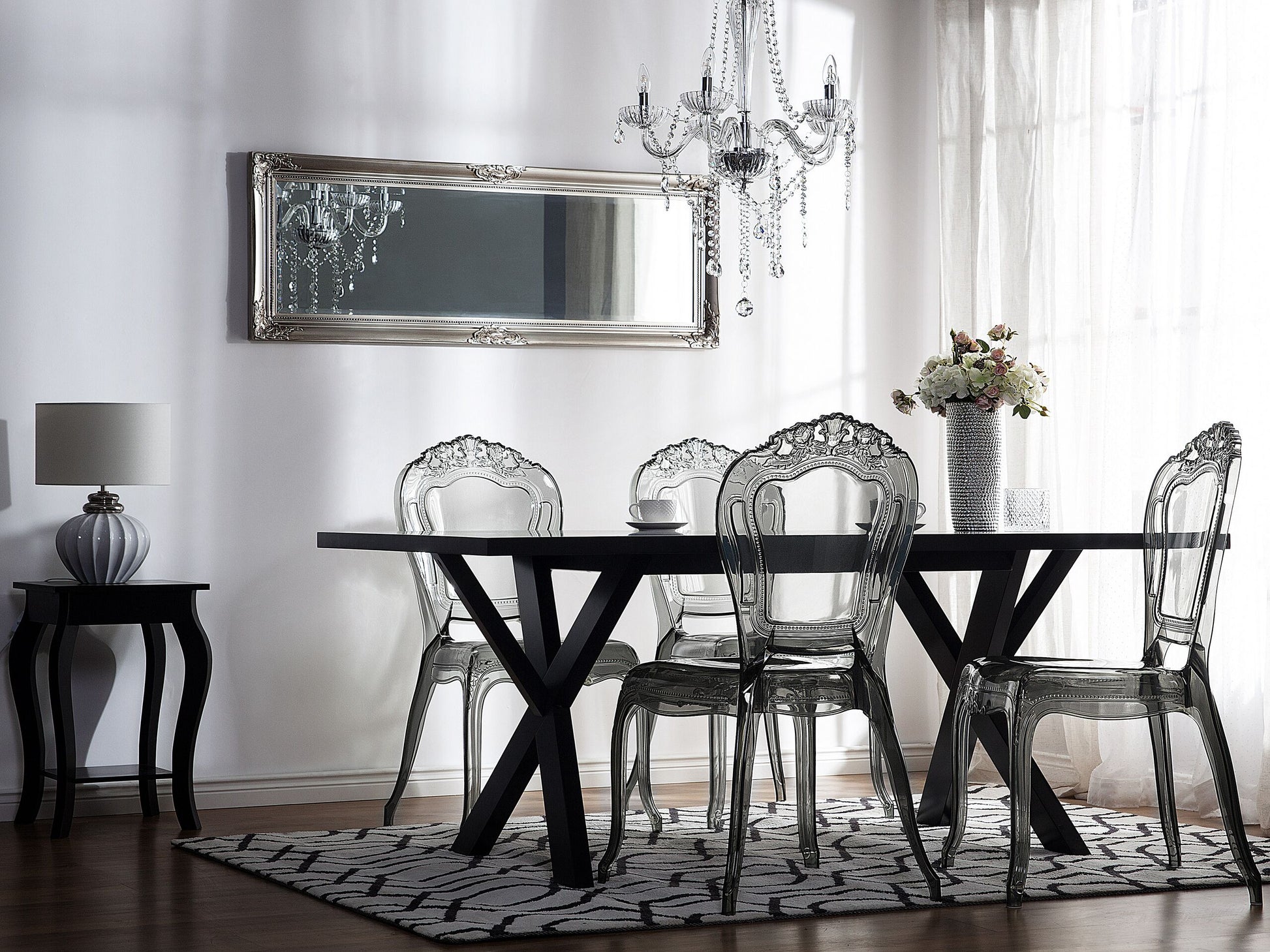 Descrizione: Die wunderschön geschwungene Form, die schlanken Beine und die charakteristische Verzierung an Rückenlehnen und unterhalb der Sitzflächen erinnern an klassische Stühle aus vergangenen Zeiten. Doch statt aus Holz mit einem Bezug aus schwerem Samt oder Brokat wurden diese trendy Stühle aus hochwertigem Polycarbonat hergestellt. Das Material ist UV-beständig, besonders robust und pflegeleicht. Der Farbton in transparentem Schwarz unterstreicht die moderne Note und verleiht den stapelbaren Stühlen Leichtigkeit. Mit ihrem ausgefallenen Design setzen sie sowohl in modernen wie auch in klassischen Einrichtungsstilen tolle, kontrastierende Akzente. Material: Polycarbonat. Gewicht: 5 Montage: Benötigt keine Montage Gewichtskapazität: 150 Sitzhöhe: 45 Das Angebot beinhaltet: 2 x Stühle Sitzfläche: 43x42/44 Höhe: 98 Breite: 52 Tiefe: 53 Art: Esszimmerstuhl 2er Set Stil: Glamourös Allgemeine Farbe: Schwarz Hauptmaterial: Polycarbonat