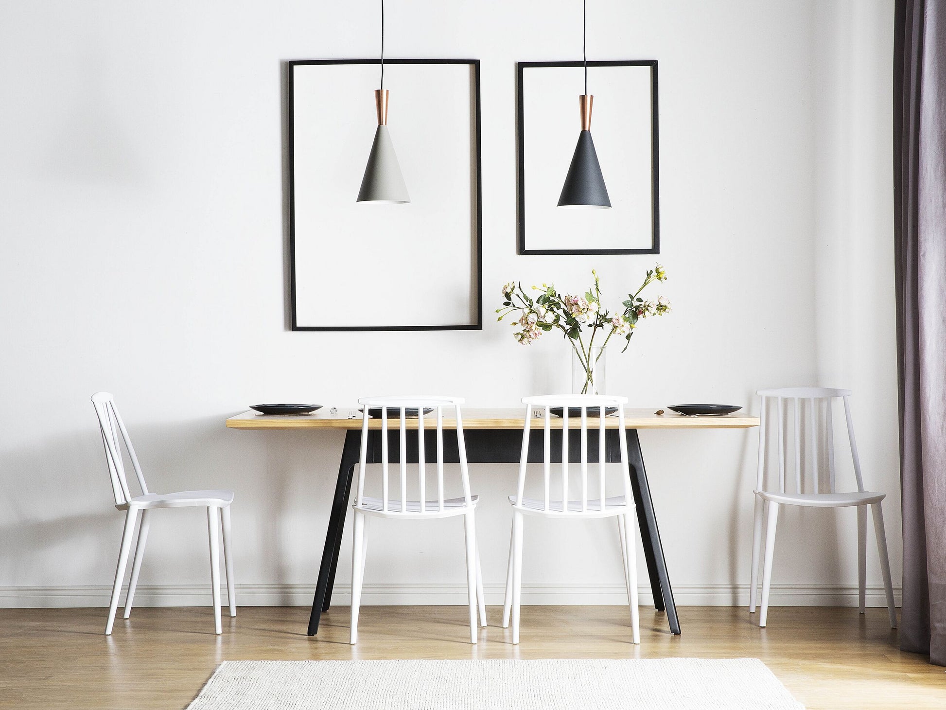 Diese Kunststoffstühle sind robust und dabei auch sehr praktisch. Dank des pflegeleichten Materials eignen sie sich ausgezeichnet für den Einsatz am Küchentisch oder im Esszimmer. Das Set zeichnet sich durch seine frische, moderne Ausstrahlung aus und passt wunderbar in viele verschiedene Einrichtungsstile. Die hohen Rückenlehnen mit schlanken Längsstreben bieten optimalen Halt für bequemes und komfortables Sitzen. Material: Kunststoff. Gewicht: 5 Montage: Benötigt keine Montage Gewichtskapazität: 110 Sitzhöhe: 45 Das Angebot beinhaltet: 2 x Stühle Sitzfläche: 40x43 Höhe: 83 Breite: 49 Tiefe: 41 Art: Esszimmerstuhl 2er Set Stil: Retro Allgemeine Farbe: Weiss Hauptmaterial: Kunststoff