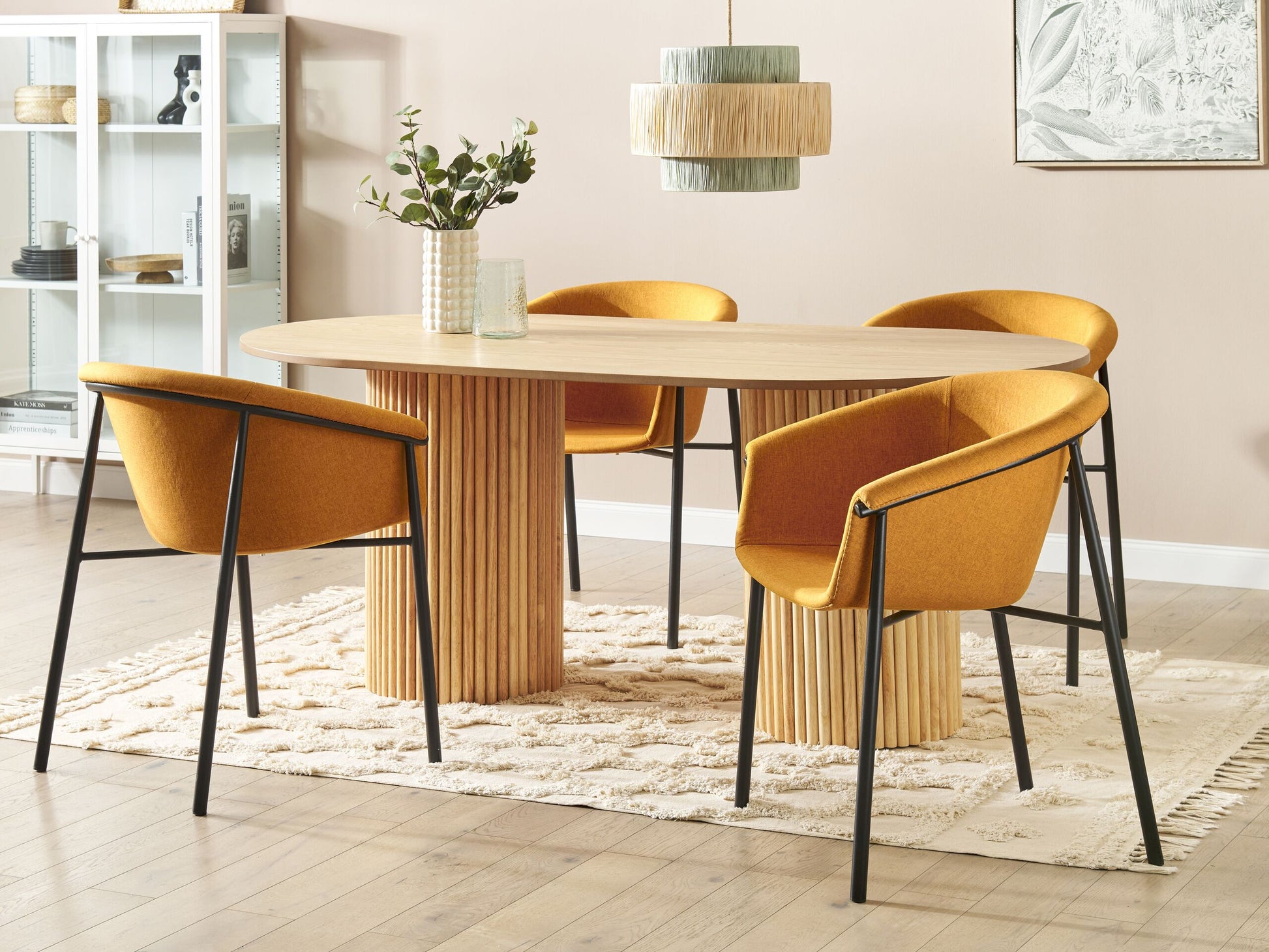 Verschönern Sie Ihren Essbereich mit diesen zwei trendigen, gepolsterten Stühlen und zaubern Sie sich eine luxuriöse Atmosphäre in den Raum. Sie zeichnen sich durch eine sehr bequeme, tiefe Sitzfläche aus, die mit einem hochwertigen und weichen Stoff bezogen ist. Diese wird durch das schwarze Eisengestell perfekt ergänzt. Beide Küchenstühle sind nicht nur bequem, sondern auch sehr stilvoll und passen zu vielen Einrichtungsstilen. Die Stoffpolsterung und die Metallbeine sind besonders pflegeleicht, so wird Ihnen das Set auch beim geringen Pflegeaufwand über viele Jahre lang gute Dienste erweisen. Material: Polyester. Zusätzliches Material: Eisen. Material Zusammensetzung: 100% Polyester Gewicht: 8 Montage: Beine / Füsse nicht montiert Gewichtskapazität: 120 Sitzhöhe: 45 Das Angebot beinhaltet: 2 x Stühle Sitzfläche: 40x43 Höhe: 80 zusätzliche Information: Um sicherzustellen, dass die Konstruktion stabil und die Nutzungssicherheit gewährleistet ist, sollte man 2 Wochen nach dem Zusammenbau überprüfen, ob die Ware auch korrekt montiert wurde. Ausserdem ist alle 3 Monate zu prüfen, ob die Schrauben richtig festgezogen sind. Breite: 57 Tiefe: 56 Art: Esszimmerstuhl 2er Set Stil: Retro Allgemeine Farbe: Orange Hauptmaterial: Polyester