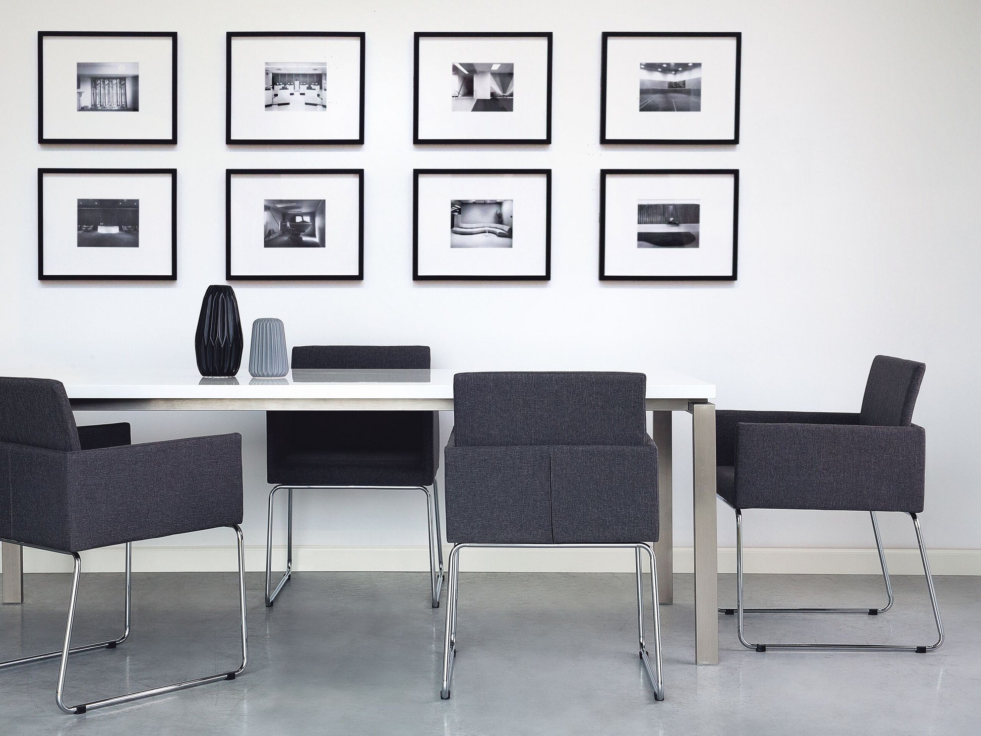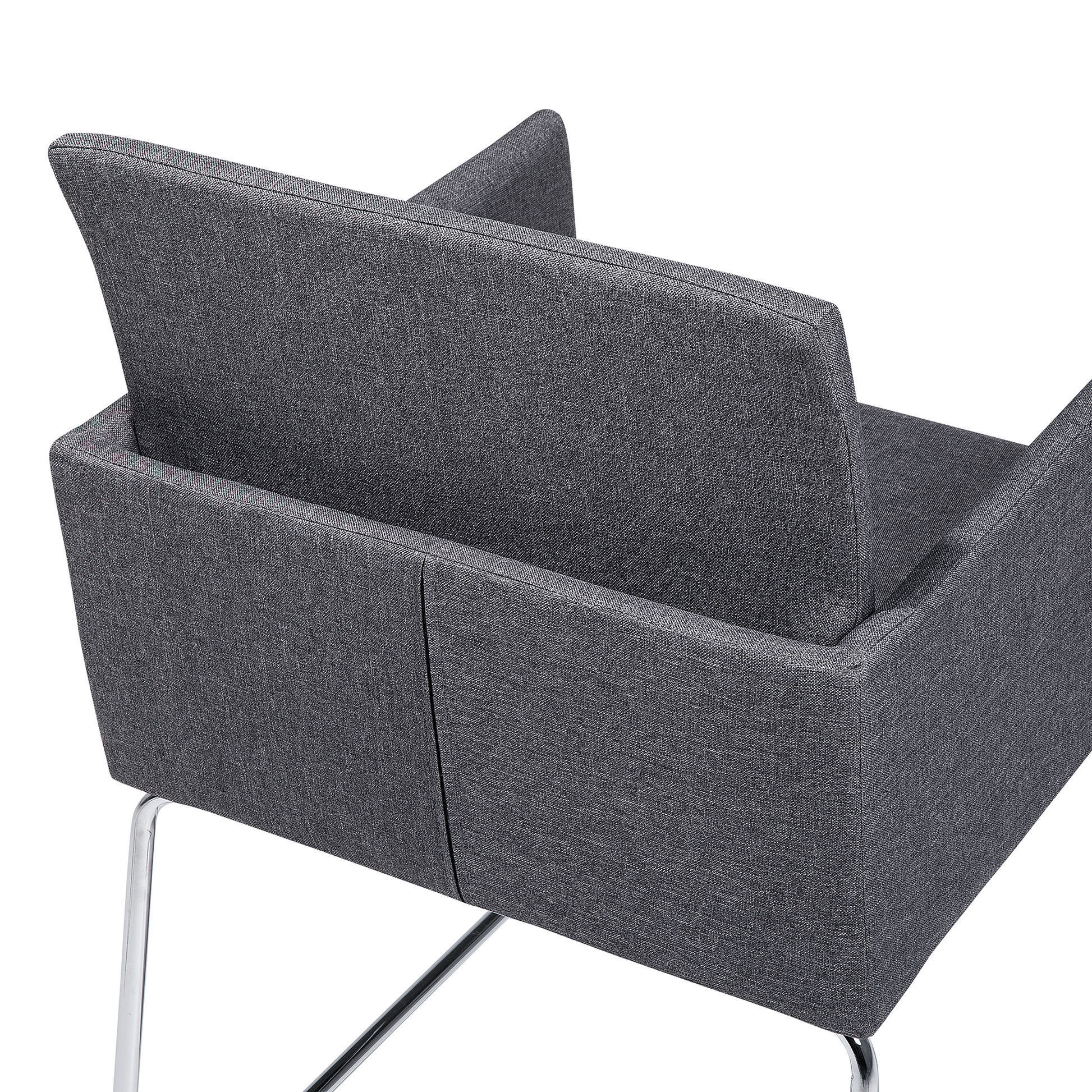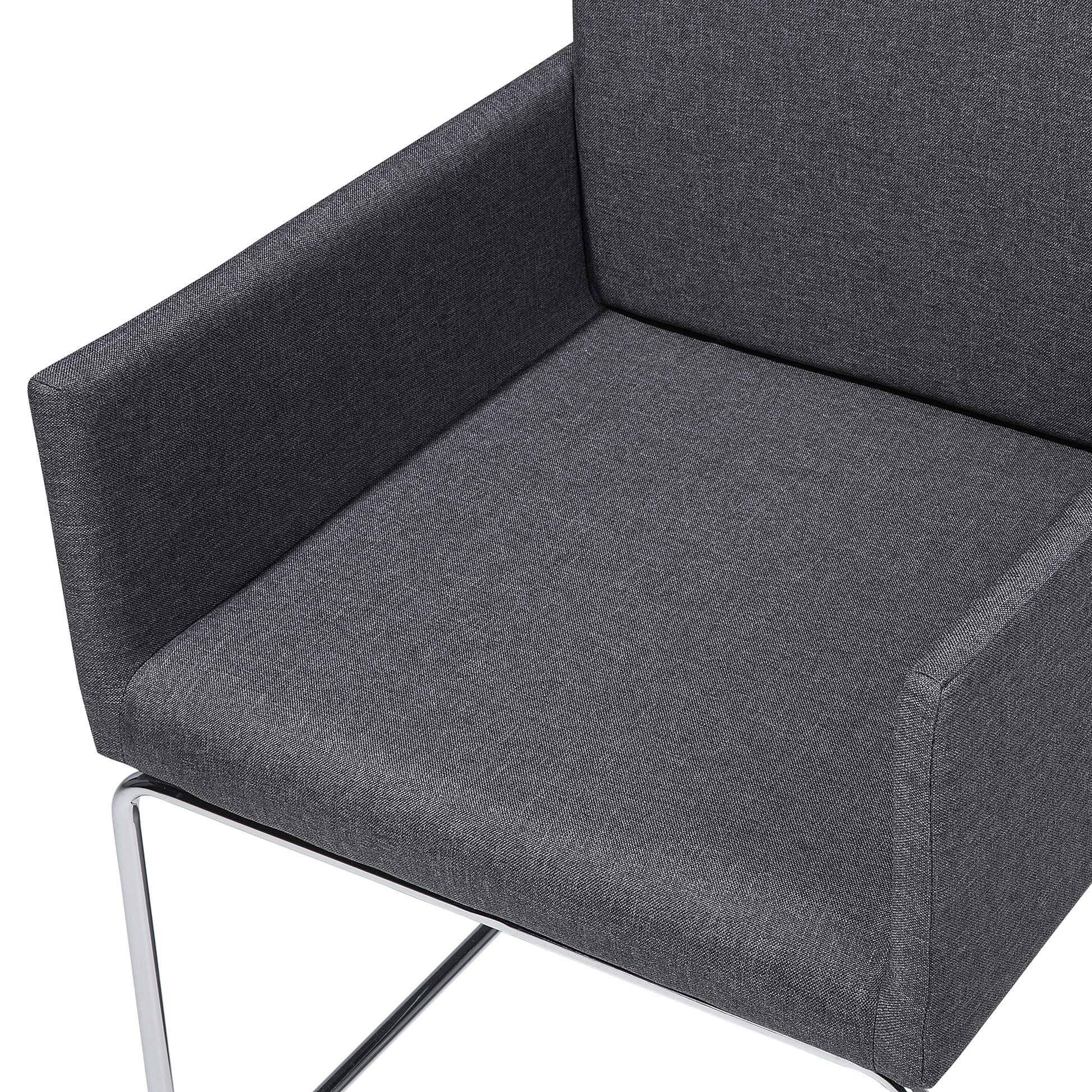 Die angenehm gepolsterten Sitzschalen der Stühle verfügen über einen hochwertigen und strapazierfähigen Bezug aus Polyester in der Farbe Dunkelgrau. Sie ruhen auf schlanken Kufen aus verchromtem Metall, die einen rutschfesten Stand bieten. Dank der perfekt geformten Armlehnen sind die Stühle so bequem wie Sessel. Sie bieten vielseitige Nutzungsmöglichkeiten für alle Wohn- und Arbeitsbereiche und machen sich in Ihrer behaglichen Essecke genau so gut wie in einem Konferenzraum. Material: Polyester. Zusätzliches Material: Metall. Material Zusammensetzung: 100% Polyester Gewicht: 10 Montage: Teilweise montiert Gewichtskapazität: 120 Polsterstärke: 7 Sitzhöhe: 47 Das Angebot beinhaltet: 2 x Stühle Sitzfläche: 54x47 Höhe: 81 zusätzliche Information: Um sicherzustellen, dass die Konstruktion stabil und die Nutzungssicherheit gewährleistet ist, sollte man 2 Wochen nach dem Zusammenbau überprüfen, ob die Ware auch korrekt montiert wurde. Ausserdem ist alle 3 Monate zu prüfen, ob die Schrauben richtig festgezogen sind. Breite: 54 Tiefe: 58 Art: Esszimmerstuhl Stil: Klassisch Allgemeine Farbe: Grau Schatten: Dunkelgrau Hauptmaterial: Polyester