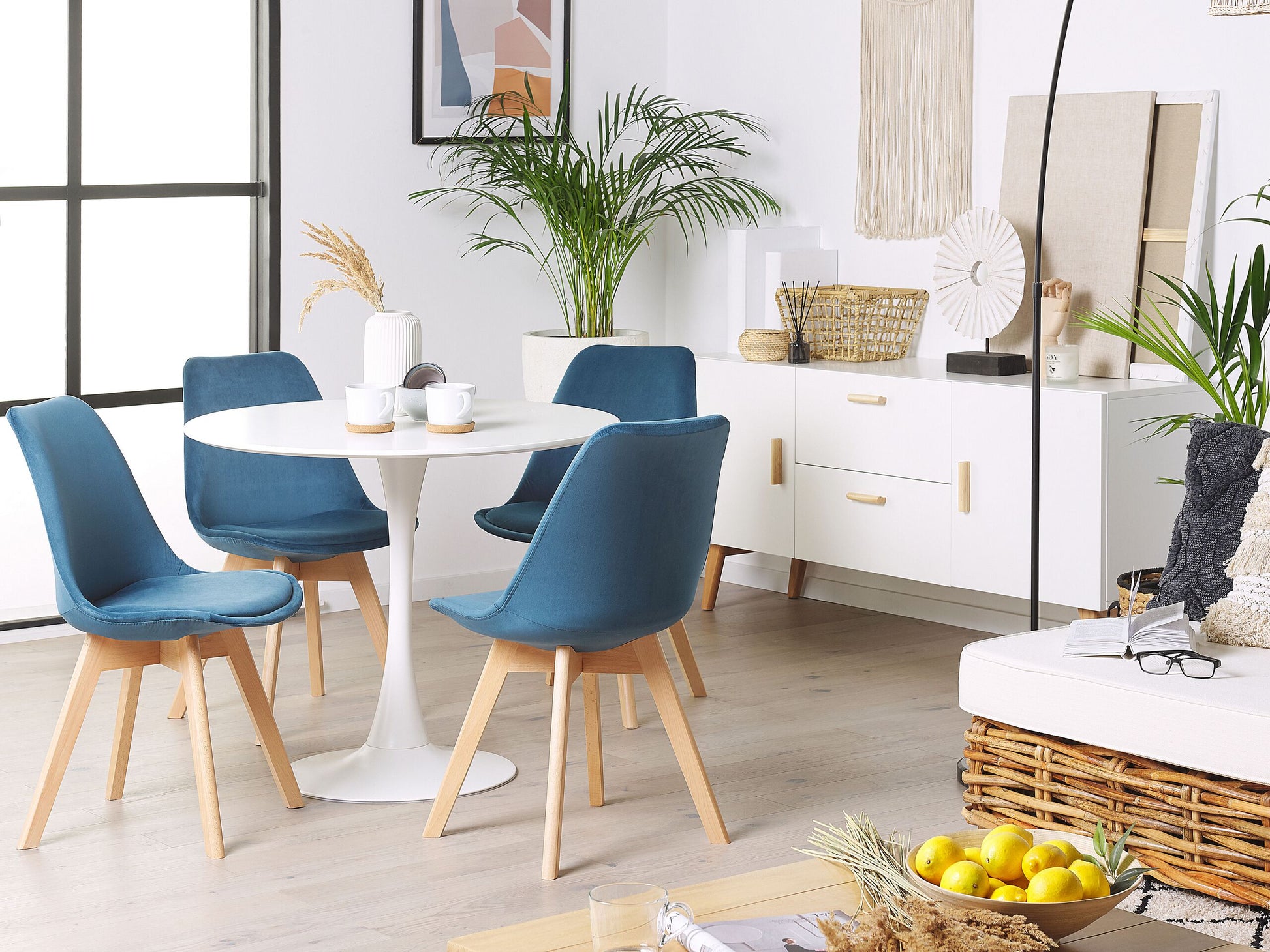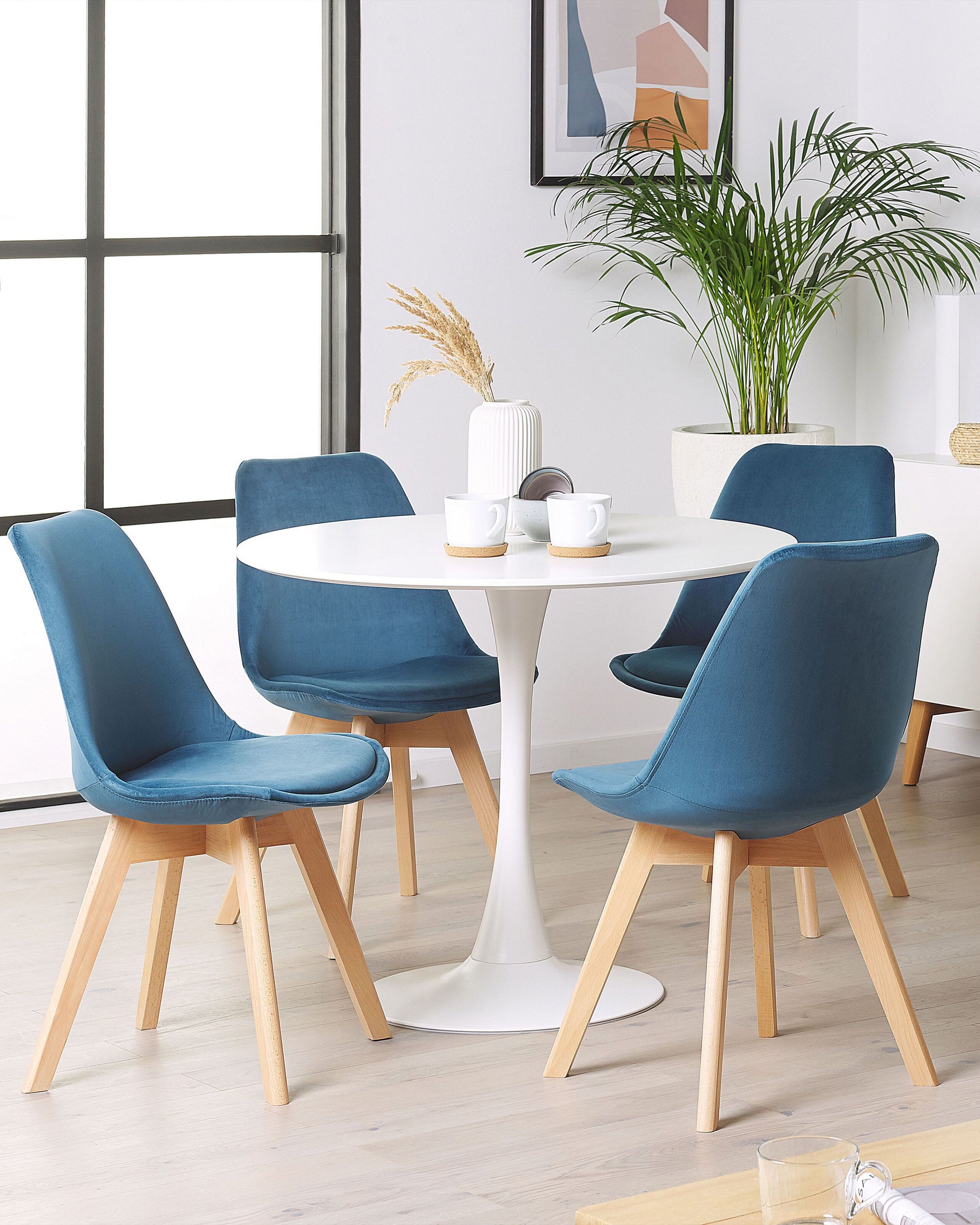 Die praktischen Stühle im angesagten Retro Design bieten mit ihrem hohen Sitzkomfort und ihrer schönen Farbkombination aus hellem Buchenholz mit ellegantem Blau vielseitige Nutzungsmöglichkeiten für alle Wohn- und Arbeitsbereiche. Die angenehm gepolsterten Sitzflächen aus hochwertigem Samtstoff in Blau laden zum entspannten Sitzen am Esstisch ein. Robuste, leicht schräg stehende Stuhlbeine sorgen für stabilen Stand. Material: Samtstoff. Zusätzliches Material: Buchenholz. Material Zusammensetzung: 100% Polyester Gewicht: 4 Montage: Beine / Füsse nicht montiert Holzart: Fagus Sylvatica Holzursprung: China Gewichtskapazität: 120 Sitzhöhe: 48 Das Angebot beinhaltet: 2 x Stühle Sitzfläche: 40x40 Höhe: 82 zusätzliche Information: Um sicherzustellen, dass die Konstruktion stabil und die Nutzungssicherheit gewährleistet ist, sollte man 2 Wochen nach dem Zusammenbau überprüfen, ob die Ware auch korrekt montiert wurde. Ausserdem ist alle 3 Monate zu prüfen, ob die Schrauben richtig festgezogen sind., Bitte beachten Sie, dass Samtstoff unter verschiedenen Lichtverhältnissen eine andere Optik haben kann – das Material schimmert bei Tageslicht stärker und wirkt bei künstlicher Beleuchtung in Innenräumen eher gedämpft. Aufgrund der glatten, hochdichten Struktur des Gewebes kann sein Farbton auch variieren, wenn man mit der Hand in verschiedene Richtungen und Winkel über den Stoff fährt. Um den Farbton auszugleichen und Druckstellen zu vermeiden, sollte der Webstoff sanft mit einer offenen Handfläche in eine Richtung gestrichen, mit einem feuchten Tuch abgewischt oder einem Dampfbügeleisen gebügelt werden. Breite: 47 Tiefe: 57 Art: Esszimmerstuhl 2er Set Stil: Modern Allgemeine Farbe: Blau Hauptmaterial: Samtstoff