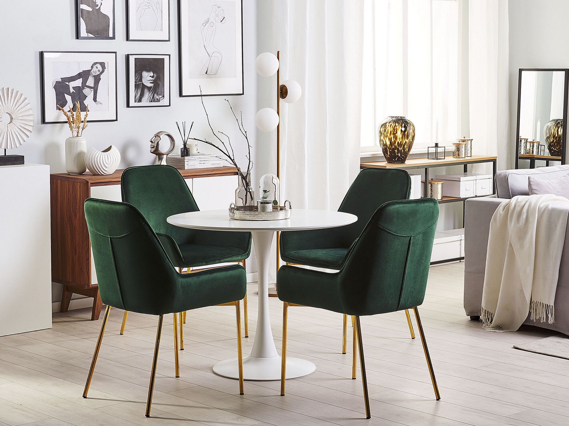 Ein edles Möbelstück für Ihren Wohn-, Schlaf- und Essbereich. Die hochwertige Polsterung mit samtig weichen Finish sowie die elegante, dunkelgrüne Farbe machen diesen Stuhl zu etwas ganz Besonderem. Die vier, goldenen und schmalen Füsse geben dem Stuhl genügend Halt und runden das Design stilvoll ab. Material: Samtstoff. Zusätzliches Material: Metall. Material Zusammensetzung: 100% Polyester Gewicht: 7 Montage: Beine / Füsse nicht montiert Gewichtskapazität: 120 Polsterstärke: 5 Sitzhöhe: 48 Das Angebot beinhaltet: 2 x Stühle Sitzfläche: 46x41 Höhe: 89 zusätzliche Information: Um sicherzustellen, dass die Konstruktion stabil und die Nutzungssicherheit gewährleistet ist, sollte man 2 Wochen nach dem Zusammenbau überprüfen, ob die Ware auch korrekt montiert wurde. Ausserdem ist alle 3 Monate zu prüfen, ob die Schrauben richtig festgezogen sind., Bitte beachten Sie, dass Samtstoff unter verschiedenen Lichtverhältnissen eine andere Optik haben kann – das Material schimmert bei Tageslicht stärker und wirkt bei künstlicher Beleuchtung in Innenräumen eher gedämpft. Aufgrund der glatten, hochdichten Struktur des Gewebes kann sein Farbton auch variieren, wenn man mit der Hand in verschiedene Richtungen und Winkel über den Stoff fährt. Um den Farbton auszugleichen und Druckstellen zu vermeiden, sollte der Webstoff sanft mit einer offenen Handfläche in eine Richtung gestrichen, mit einem feuchten Tuch abgewischt oder einem Dampfbügeleisen gebügelt werden. Breite: 56 Tiefe: 59 Art: Esszimmerstuhl 2er Set Stil: Modern Allgemeine Farbe: Grün Schatten: Dunkelgrün Hauptmaterial: Samtstoff