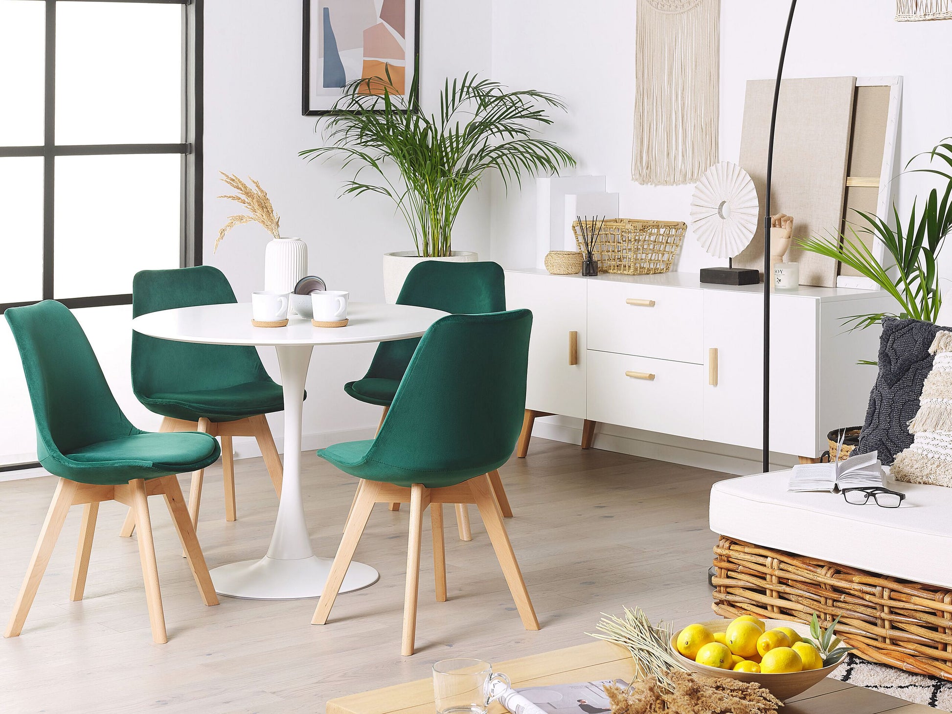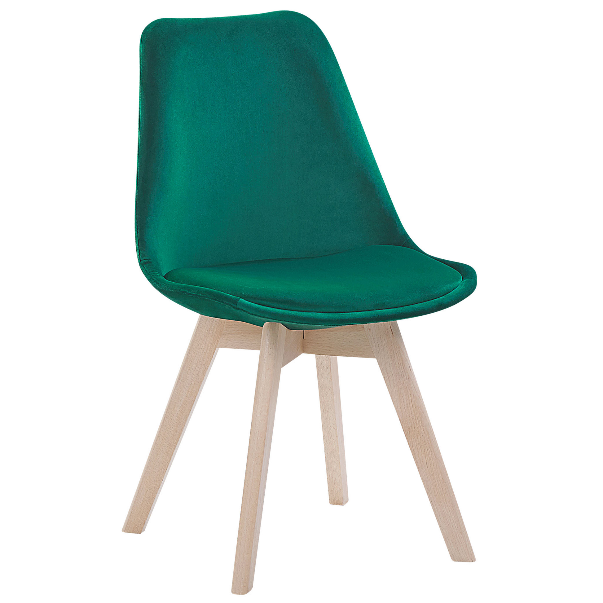 Die praktischen Stühle im angesagten Retro Design bieten mit ihrem hohen Sitzkomfort und ihrer schönen Farbkombination aus hellem Buchenholz mit ellegantem Grün vielseitige Nutzungsmöglichkeiten für alle Wohn- und Arbeitsbereiche. Die angenehm gepolsterten Sitzflächen aus hochwertigem Samtstoff in Grün laden zum entspannten Sitzen am Esstisch ein. Robuste, leicht schräg stehende Stuhlbeine sorgen für stabilen Stand. Material: Samtstoff. Zusätzliches Material: Buchenholz. Material Zusammensetzung: 100% Polyester Gewicht: 4 Montage: Beine / Füsse nicht montiert Holzart: Fagus Sylvatica Holzursprung: China Gewichtskapazität: 120 Sitzhöhe: 46 Das Angebot beinhaltet: 2 x Stühle Sitzfläche: 40x40 Höhe: 82 zusätzliche Information: Um sicherzustellen, dass die Konstruktion stabil und die Nutzungssicherheit gewährleistet ist, sollte man 2 Wochen nach dem Zusammenbau überprüfen, ob die Ware auch korrekt montiert wurde. Ausserdem ist alle 3 Monate zu prüfen, ob die Schrauben richtig festgezogen sind., Bitte beachten Sie, dass Samtstoff unter verschiedenen Lichtverhältnissen eine andere Optik haben kann – das Material schimmert bei Tageslicht stärker und wirkt bei künstlicher Beleuchtung in Innenräumen eher gedämpft. Aufgrund der glatten, hochdichten Struktur des Gewebes kann sein Farbton auch variieren, wenn man mit der Hand in verschiedene Richtungen und Winkel über den Stoff fährt. Um den Farbton auszugleichen und Druckstellen zu vermeiden, sollte der Webstoff sanft mit einer offenen Handfläche in eine Richtung gestrichen, mit einem feuchten Tuch abgewischt oder einem Dampfbügeleisen gebügelt werden. Breite: 47 Tiefe: 57 Art: Esszimmerstuhl Stil: Modern Allgemeine Farbe: Grün Hauptmaterial: Samtstoff