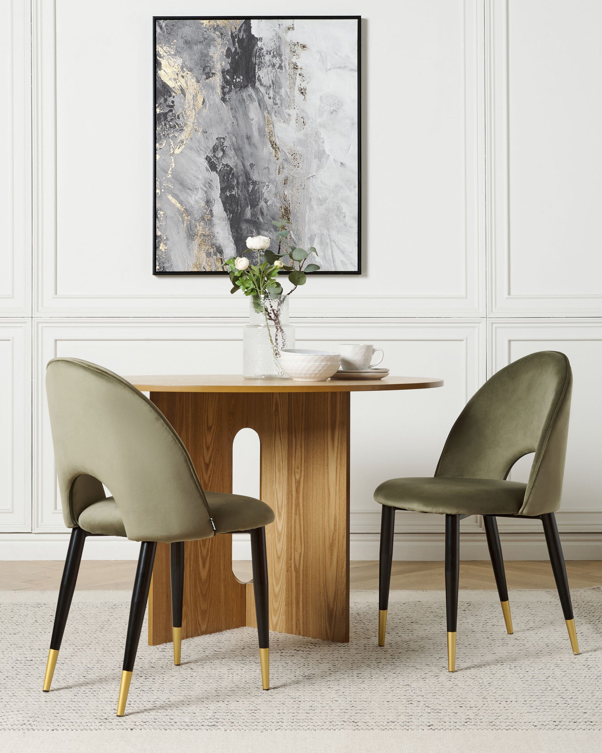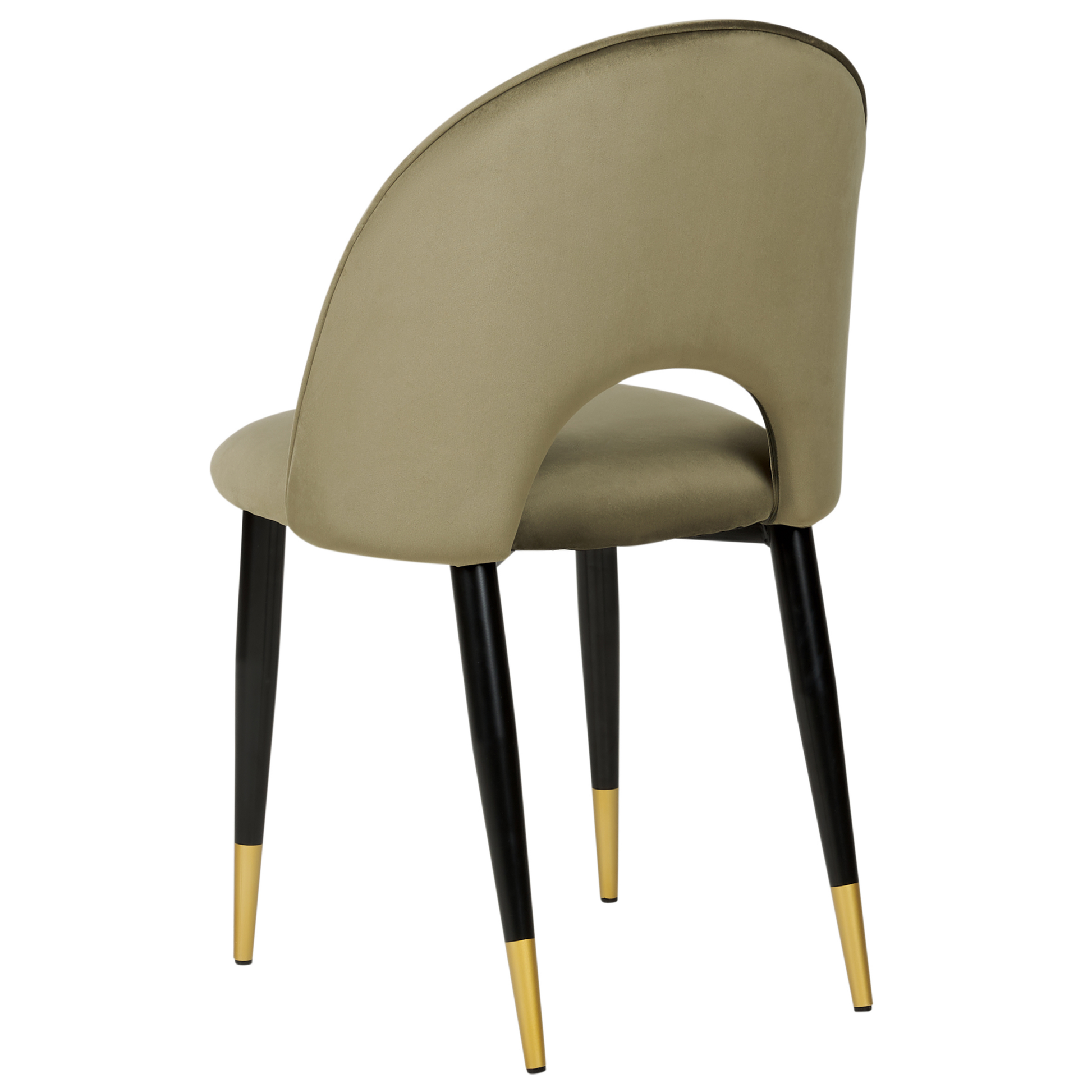 Die halbrunde, edle Rückenlehne und die breite, komfortable Sitzfläche machen diesen Stuhl zum perfekten Möbelstück für Ihren Wohnbereich. Seine vier schwarzen Metallbeine wurden am Ende mit einer goldfarbenen Pulverbeschichtung verziert, welche dem Gesamtbild noch mehr Stil und Eleganz verleiht. Dank der samtig weichen Polsterung ist dieses Modell nicht nur bequem, aber vor allem eine hübsche Bereicherung für Ihre Inneneinrichtung. Material: Samtstoff. Zusätzliches Material: Eisen, Sperrholz. Material Zusammensetzung: 100% Polyester Gewicht: 6 Montage: Beine / Füsse nicht montiert Gewichtskapazität: 120 Polsterstärke: 6 Sitzhöhe: 48 Das Angebot beinhaltet: 2 x Stühle Sitzfläche: 47x45 Höhe: 84 zusätzliche Information: Um sicherzustellen, dass die Konstruktion stabil und die Nutzungssicherheit gewährleistet ist, sollte man 2 Wochen nach dem Zusammenbau überprüfen, ob die Ware auch korrekt montiert wurde. Ausserdem ist alle 3 Monate zu prüfen, ob die Schrauben richtig festgezogen sind., Bitte beachten Sie, dass Samtstoff unter verschiedenen Lichtverhältnissen eine andere Optik haben kann – das Material schimmert bei Tageslicht stärker und wirkt bei künstlicher Beleuchtung in Innenräumen eher gedämpft. Aufgrund der glatten, hochdichten Struktur des Gewebes kann sein Farbton auch variieren, wenn man mit der Hand in verschiedene Richtungen und Winkel über den Stoff fährt. Um den Farbton auszugleichen und Druckstellen zu vermeiden, sollte der Webstoff sanft mit einer offenen Handfläche in eine Richtung gestrichen, mit einem feuchten Tuch abgewischt oder einem Dampfbügeleisen gebügelt werden. Breite: 47 Tiefe: 45 Art: Esszimmerstuhl 2er Set Stil: Glamourös Allgemeine Farbe: Grün Schatten: Olivgrün Hauptmaterial: Samtstoff