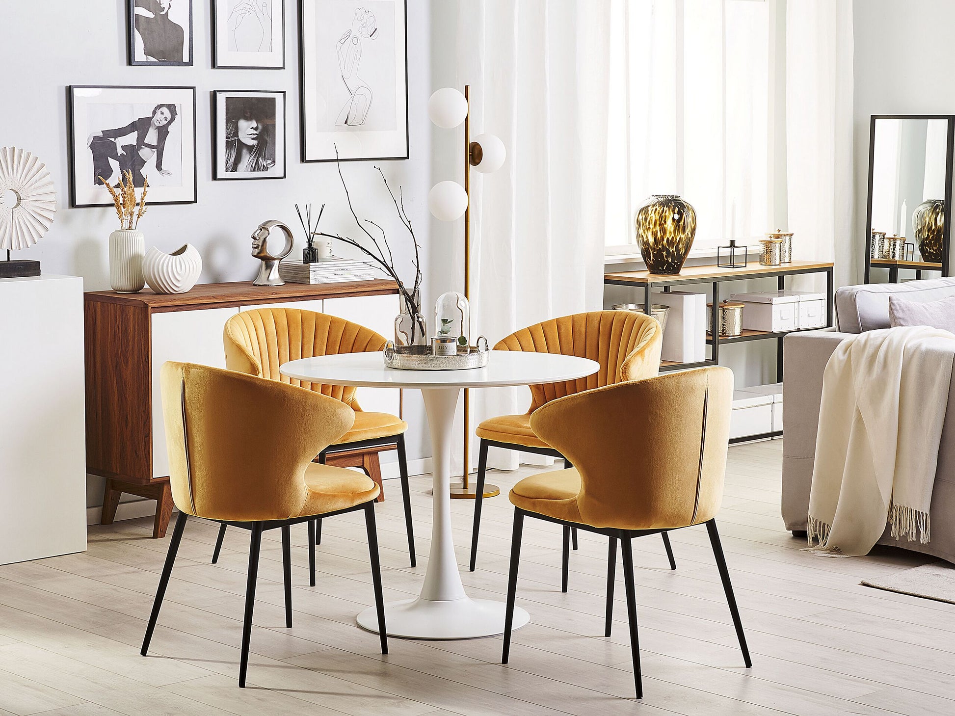 Die langen, schmalen Beine in Schwarz harmonieren wunderbar mit der weichen Polsterung in intensivem Senfgelb und verleihen diesen Essstühlen eine stilvolle Optik. Die halbrunde Rückenlehne besitzt zusätzlich eine sehr dekorative Steppung, die dieses Set umso eleganter macht. Setzen Sie diese Polsterstühle im Schlafzimmer neben Ihren Schminktisch ein, stellen Sie sie im Wohnzimmer auf oder nutzen Sie sie als zusätzlichen Sitzplatz im Esszimmer. Material: Samtstoff. Zusätzliches Material: Metall. Material Zusammensetzung: 100% Polyester Gewicht: 9 Montage: Beine / Füsse nicht montiert Gewichtskapazität: 120 Polsterstärke: 7 Sitzhöhe: 50 Das Angebot beinhaltet: 2 x Stühle Sitzfläche: 50x45 Höhe: 81 zusätzliche Information: Um sicherzustellen, dass die Konstruktion stabil und die Nutzungssicherheit gewährleistet ist, sollte man 2 Wochen nach dem Zusammenbau überprüfen, ob die Ware auch korrekt montiert wurde. Ausserdem ist alle 3 Monate zu prüfen, ob die Schrauben richtig festgezogen sind., Bitte beachten Sie, dass Samtstoff unter verschiedenen Lichtverhältnissen eine andere Optik haben kann – das Material schimmert bei Tageslicht stärker und wirkt bei künstlicher Beleuchtung in Innenräumen eher gedämpft. Aufgrund der glatten, hochdichten Struktur des Gewebes kann sein Farbton auch variieren, wenn man mit der Hand in verschiedene Richtungen und Winkel über den Stoff fährt. Um den Farbton auszugleichen und Druckstellen zu vermeiden, sollte der Webstoff sanft mit einer offenen Handfläche in eine Richtung gestrichen, mit einem feuchten Tuch abgewischt oder einem Dampfbügeleisen gebügelt werden. Breite: 59 Tiefe: 50 Art: Esszimmerstuhl 2er Set Stil: Modern Allgemeine Farbe: Gelb Schatten: Senfgelb Hauptmaterial: Samtstoff