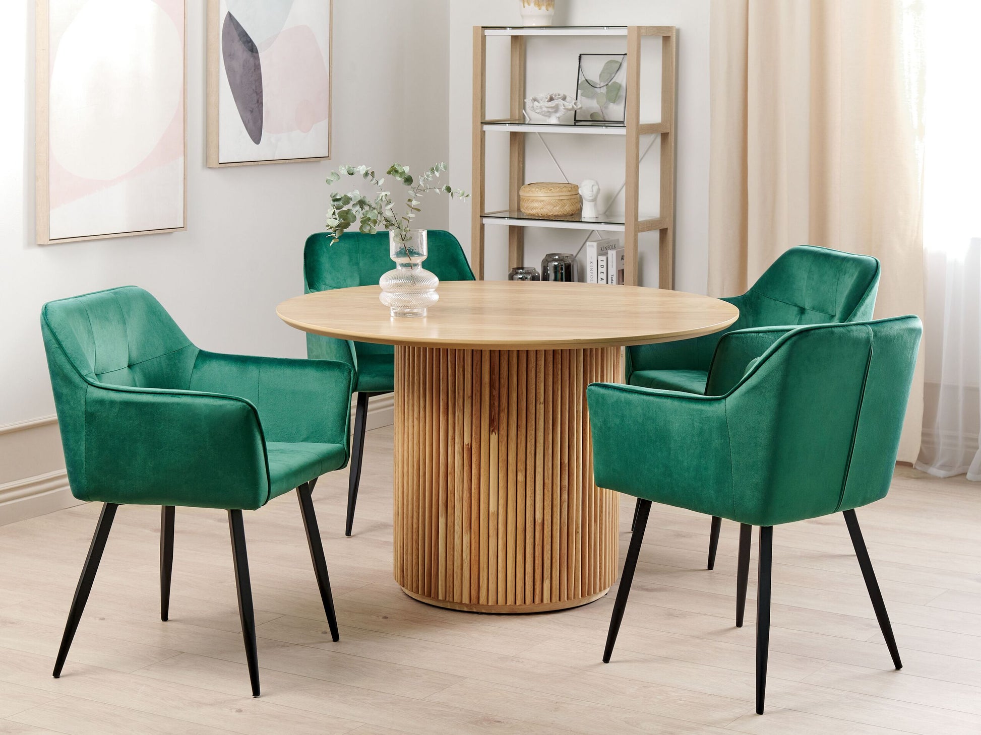 Das minimalistische und zugleich luxuriöse Design der Stühle besticht durch einen zeitlosen Look. Die klaren Linien der Sitze werden durch den Samtbezug in der Farbe Smaragdgrün und die filigranen Details betont. Die zarte Textur und der edle Farbton bringen Eleganz in jeden Raum und lockern gekonnt den Stil auf. Abgerundet mit schlanken Metallbeinen, passt der Stuhl wunderbar zu einem Esstisch sowie in ein Schlafzimmer oder eine Hausbibliothek. Material: Samtstoff. Zusätzliches Material: Eisen, Sperrholz. Material Zusammensetzung: 100% Polyester Gewicht: 9 Montage: Beine / Füsse nicht montiert Gewichtskapazität: 120 Polsterstärke: 5 Sitzhöhe: 45 Das Angebot beinhaltet: 2 x Stühle Sitzfläche: 40x45 Höhe: 91 zusätzliche Information: Um sicherzustellen, dass die Konstruktion stabil und die Nutzungssicherheit gewährleistet ist, sollte man 2 Wochen nach dem Zusammenbau überprüfen, ob die Ware auch korrekt montiert wurde. Ausserdem ist alle 3 Monate zu prüfen, ob die Schrauben richtig festgezogen sind., Bitte beachten Sie, dass Samtstoff unter verschiedenen Lichtverhältnissen eine andere Optik haben kann – das Material schimmert bei Tageslicht stärker und wirkt bei künstlicher Beleuchtung in Innenräumen eher gedämpft. Aufgrund der glatten, hochdichten Struktur des Gewebes kann sein Farbton auch variieren, wenn man mit der Hand in verschiedene Richtungen und Winkel über den Stoff fährt. Um den Farbton auszugleichen und Druckstellen zu vermeiden, sollte der Webstoff sanft mit einer offenen Handfläche in eine Richtung gestrichen, mit einem feuchten Tuch abgewischt oder einem Dampfbügeleisen gebügelt werden. Breite: 60 Tiefe: 49 Art: Esszimmerstuhl 2er Set Stil: Modern Allgemeine Farbe: Grün Schatten: Smaragdgrün Hauptmaterial: Samtstoff