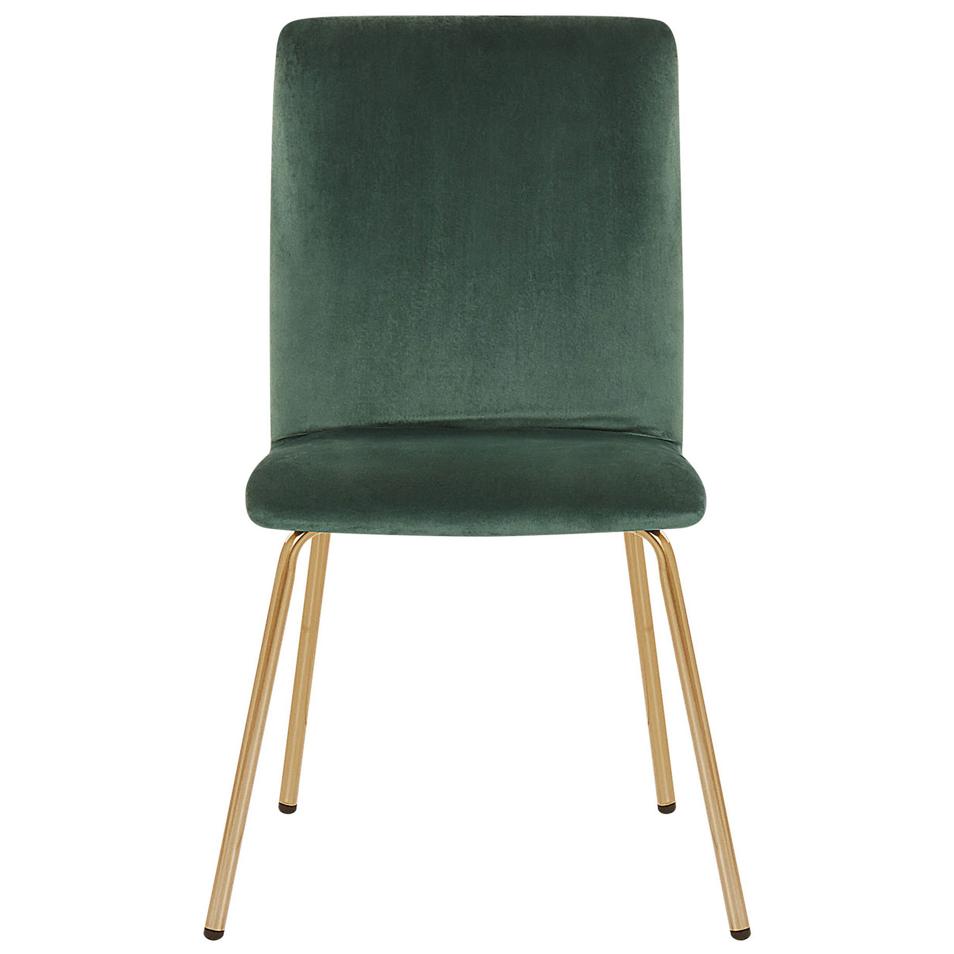 Dieses Stuhl-Set ist sowohl elegant wie auch wohnlich und verspricht dabei einen besonderen Hauch an Luxus im Raum! Die formschönen Sitzflächen und Rückenlehnen sind komplett in feinen, angenehmen Samtstoff gehüllt und sorgen für ein komfortables Sitzen an jedem Salon-, Esszimmer- oder Schreibtisch. Der tiefe Farbton der smaragdgrünen Polsterung wird durch stilvolle, schlanke Metallbeine in Gold-Optik wunderschön betont. Material: Samtstoff. Zusätzliches Material: Sperrholz, Metall. Material Zusammensetzung: 100% Polyester Gewicht: 5 Montage: Beine / Füsse nicht montiert Gewichtskapazität: 130 Polsterstärke: 5 Sitzhöhe: 39 Das Angebot beinhaltet: 2 x Stühle Sitzfläche: 42x39 Höhe: 80 zusätzliche Information: Um sicherzustellen, dass die Konstruktion stabil und die Nutzungssicherheit gewährleistet ist, sollte man 2 Wochen nach dem Zusammenbau überprüfen, ob die Ware auch korrekt montiert wurde. Ausserdem ist alle 3 Monate zu prüfen, ob die Schrauben richtig festgezogen sind., Bitte beachten Sie, dass Samtstoff unter verschiedenen Lichtverhältnissen eine andere Optik haben kann – das Material schimmert bei Tageslicht stärker und wirkt bei künstlicher Beleuchtung in Innenräumen eher gedämpft. Aufgrund der glatten, hochdichten Struktur des Gewebes kann sein Farbton auch variieren, wenn man mit der Hand in verschiedene Richtungen und Winkel über den Stoff fährt. Um den Farbton auszugleichen und Druckstellen zu vermeiden, sollte der Webstoff sanft mit einer offenen Handfläche in eine Richtung gestrichen, mit einem feuchten Tuch abgewischt oder einem Dampfbügeleisen gebügelt werden. Breite: 47 Tiefe: 41 Art: Esszimmerstuhl 2er Set Stil: Modern Allgemeine Farbe: Grün Schatten: Smaragdgrün Hauptmaterial: Samtstoff