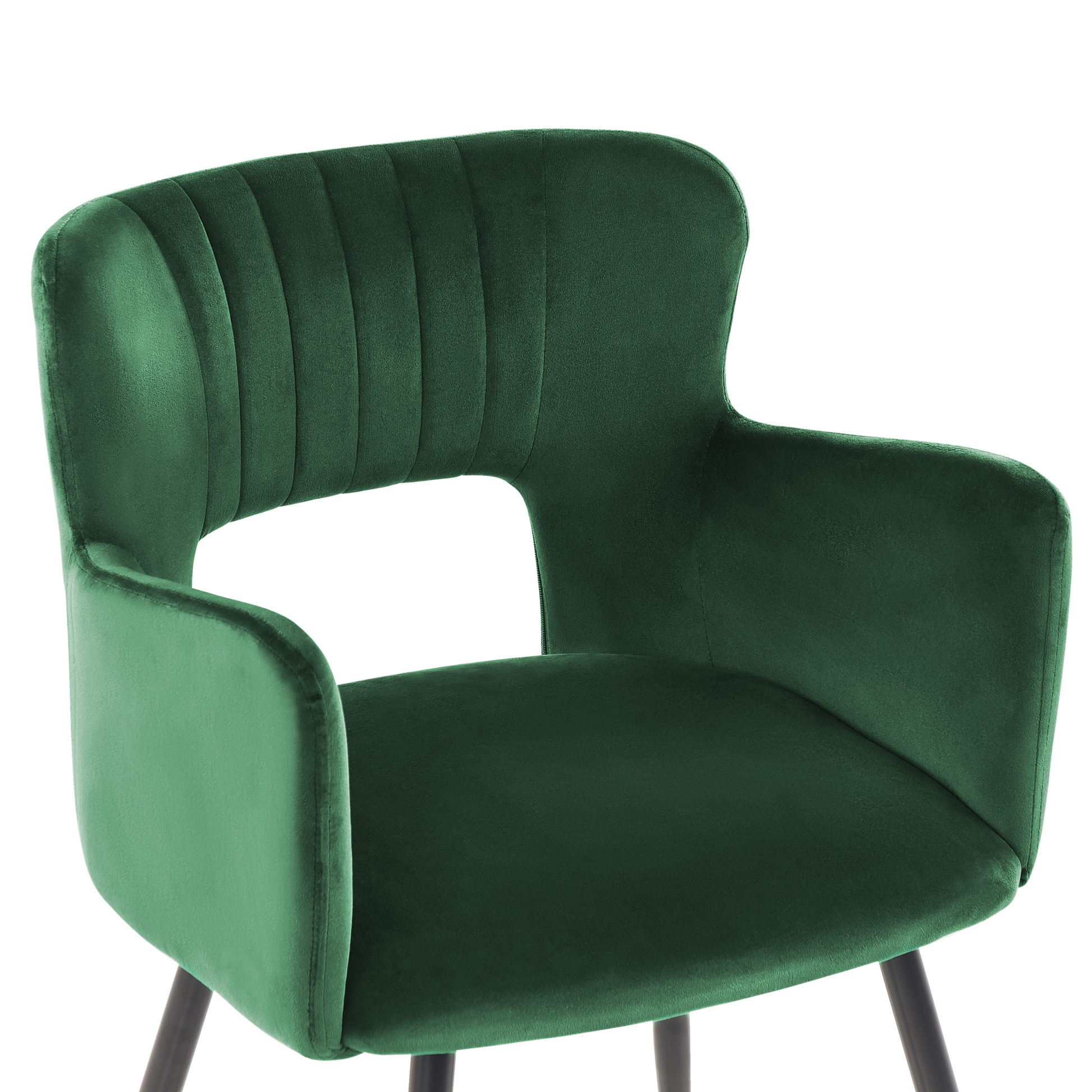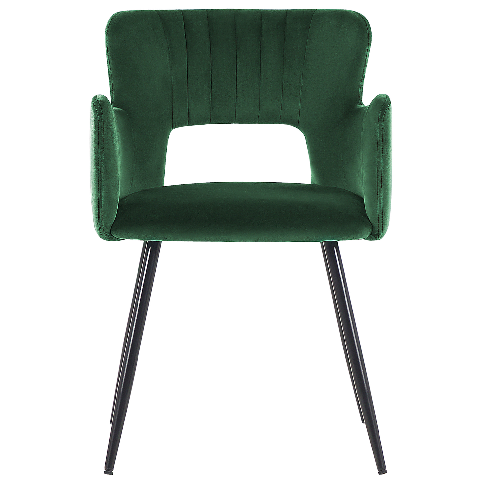 Ein Stuhl in klassischen Farben mit moderner Ausführung – die interessant geformte Rückenlehne und die samtig weiche Polsterung schaffen ein harmonisches Ganzes und machen den Stuhl zum universellen Begleiter zu Ihrem Ess- oder Schreibtisch. Die vier schmalen und dennoch stabilen Füsse, sind aus pulverbeschichtetem Metall gefertigt und verleihen dem Möbelstück eine hübsche Leichtigkeit. Material: Samtstoff. Zusätzliches Material: Eisen. Material Zusammensetzung: 100% Polyester Gewicht: 6 Montage: Beine / Füsse nicht montiert Gewichtskapazität: 120 Polsterstärke: 4 Sitzhöhe: 43 Das Angebot beinhaltet: 2 x Stühle Sitzfläche: 43x44 Höhe: 75 zusätzliche Information: Um sicherzustellen, dass die Konstruktion stabil und die Nutzungssicherheit gewährleistet ist, sollte man 2 Wochen nach dem Zusammenbau überprüfen, ob die Ware auch korrekt montiert wurde. Ausserdem ist alle 3 Monate zu prüfen, ob die Schrauben richtig festgezogen sind., Bitte beachten Sie, dass Samtstoff unter verschiedenen Lichtverhältnissen eine andere Optik haben kann – das Material schimmert bei Tageslicht stärker und wirkt bei künstlicher Beleuchtung in Innenräumen eher gedämpft. Aufgrund der glatten, hochdichten Struktur des Gewebes kann sein Farbton auch variieren, wenn man mit der Hand in verschiedene Richtungen und Winkel über den Stoff fährt. Um den Farbton auszugleichen und Druckstellen zu vermeiden, sollte der Webstoff sanft mit einer offenen Handfläche in eine Richtung gestrichen, mit einem feuchten Tuch abgewischt oder einem Dampfbügeleisen gebügelt werden. Breite: 52 Tiefe: 44 Art: Esszimmerstuhl 2er Set Stil: Modern Allgemeine Farbe: Grün Schatten: Smaragdgrün Hauptmaterial: Samtstoff