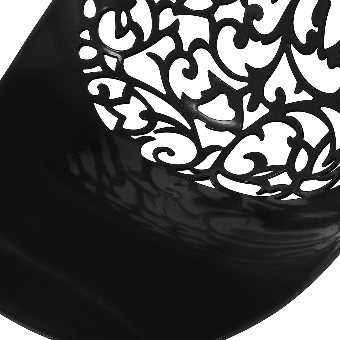 Das Set kombiniert ein stabiles, glänzend verchromtes Gestell mit 4 schlanken Beinen mit einer bequem geformten Sitzschale aus schwarzem Kunststoff mit raffinierten und filigranen Ausschnitten in der Rückenlehne. So sind die Stühle nicht nur komfortabel, handlich, praktisch und stapelbar, sondern auch optisch ein Gewinner! Und er kann sowohl als Esszimmerstuhl, Küchenstuhl, Arbeits- oder Schreibtischstuhl, sowie auch in Büro- und Konferenzräumen zum Einsatz kommen. Material: Kunststoff. Zusätzliches Material: Metall. Gewicht: 4 Montage: Teilweise montiert Gewichtskapazität: 100 Sitzhöhe: 42 Das Angebot beinhaltet: 4 x Stühle Sitzfläche: 50x42 Höhe: 80 zusätzliche Information: Um sicherzustellen, dass die Konstruktion stabil und die Nutzungssicherheit gewährleistet ist, sollte man 2 Wochen nach dem Zusammenbau überprüfen, ob die Ware auch korrekt montiert wurde. Ausserdem ist alle 3 Monate zu prüfen, ob die Schrauben richtig festgezogen sind. Breite: 62 Tiefe: 43 Art: Esszimmerstuhl 4er Set Stil: Modern Allgemeine Farbe: Schwarz Hauptmaterial: Kunststoff
