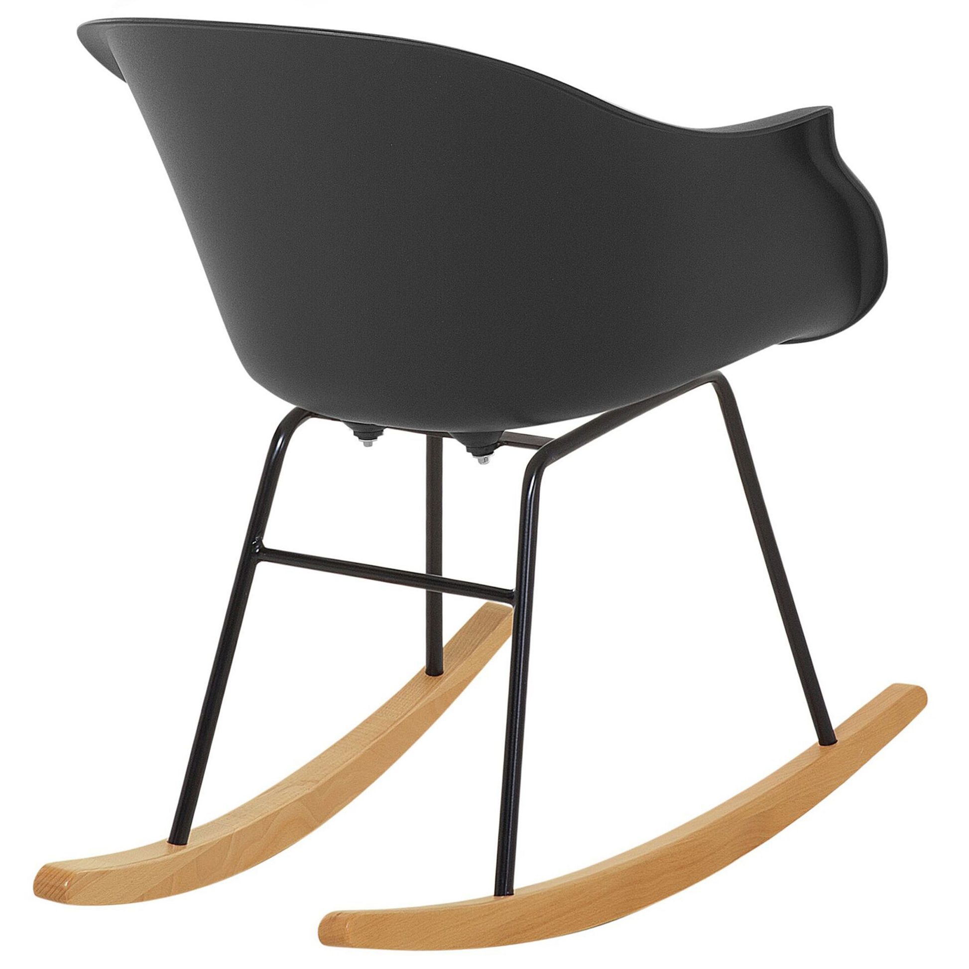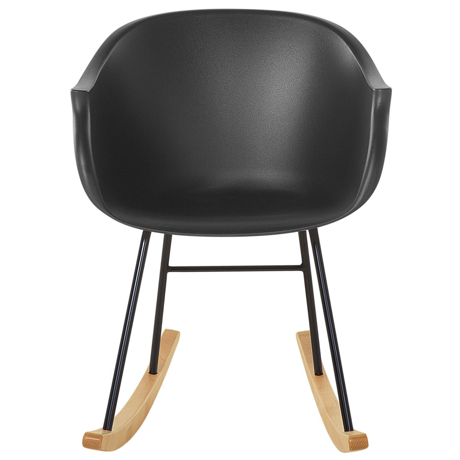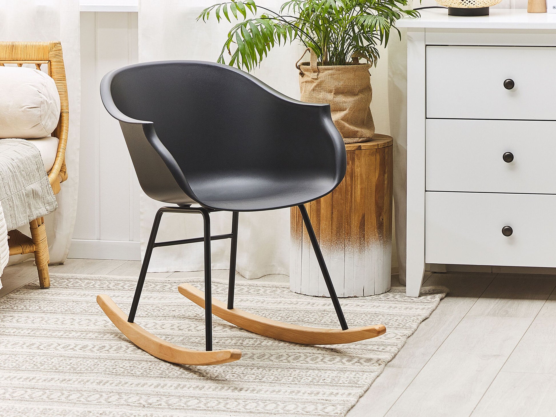 Der Stuhl ist eine fröhliche Neuinterpretation des klassischen, gemütlichen Schaukelstuhls aus der guten, alten Zeit. Dank der angenehm geschwungenen Rücken- und Armlehnen ist der Stuhl bequem wie ein Sessel und sorgt für entspannten Sitzkomfort. Die schwarze Sitzschale ist aus hochwertigem und strapazierfähigem Kunststoff gefertigt. Das schlanke und stabile Metallgestell steht auf naturfarbenen Kufen aus robustem, recyceltem Holz. Material: Polypropylen. Zusätzliches Material: Metall, Buchenholz. Gewicht: 8 Montage: Beine / Füsse nicht montiert Holzart: Fagus Sylvatica Holzursprung: China Gewichtskapazität: 100 Sitzhöhe: 41 Das Angebot beinhaltet: 1 x Sessel Sitzfläche: 40x40 Höhe: 73 zusätzliche Information: Um sicherzustellen, dass die Konstruktion stabil und die Nutzungssicherheit gewährleistet ist, sollte man 2 Wochen nach dem Zusammenbau überprüfen, ob die Ware auch korrekt montiert wurde. Ausserdem ist alle 3 Monate zu prüfen, ob die Schrauben richtig festgezogen sind. Breite: 56 Tiefe: 82 Art: Schaukelsessel Stil: Retro Allgemeine Farbe: Schwarz Hauptmaterial: Polypropylen