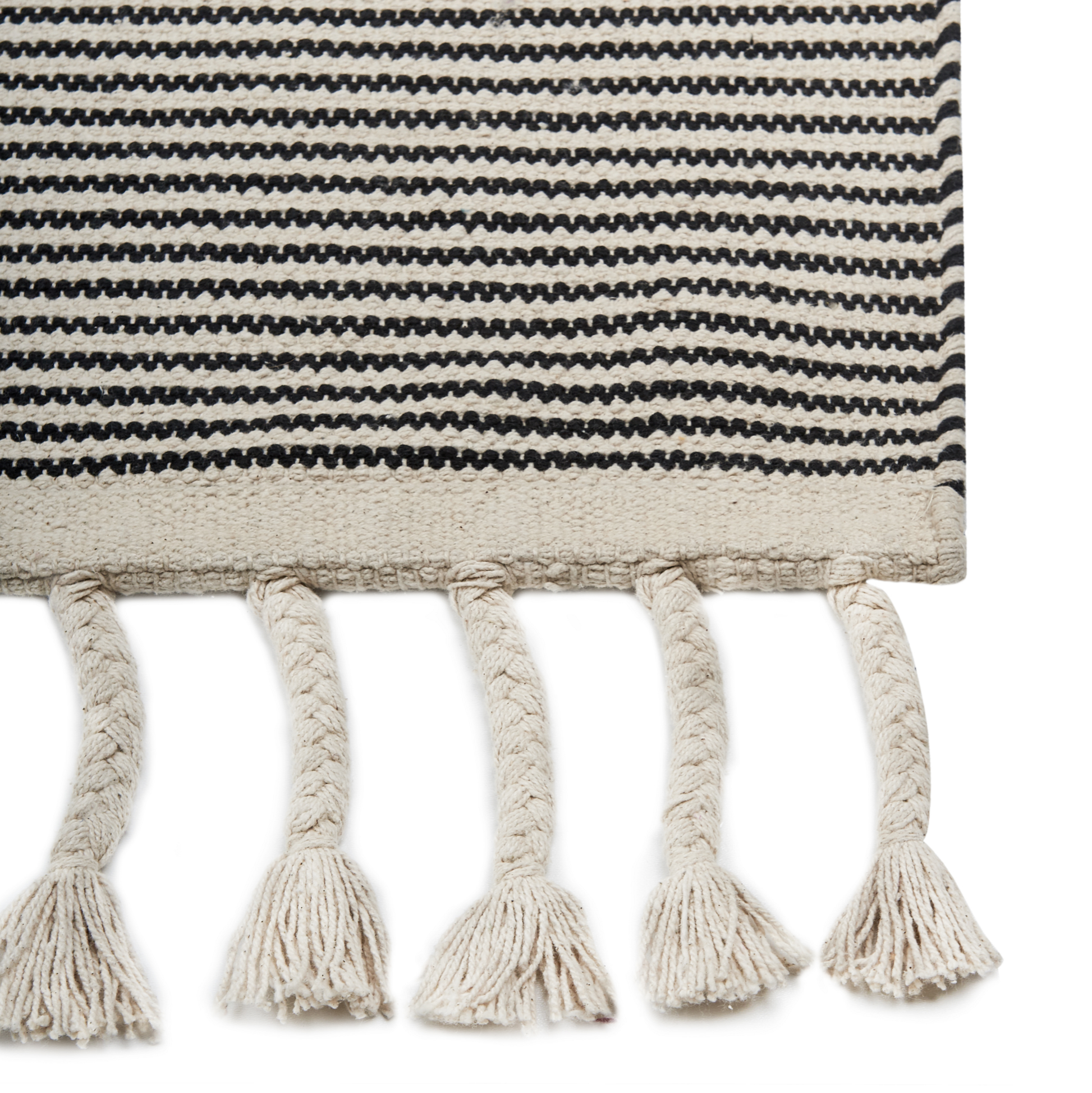 Dieser Teppich mit abstraktem Muster ist eine stilvolle Ergänzung für jedes moderne Wohnambiente. Aus hochwertiger Baumwolle gefertigt, ist er besonders weich und langlebig, sodass er sich problemlos in stark beanspruchte Bereiche legen lässt. Ausserdem verfügt der Teppich über Streifen und dekorative Fransen an den Seiten, die zu dem ausgefallenen Design beitragen. Die Kombination aus neutralem Beige und Schwarz macht diesen Teppich zu einem perfekten Ergänzungsteppich für helle Räumlichkeiten. Material: Baumwolle. Zusätzliches Material: Polyester. Material Zusammensetzung: 90% Baumwolle, 10% Polyester Gewicht: 7 Montage: Benötigt keine Montage Das Angebot beinhaltet: 1 x Teppich zusätzliche Information: Der Artikel könnte Haare verlieren. Dies ist ein normaler Vorgang und stellt keinen Qualitätsmangel des Produkts dar., Der Artikel benötigt einige Zeit, bis er seinen ursprünglichen Zustand erreicht hat – daher sollte er so schnell wie möglich ausgerollt werden und innerhalb von 72 Stunden seine vollständige Grösse wieder erreichen. Für einen optimalen Effekt sollte man die Teppichkanten mit schweren Gegenständen fixieren., Da jedes Produkt handgefertigt wird, kann es zu kleineren Abweichungen in der Farbe und der äusseren Struktur kommen. Diese Abweichungen stellen keinen Qualitätsmangel dar, sondern sind eine warentypische Eigenschaft., Herstellungstechnik: Beim Handtuftverfahren wird das Garn mit einer speziellen Nadel in das Trägermaterial des Teppichs eingestochen. Dabei wird das Garn nicht so fest in das Trägermaterial eingearbeitet wie bei anderen Methoden (z.B. Webteppiche). Daher können sich manchmal einzelne Fäden lösen. Gestalten: Rechteckig Breite: 160 Länge: 230 Art: Teppich Stil: Modern Allgemeine Farbe: Beige Muster: Abstraktes Muster Hauptmaterial: Baumwolle Dichte: 1750