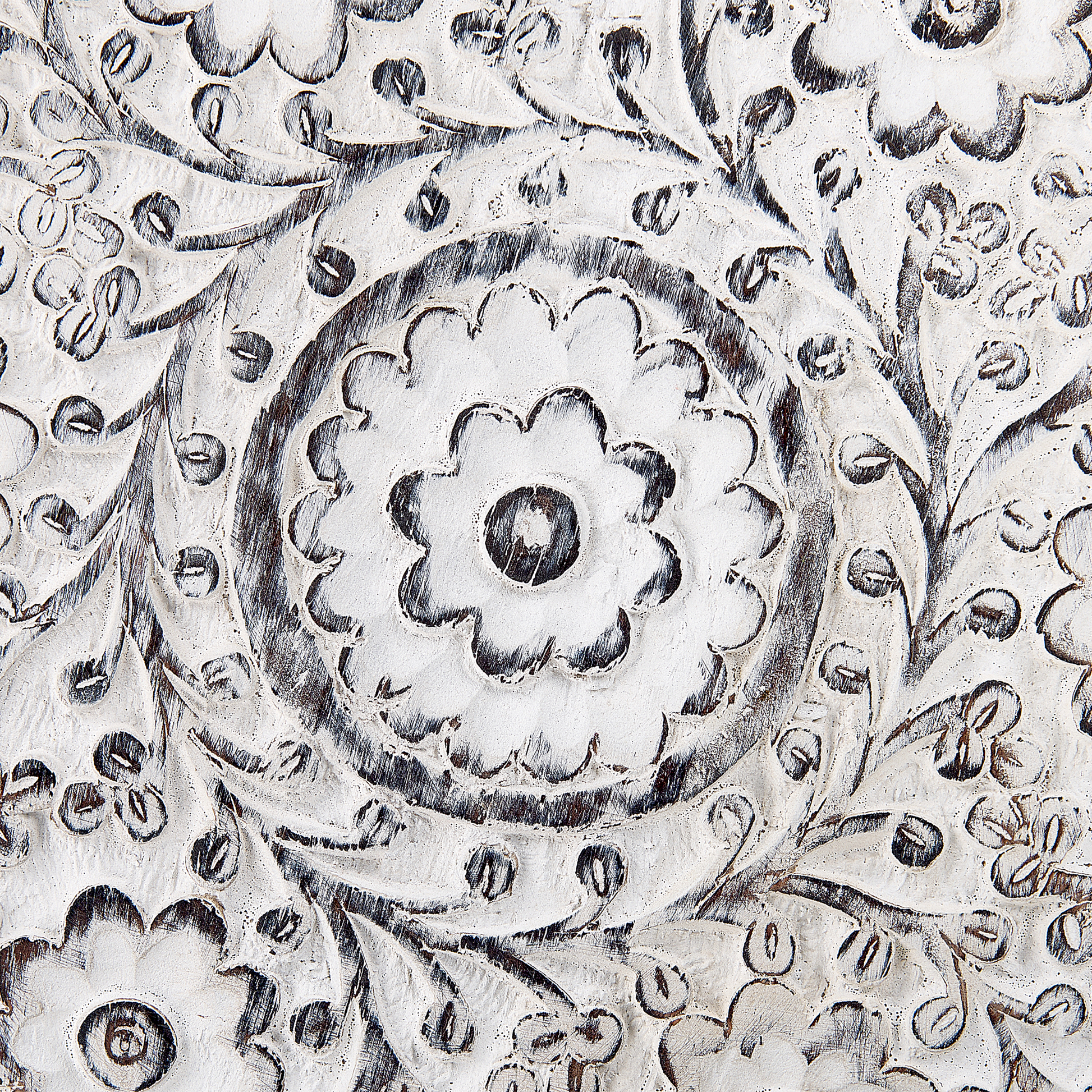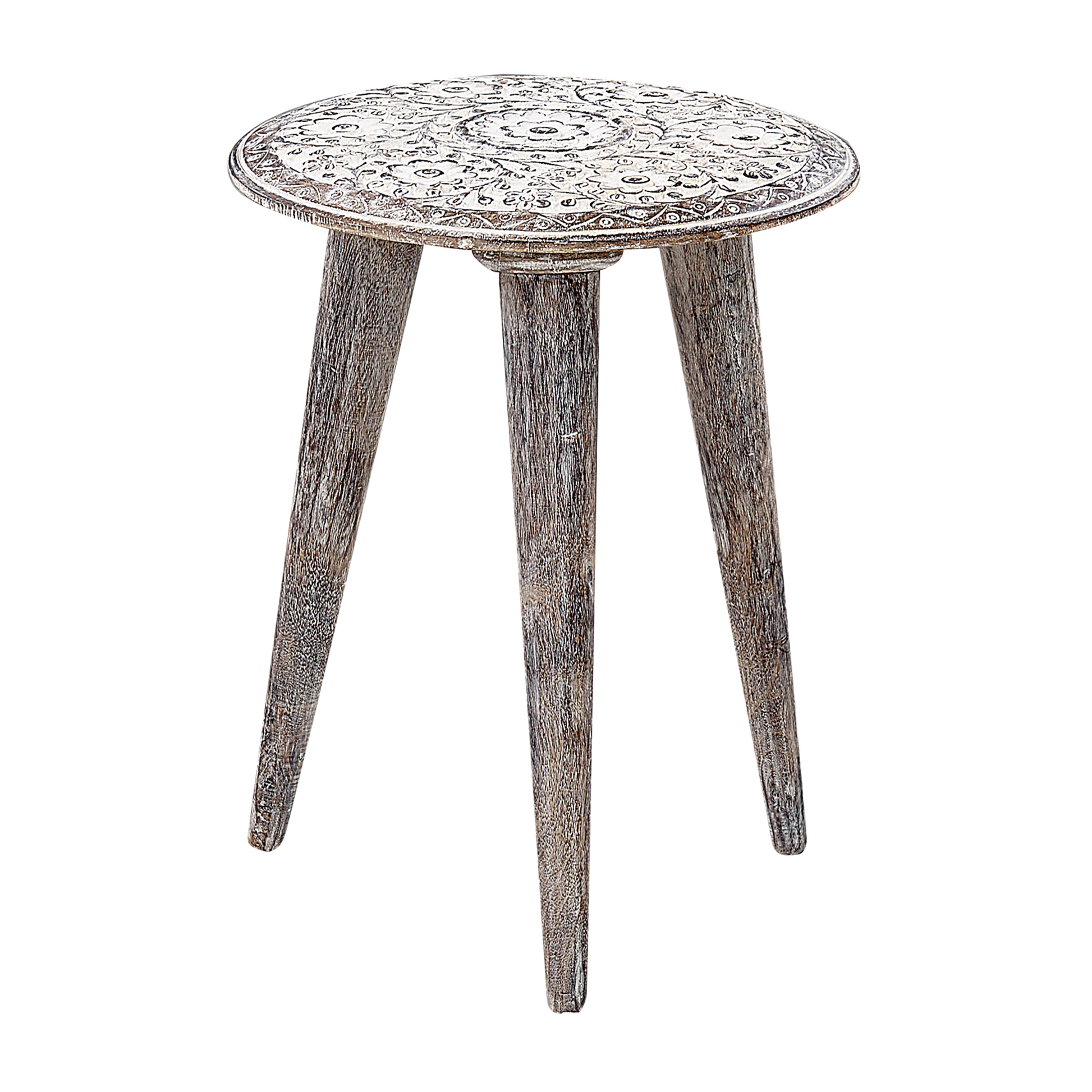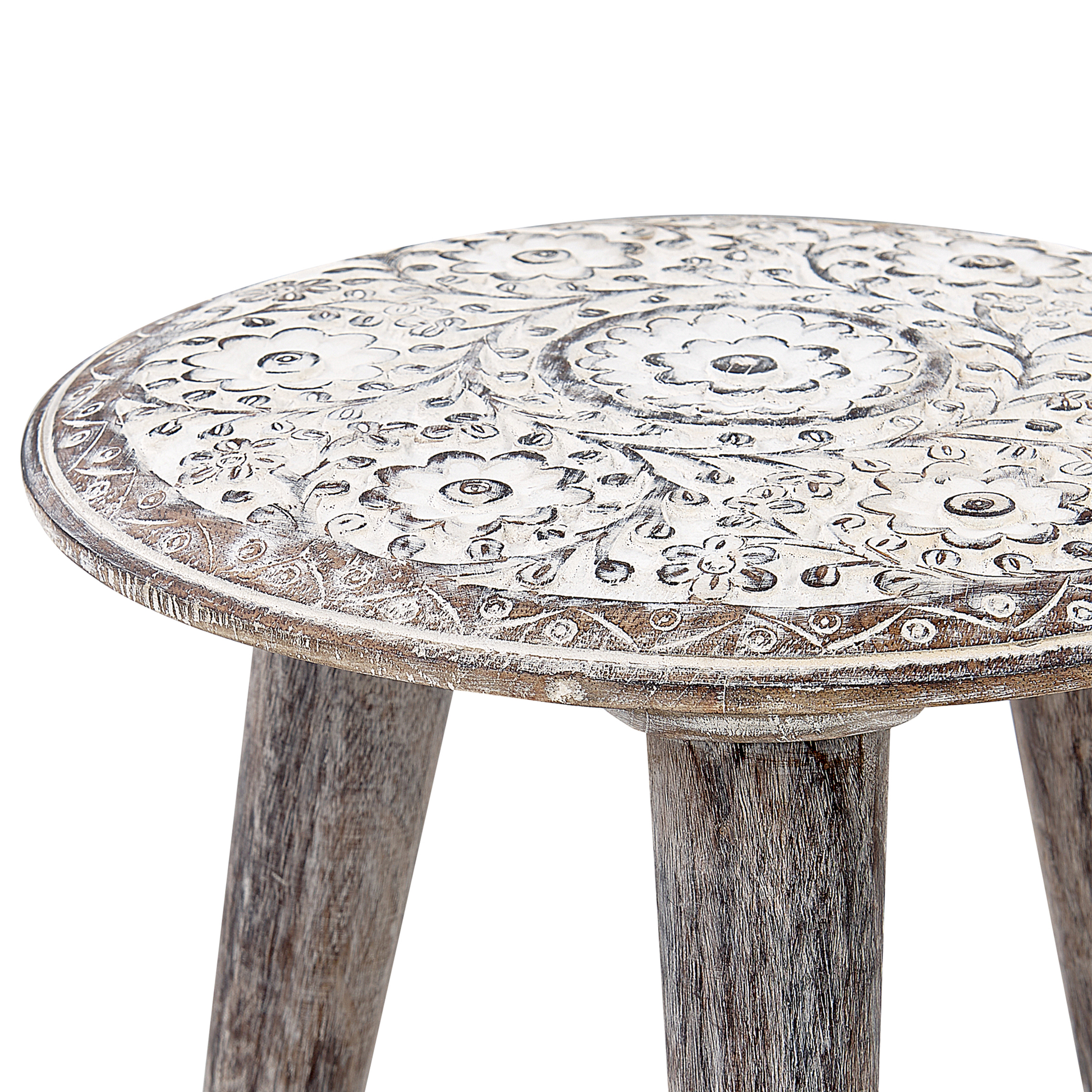 Mit diesen 2 Beistelltischen setzen Sie einen echten Vintage-Akzent. Es besteht aus Mangoholz, einem natürlichen und langlebigen Material, mit schlanken Beinen und runden Tischplatten mit geschnitztem Blumenmuster. Die Tische weisen einen gealterten Effekt auf, der jeder Einrichtung eine einzigartige Note verleiht. Material: Mango Holz. Gewicht: 5 Montage: Nicht montiert Holzart: Mangifera indica Holzursprung: Indien Gewichtskapazität: 15 Gesamtabmessungen: 46x46x53 Das Angebot beinhaltet: 2 x Beistelltisch zusätzliche Information: Holz ist ein Naturprodukt. Farb- und Strukturunterschiede, Narben, Falten und sonstige Naturmerkmale sind Echtheitsbeweise und keine zur Reklamation berechtigende Fehler., Der sichtbare Alterungseffekt, sowie jede Art von Verfärbung oder Abnutzung sind absichtlich und stellen keinen Qualitätsmangel des Produkts dar. Gestalten: Rund Art: Beistelltisch 2er Set Stil: Rustikal Allgemeine Farbe: Weiss Schatten: Cremeweiss Hauptmaterial: Mango Holz