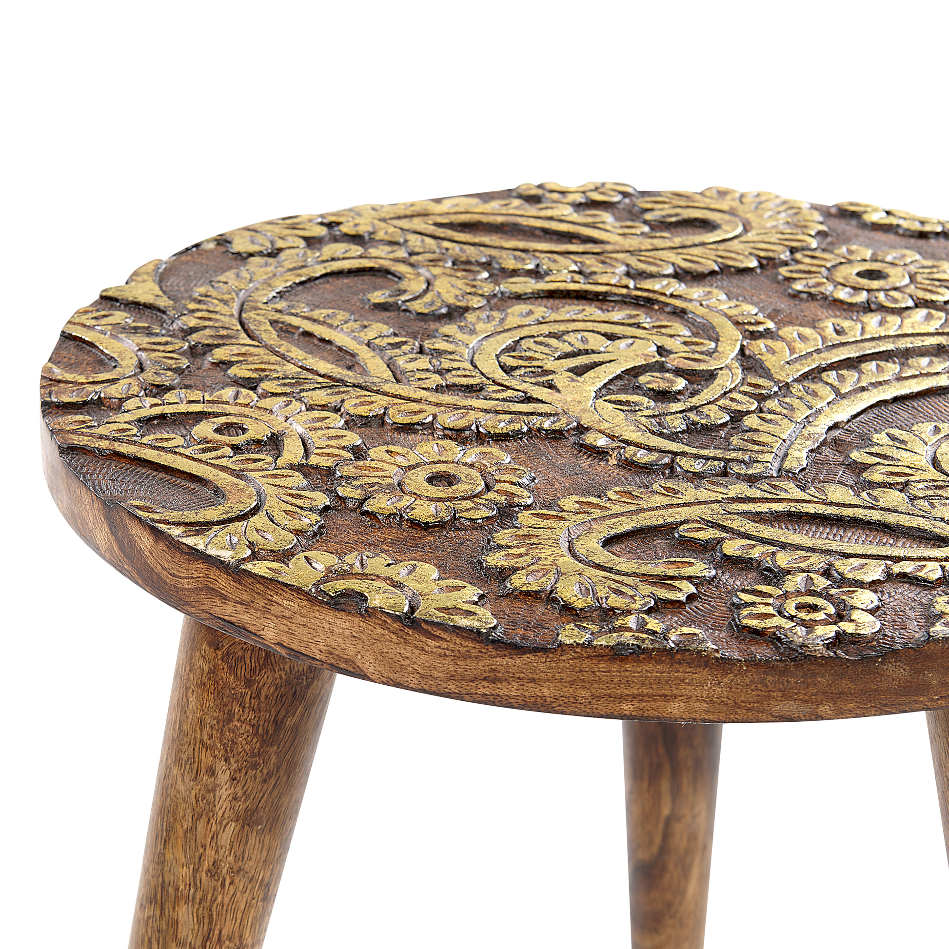Dekorieren Sie Ihren Wohnraum mit diesen Beistelltischen und freuen Sie sich auf zusätzlichen Platz, auf dem Sie Getränke oder Deko abstellen können. Beide Tische sind aus massivem Mangoholz gefertigt und halten auch bei minimaler Pflege viele Jahre lang. Die Tischplatten haben florale Verzierungen, die einen schönen Eyecatcher in Ihrem Zuhause darstellen. Dank des Designs sehen die Tische in Vintage-Räumen grossartig aus, passen aber auch in rustikale oder Boho-Wohnzimmer und Schlafzimmer. Material: Mango Holz. Gewicht: 5 Montage: Beine / Füsse nicht montiert Holzart: Mangifera indica Holzursprung: Indien Gewichtskapazität: 15 Gesamtabmessungen: 45x45x45 Das Angebot beinhaltet: 2 x Beistelltisch zusätzliche Information: Da jedes Produkt handgefertigt wird, kann es zu kleineren Abweichungen in der Farbe und der äusseren Struktur kommen. Diese Abweichungen stellen keinen Qualitätsmangel dar, sondern sind eine warentypische Eigenschaft., Der sichtbare Alterungseffekt, sowie jede Art von Verfärbung oder Abnutzung sind absichtlich und stellen keinen Qualitätsmangel des Produkts dar. Gestalten: Rund Art: Beistelltisch 2er Set Stil: Retro Allgemeine Farbe: Dunkler Holzfarbton Hauptmaterial: Mango Holz