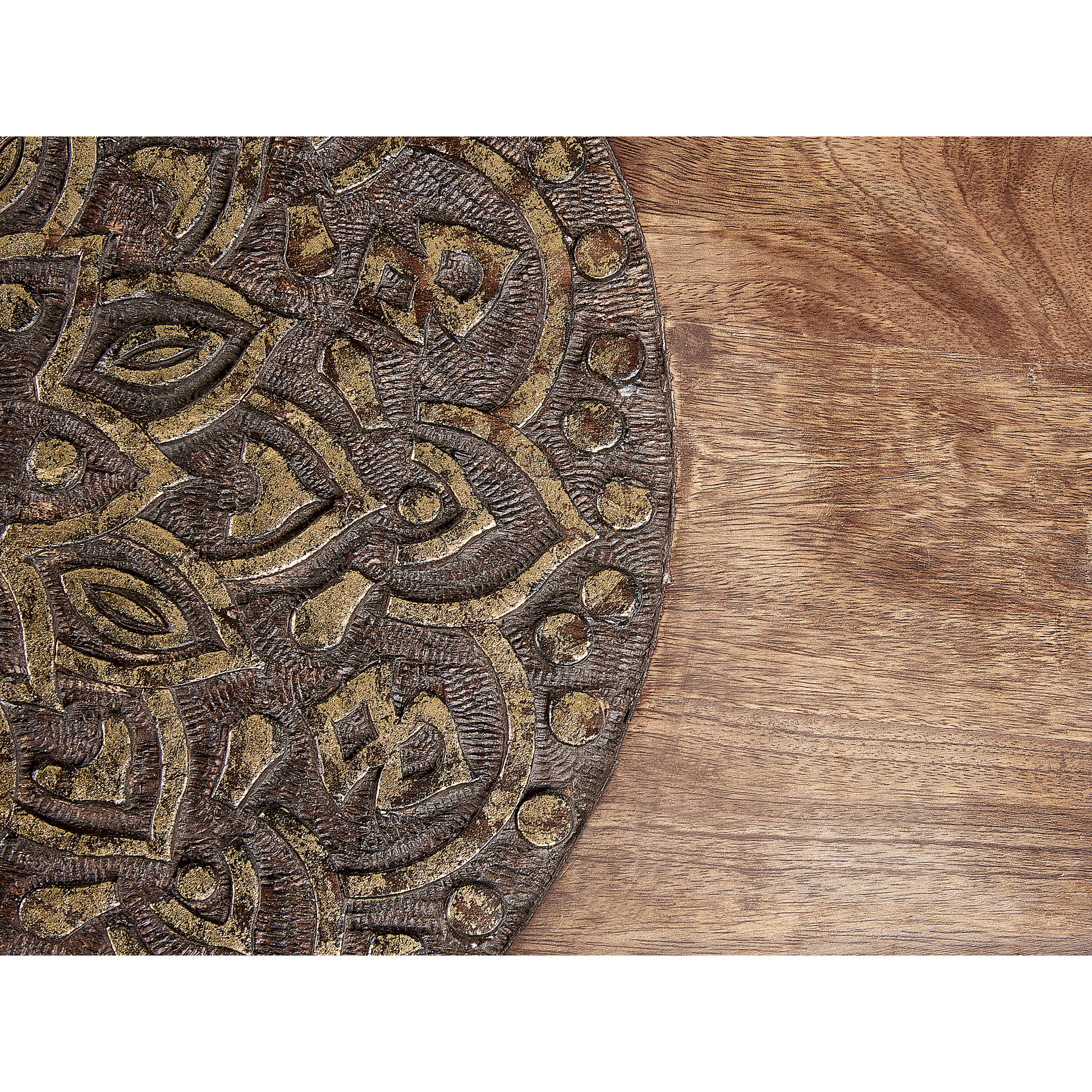 Unverwechselbares Design und florale Schnitzereien – das sind die Merkmale dieser Couchtische. Sie bestehen aus langlebigem, wachspoliertem und daher auch pflegeleichtem Mango Holz. Beide Couchtische sind dank der natürlichen Holzmaserung, den handgefertigten Kerbungen und den goldglänzenden Details auf der Tischplatte wahrhaftige Unikate. Die dreibeinigen Gestelle sorgen für angemessene Stabilität, die sich bei jedem Kaffeeplausch beweisen wird. Nutzen Sie sie als Wohnzimmer- oder Schlafzimmertische oder plazieren Sie die Tische im Flur, um eine zusätzliche Ablagefläche für Ihre Kleinigkeiten zu gewinnen. Material: Mango Holz. Gewicht: 5 Montage: Nicht montiert Holzart: Mangifera indica Holzursprung: Indien Gewichtskapazität: 13 Gesamtabmessungen: 54x54x52 Das Angebot beinhaltet: 2 x Beistelltisch zusätzliche Information: Da jedes Produkt handgefertigt wird, kann es zu kleineren Abweichungen in der Farbe und der äusseren Struktur kommen. Diese Abweichungen stellen keinen Qualitätsmangel dar, sondern sind eine warentypische Eigenschaft., Der sichtbare Alterungseffekt, sowie jede Art von Verfärbung oder Abnutzung sind absichtlich und stellen keinen Qualitätsmangel des Produkts dar. Gestalten: Oval Art: Beistelltisch 2er Set Stil: Klassisch Allgemeine Farbe: Dunkler Holzfarbton Hauptmaterial: Mango Holz