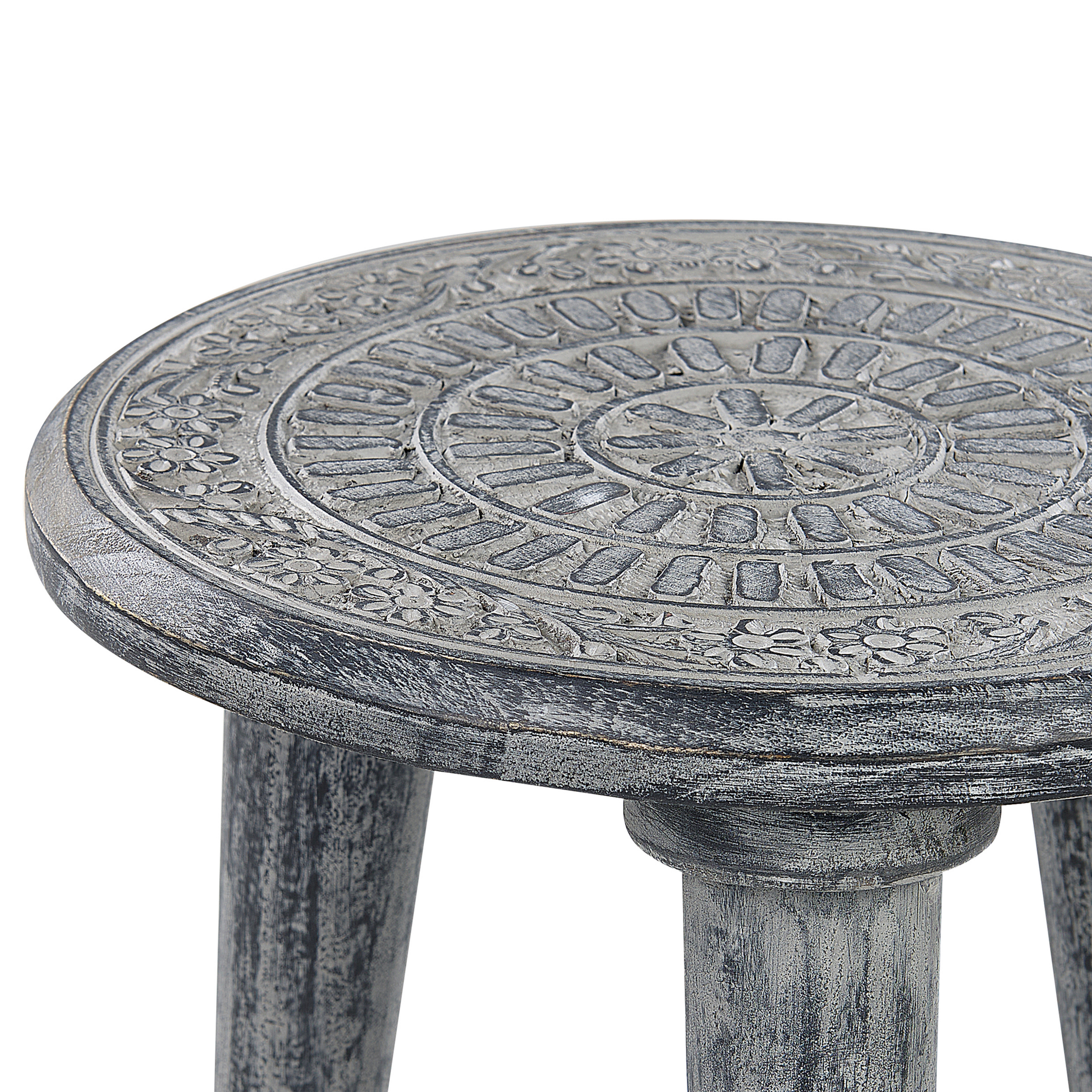 Mit diesem Set aus zwei Beistelltischen wird Ihre Einrichtung noch schöner. Dank der Grautöne mit Antik-Effekt ist es die perfekte Ergänzung für jedes Wohnzimmer im traditionellen und Vintage-Stil. Die Beistelltische sind aus hochwertigem Mangoholz handgefertigt und mit einem auffälligen Muster verziert. Material: Mango Holz. Gewicht: 5 Montage: Beine / Füsse nicht montiert Holzart: Mangifera indica Holzursprung: Indien Gewichtskapazität: 15 Gesamtabmessungen: 45x45x53 Das Angebot beinhaltet: 2 x Beistelltisch zusätzliche Information: Jeder Artikel ist ein handgefertigtes Unikat; Farbschattierung und Muster können daher vom Foto abweichen., Der sichtbare Alterungseffekt, sowie jede Art von Verfärbung oder Abnutzung sind absichtlich und stellen keinen Qualitätsmangel des Produkts dar. Gestalten: Rund Art: Beistelltisch 2er Set Stil: Retro Allgemeine Farbe: Grau Schatten: Hellgrau Hauptmaterial: Mango Holz