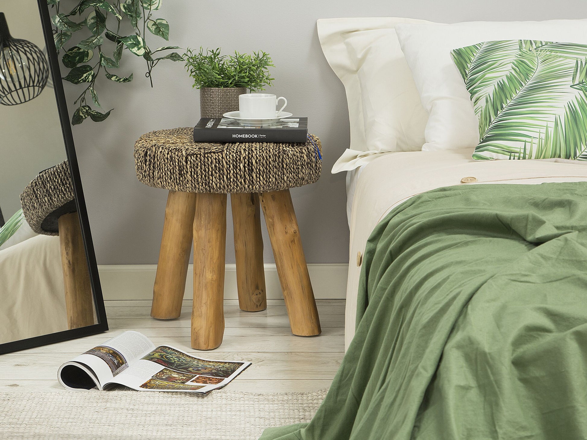 Der handliche, vielseitige Beistelltisch stellt mit seinen stabilen, naturfarbenen Beinen aus Teakholz ein wahres Unikat dar. Die runde Tischplatte kann als praktische Abstellfläche genutzt werden und ist mit robusten Schnüren aus Seegras überzogen, die ein charakteristisches geflochtenes Muster kreieren. Eignet sich hervorragend zur individuellen Gestaltung Ihrer vier Wände.  Material: Teakholz. Zusätzliches Material: Seegras.  Gewicht: 9 Montage: Benötigt keine Montage Holzart: Tectona grandis Holzursprung: Indonesien Gewichtskapazität: 10 Beine Höhe: 36 Das Angebot beinhaltet: 1 x Beistelltisch Höhe: 46 Gestalten: Rund Breite: 44 Länge: 44 Art: Beistelltisch Stil: Boho Allgemeine Farbe: Heller Holzfarbton Schatten: Hellbraun Hauptmaterial: Teakholz