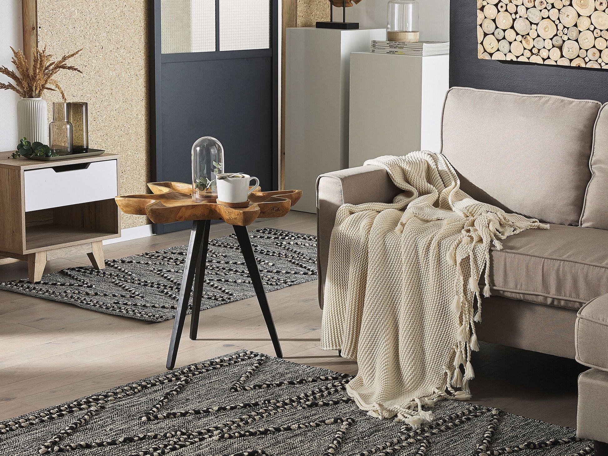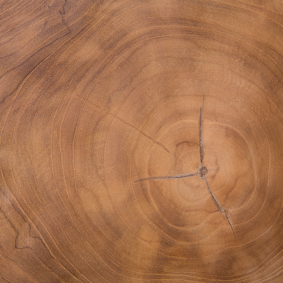 Die gerade Form der Tischbeine aus kühlem Metall kontrastiert wunderbar mit der organischen, geschwungenen Form der Tischplatte aus Teakholz in einem warmen Braunton. Die sichtbare Maserung des Holzes und die ausgefallene Formgebung lassen diesen Tisch zu einem ausgefallenen Designerstück werden. Die abgerundete Vertiefung in der Holzplatte macht das Modell zu einem idealen und sicheren Aufbewahrungsort für Ihr Handy, Schlüssel, Stifte und andere Kleinigkeiten – dank des erhöhten Randes kann hier nichts runterfallen. Material: Teakholz. Zusätzliches Material: Edelstahl. Gewicht: 8 Montage: Teilweise montiert Holzart: Tectona grandis Holzursprung: Indonesien Beine Höhe: 45 Das Angebot beinhaltet: 1 x Couchtisch Höhe: 51 zusätzliche Information: Bitte beachten Sie, dass jedes Produkt handgefertigt ist. Deshalb kann der Farbton und die Grösse leicht von dem Bild abweichen. Gestalten: Unregelmässig Breite: 56 Länge: 60 Art: Beistelltisch Stil: Retro Allgemeine Farbe: Heller Holzfarbton Hauptmaterial: Teakholz
