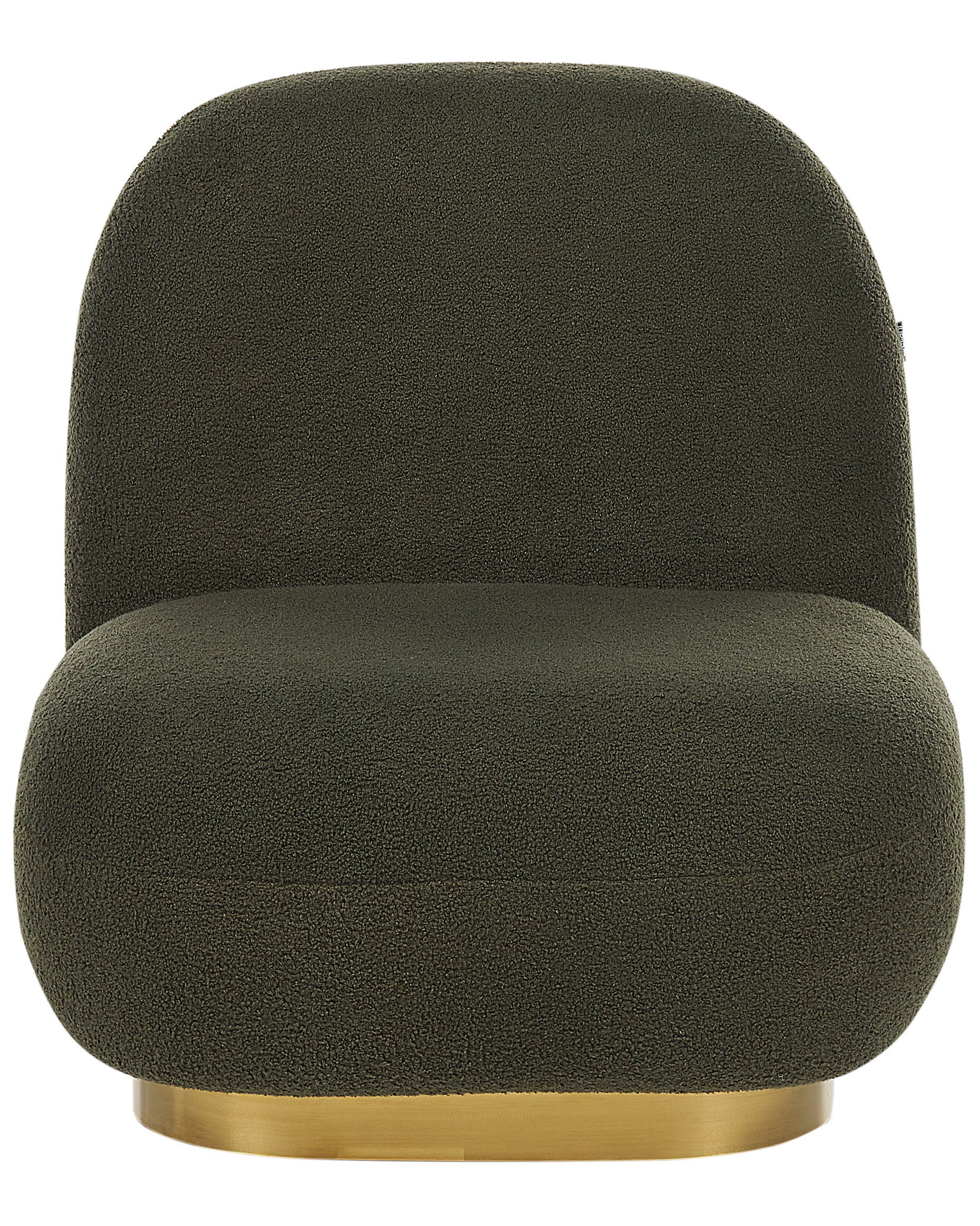 Dieser moderne Sessel besticht durch sein edles Design. Die runde Form und der quadratische, goldene Sockel machen den Sessel zu einem einzigartigen Eyecatcher in jedem Raum. Der Sessel ist mit Bouclé-Stoff gepolstert, einem weichen und doch robusten Material, das jahrelangem Gebrauch standhält, ohne dabei seine schöne Struktur und Farbe zu verlieren. Das goldene, quadratische Gestell ergänzt das gesamte Design, setzt einen glamourösen Akzent und verleiht der Konstruktion gleichzeitig Stabilität. Kombinieren Sie diesen Sessel mit anderen eleganten Möbeln und Wohnaccessoires in hellen Tönen, um eine moderne Einrichtung zu schaffen.   Material: Bouclé. Zusätzliches Material: Eisen, Eukalyptus.  Material Zusammensetzung: 100% Polyester Gewicht: 18 Montage: Benötigt keine Montage Holzart: Eucalyptus Globulus Holzursprung: China Gewichtskapazität: 150 Polsterstärke: 33 Sitzhöhe: 38 Das Angebot beinhaltet: 1 x Sessel Sitzfläche: 68x58 Höhe: 76 Breite: 62 Tiefe: 70 Art: Sessel Stil: Glamourös Allgemeine Farbe: Grün Schatten: Dunkelgrün Muster: Ohne Muster Hauptmaterial: Bouclé Füllmaterial: Schaumstoff Arm Stil: Ohne Armlehnen