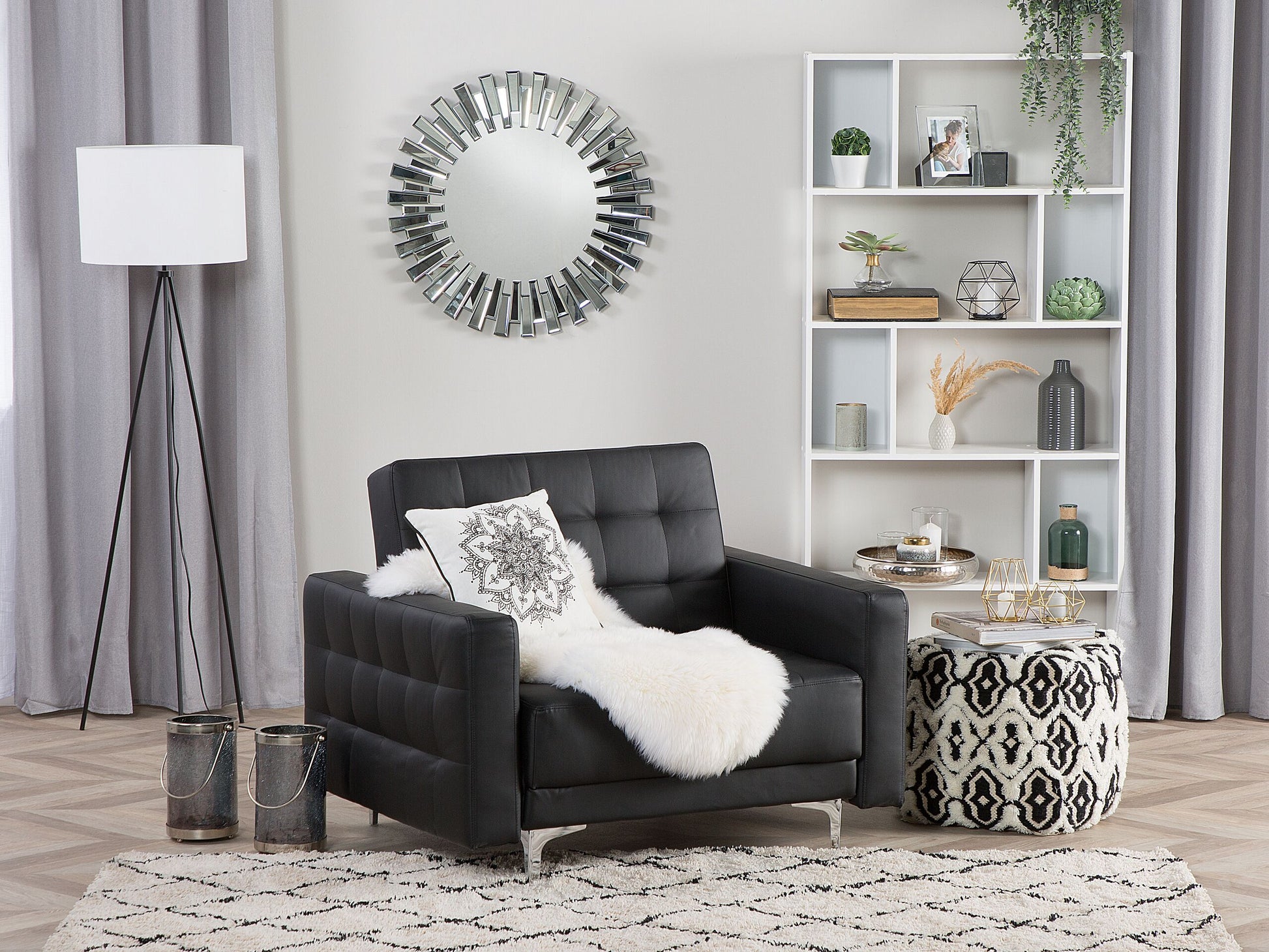 Dieser bequeme Sessel mit gestepptem Bezugsstoff ist dank seiner modernen, schlichten Form ein absoluter Blickfang und verleiht jedem Wohnzimmer eine gemütliche und geräumige Atmosphäre. Er kann sowohl einzeln aufgestellt werden als auch in Kombination mit weiteren Modulelementen dieser Serie. Material: Kunstleder. Zusätzliches Material: Metall, Eukalyptus. Material Zusammensetzung: 100% Polyester Gewicht: 33 Montage: Teilweise montiert Holzart: Eucalyptus Globulus Holzursprung: China Gewichtskapazität: 150 Polsterstärke: 20 Sitzhöhe: 41 Das Angebot beinhaltet: 1 x Sessel Sitzfläche: 80x60 Höhe: 83 zusätzliche Information: Damit die beste Benutzerfreundlichkeit gewährleistet wird, sollte der Abstand zwischen der Rückenlehne und der Wand ca. 15 cm betragen., Um sicherzustellen, dass die Konstruktion stabil und die Nutzungssicherheit gewährleistet ist, sollte man 2 Wochen nach dem Zusammenbau überprüfen, ob die Ware auch korrekt montiert wurde. Ausserdem ist alle 3 Monate zu prüfen, ob die Schrauben richtig festgezogen sind. Breite: 106 Tiefe: 88 Art: Sessel Stil: Modern Allgemeine Farbe: Schwarz Muster: Ohne Muster Hauptmaterial: Kunstleder Füllmaterial: Schaumstoff Arm Stil: Gerade