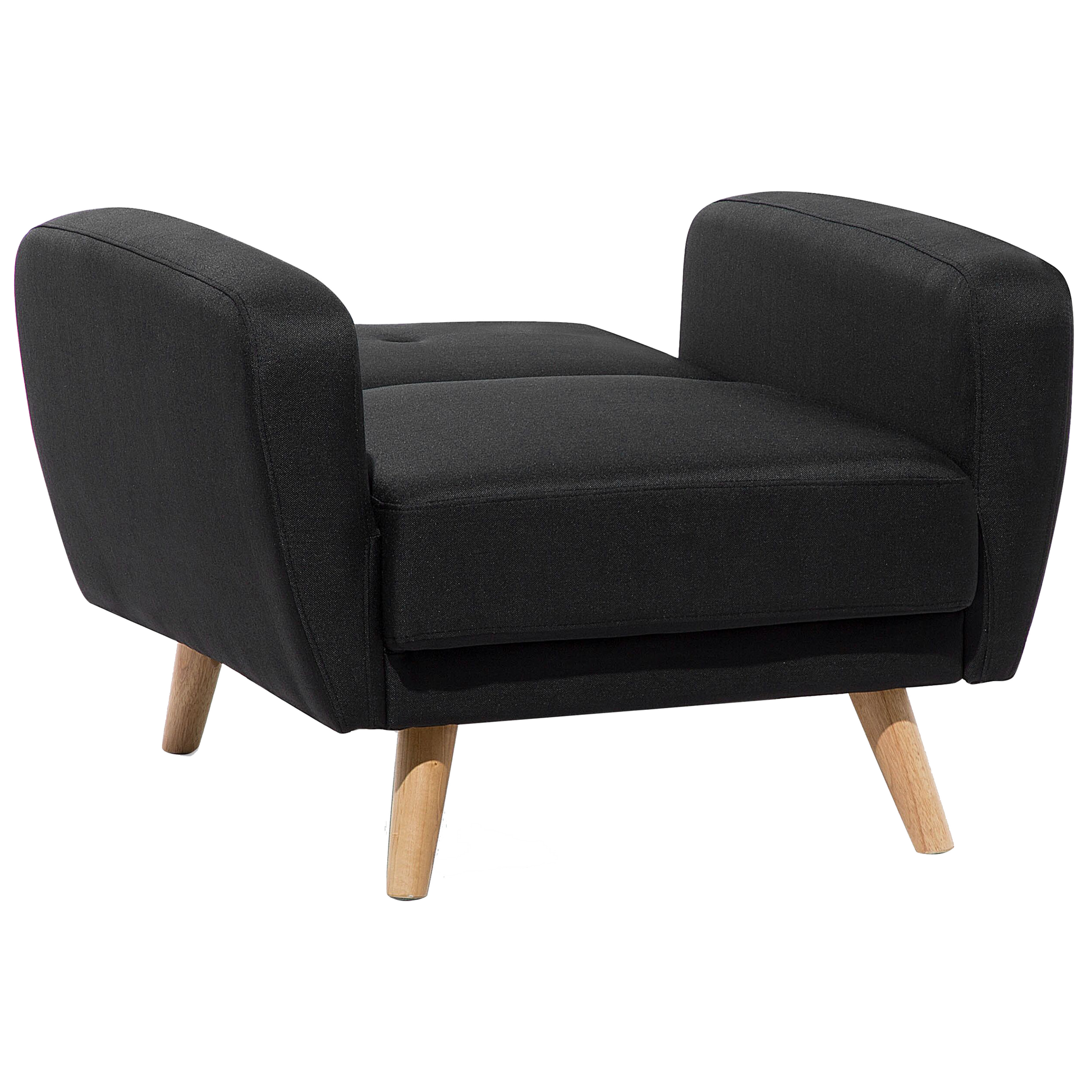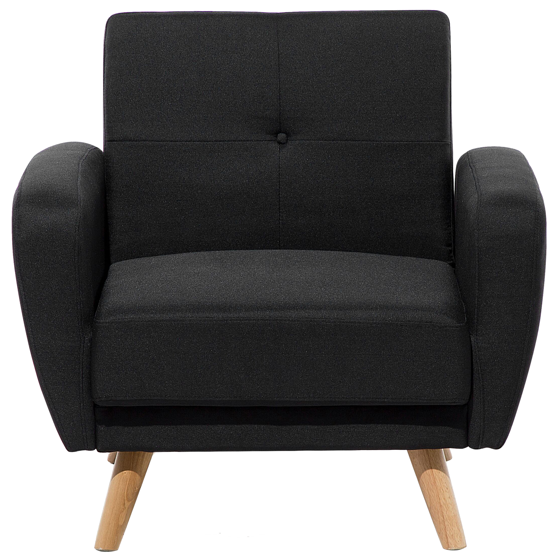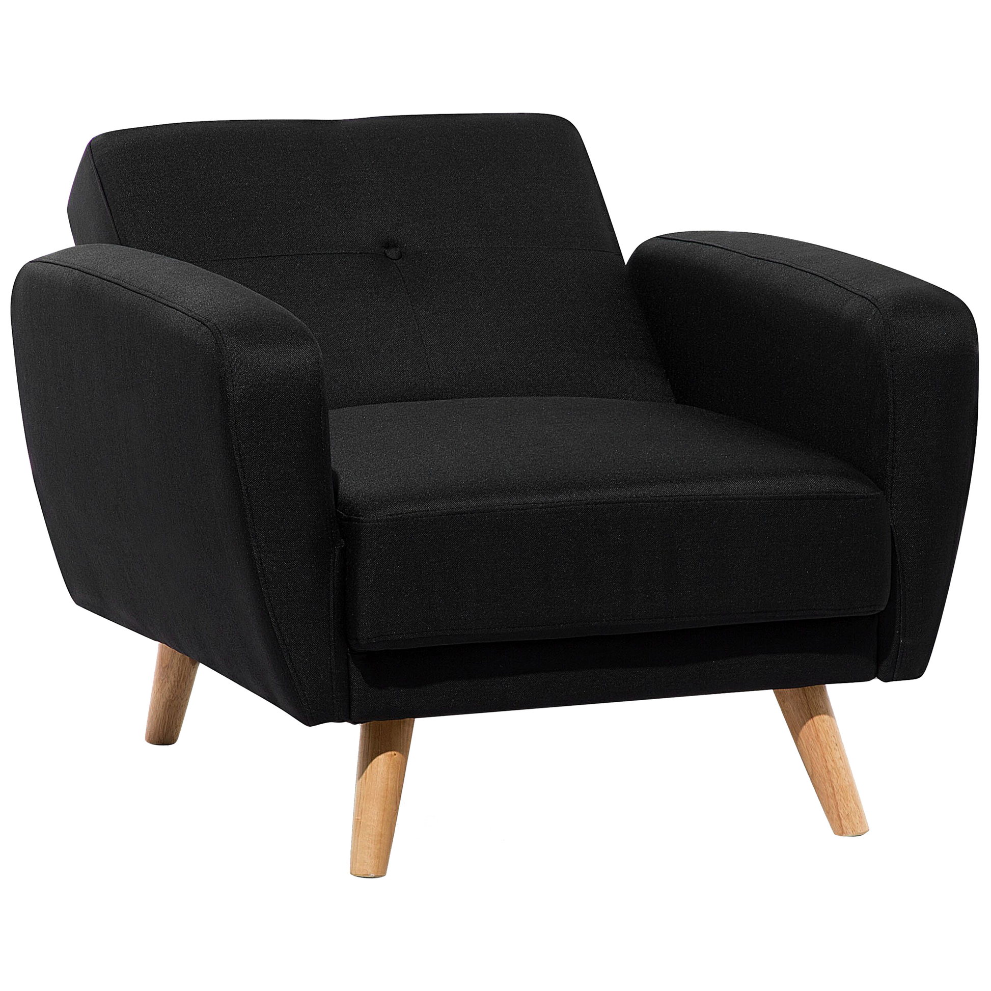 Dieser stilvolle Polstersessel vereint den beliebten Retro Stil mit optimalem Sitzkomfort. Die hohen Armlehnen sowie die schräge Rückenlehne sind in einer angenehmen Komforthöhe gehalten und sorgen für ein bequemes Sitzgefühl. Der strapazierfähige Stoffbezug und die Knopfheftung runden das trendy Design ab, während die hellen Holzbeine Stabilität versprechen. Für besondere Funktionalität sorgt die klappbare Rückenlehne. Material: Polyester. Zusätzliches Material: Gummibaumholz. Material Zusammensetzung: 100% Polyester Gewicht: 24 Montage: Teilweise montiert Holzart: Hevea brasiliensis Holzursprung: China Gewichtskapazität: 150 Polsterstärke: 15 Sitzhöhe: 41 Das Angebot beinhaltet: 1 x Sessel Sitzfläche: 63x59 Höhe: 82 zusätzliche Information: Die Beine befinden sich in einer praktischen Tasche unter dem Sitz., Um sicherzustellen, dass die Konstruktion stabil und die Nutzungssicherheit gewährleistet ist, sollte man 2 Wochen nach dem Zusammenbau überprüfen, ob die Ware auch korrekt montiert wurde. Ausserdem ist alle 3 Monate zu prüfen, ob die Schrauben richtig festgezogen sind. Breite: 89 Tiefe: 85 Art: Fernsehsessel Stil: Retro Allgemeine Farbe: Schwarz Muster: Ohne Muster Hauptmaterial: Polyester Füllmaterial: Schaumstoff Arm Stil: Gerade